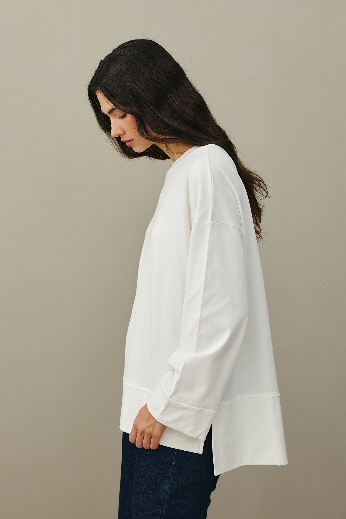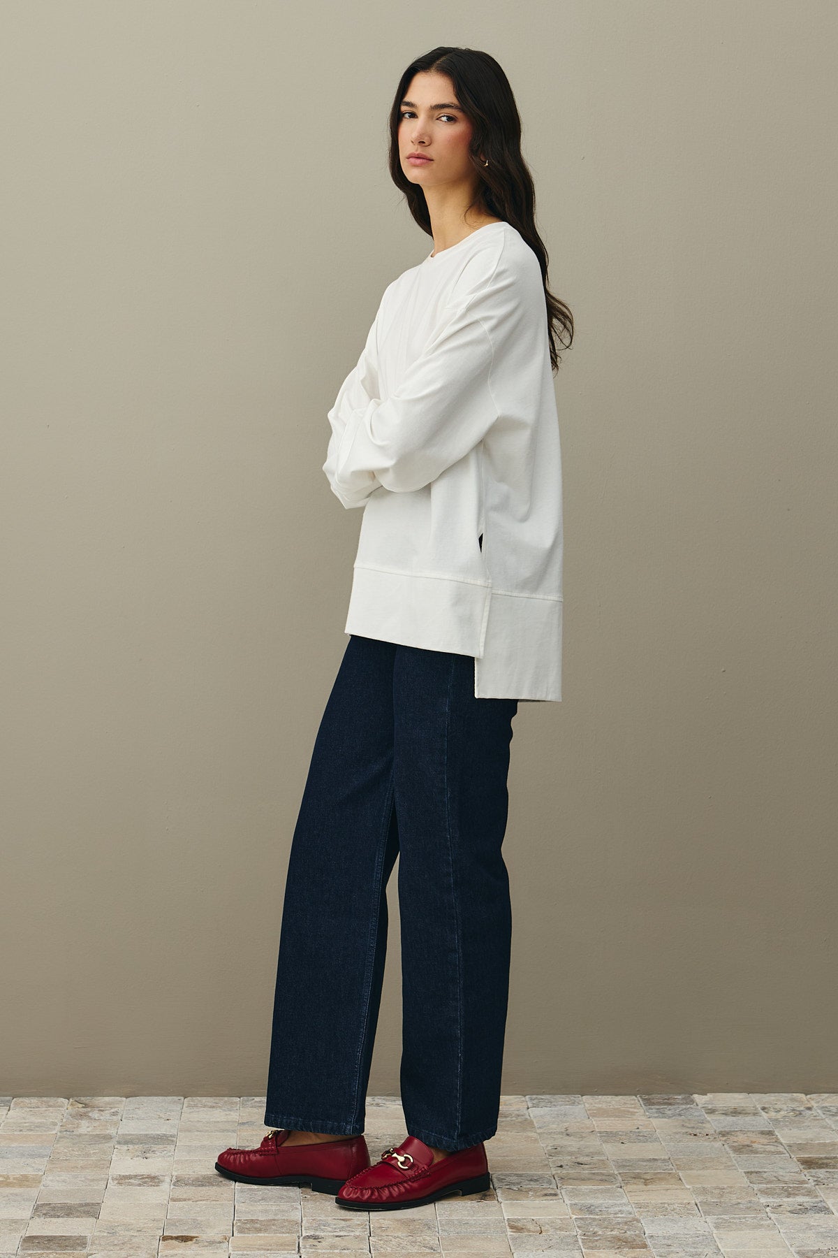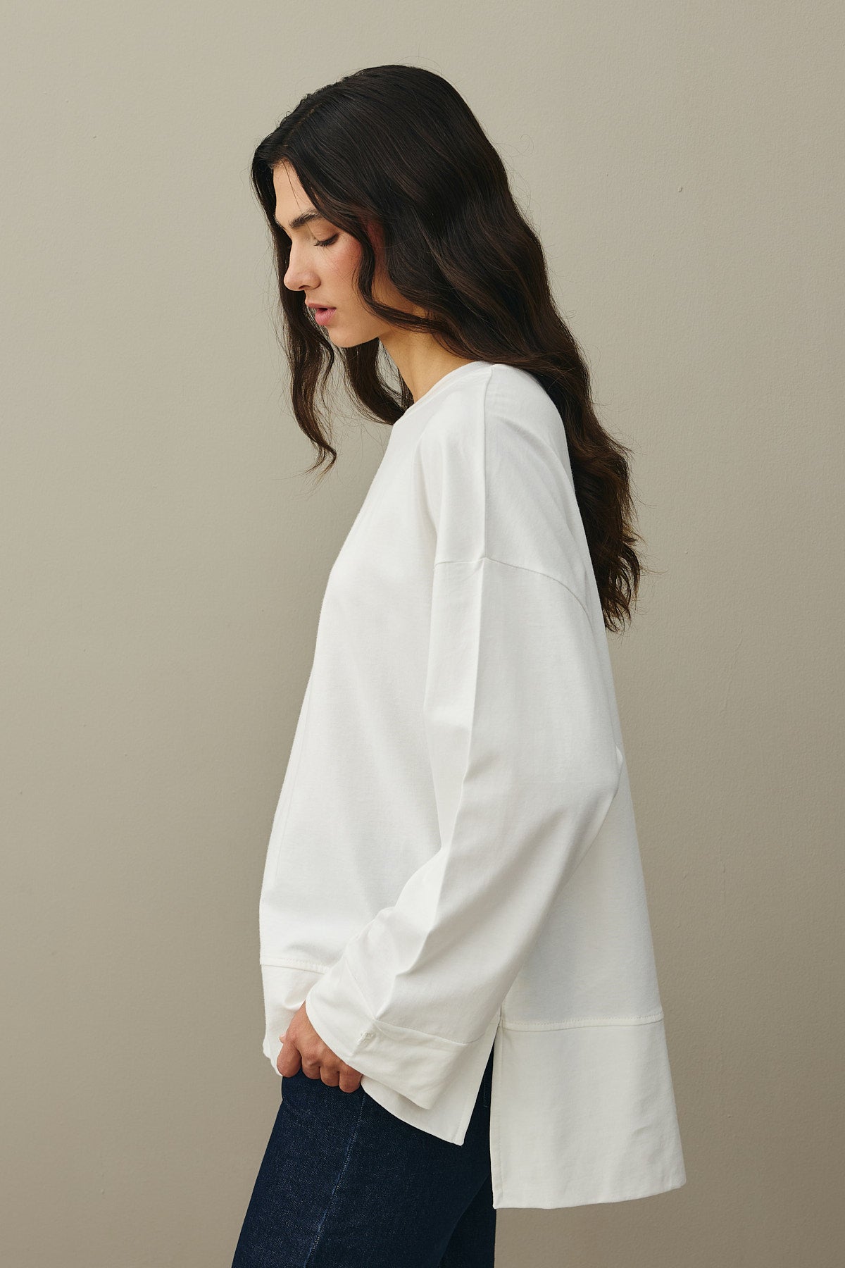 %100 pamuk örme kumaştan, bisiklet yakalı, etek ucu kalın katlama detaylı, uzun kollu, yırtmaç detaylı rahat sweatshirt 1(36-38)Beden: Uzunluk:72 cm, Arkasının uzunluğu: 76 cm, Kol Uzunluğu:50 cm , İki Omuz Arası Mesafe: 64 cm , Göğüs:60 cm, Bel :58 cm. 2(40-42)Beden: Uzunluk:74 cm, Arkasının uzunluğu: 78 cm, Kol Uzunluğu:52 cm , İki Omuz Arası Mesafe: 66 cm , Göğüs:62 cm, Bel :60 cm.