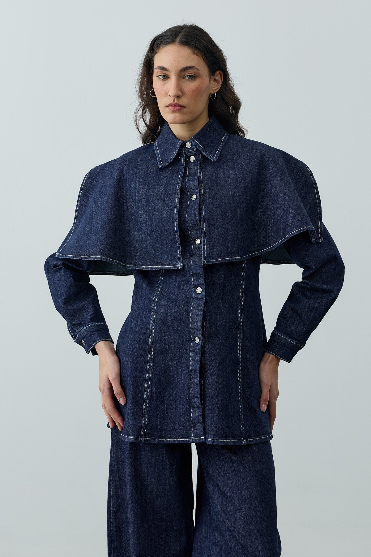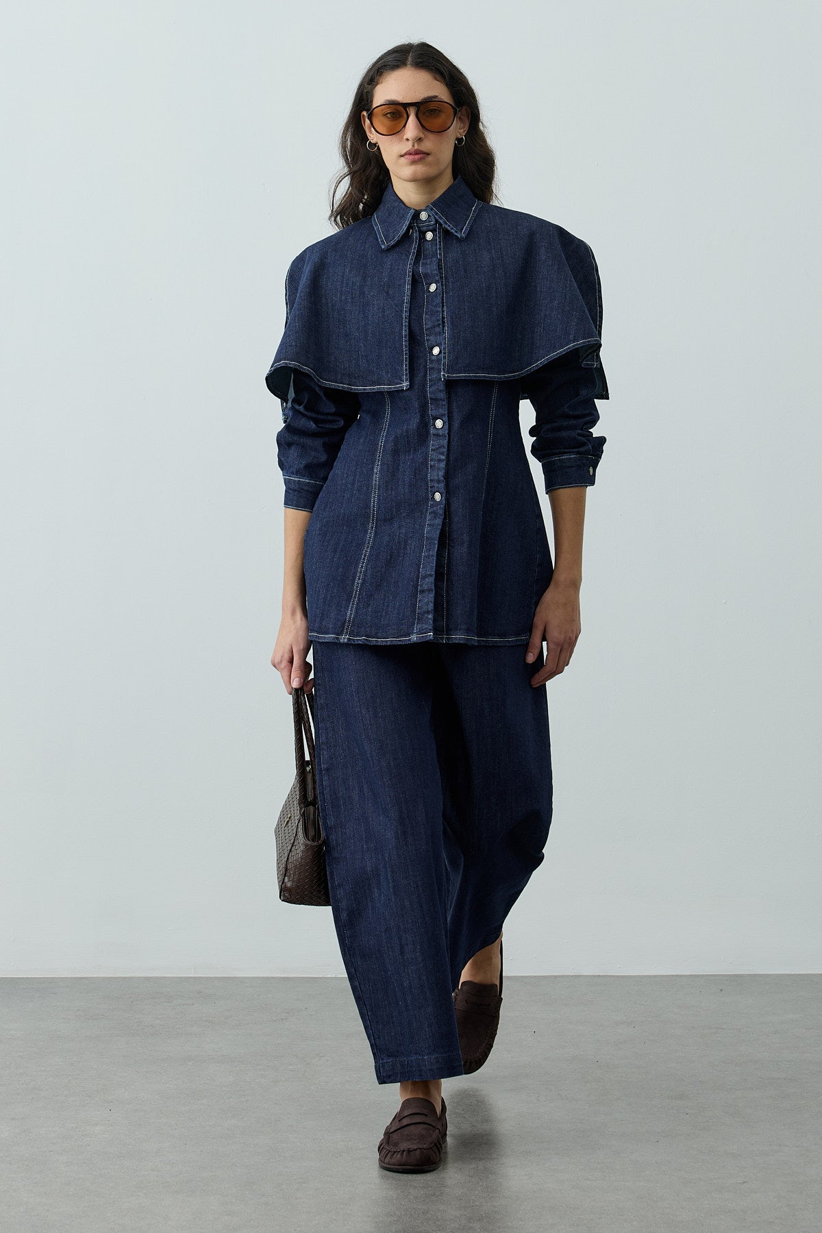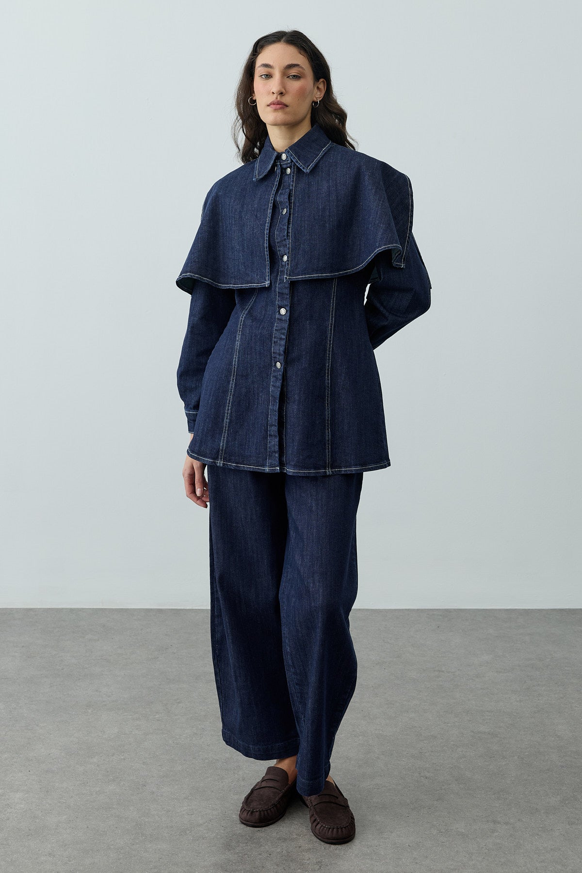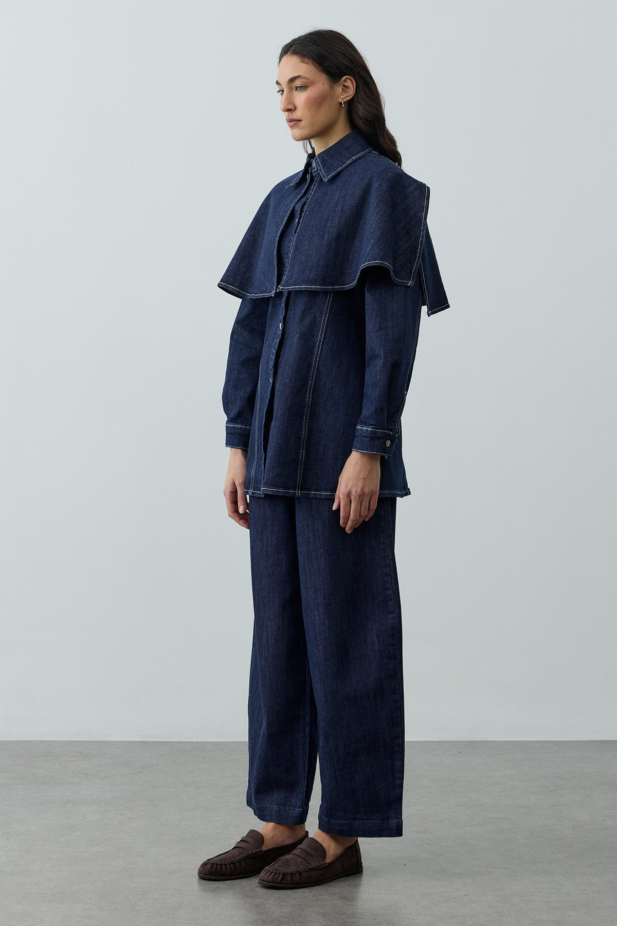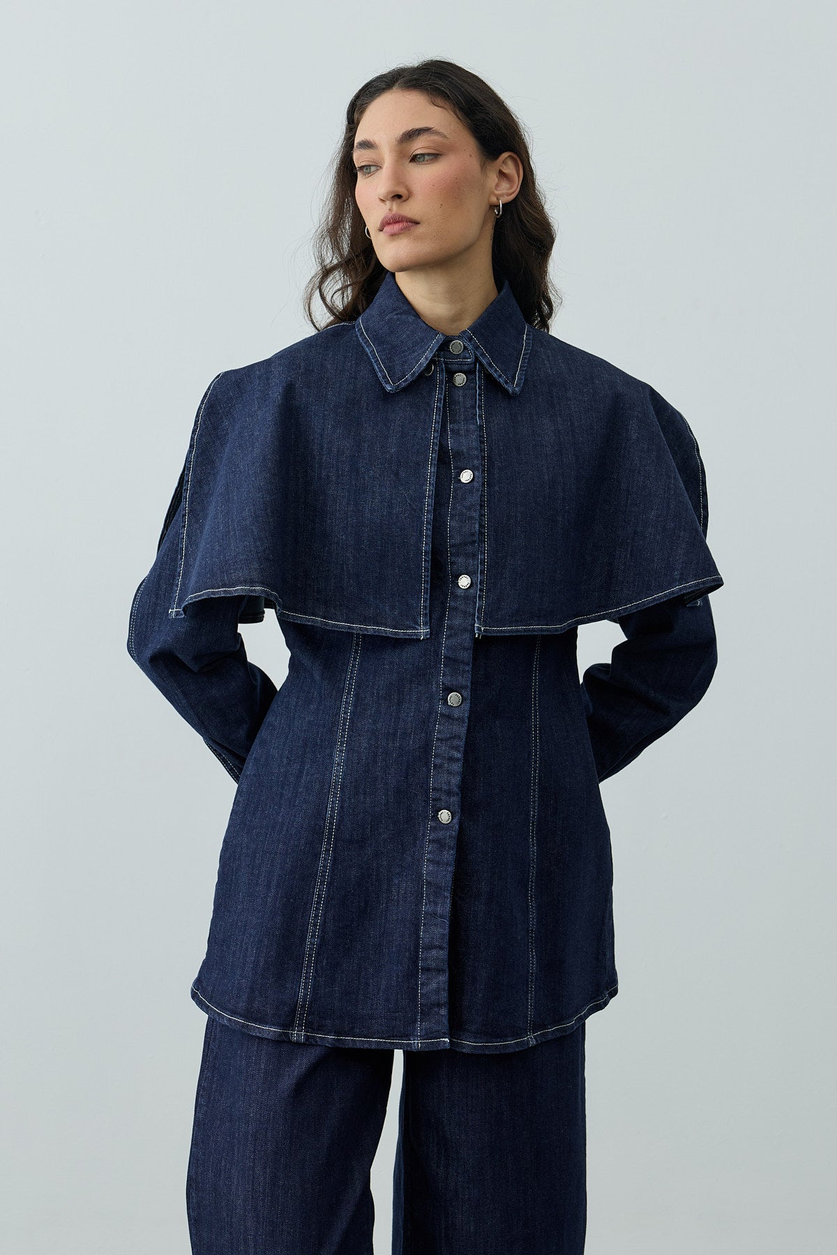 Pelerin Detaylı Denim Gömlek Ceket Lacivert