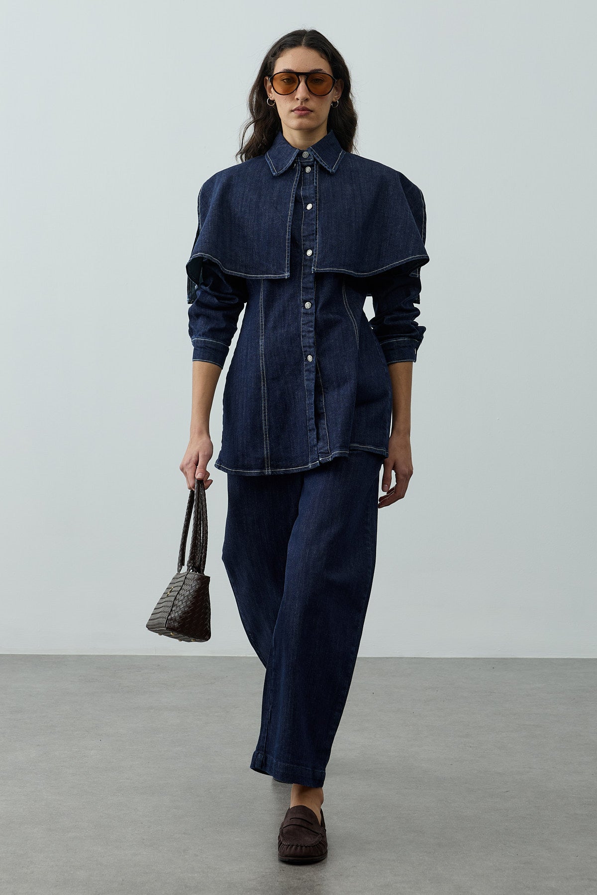 Denim dokuma kumaştan, gömlek yakalı, manşetli uzun kollu, seyyar pelerin detaylı, pensli kesim gömlek ceket.