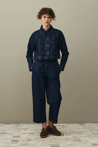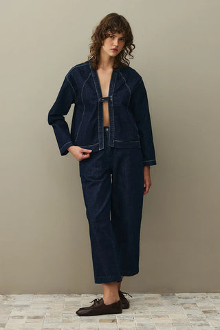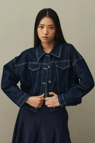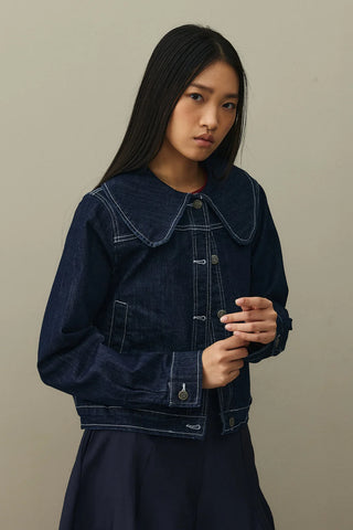 Yuvarlak Yakalı Denim Ceket Koyu Mavi