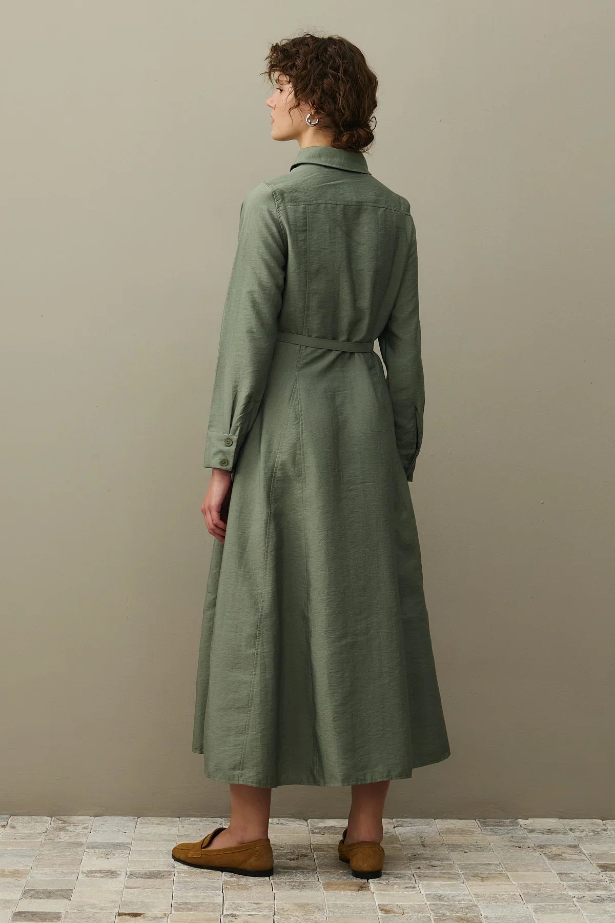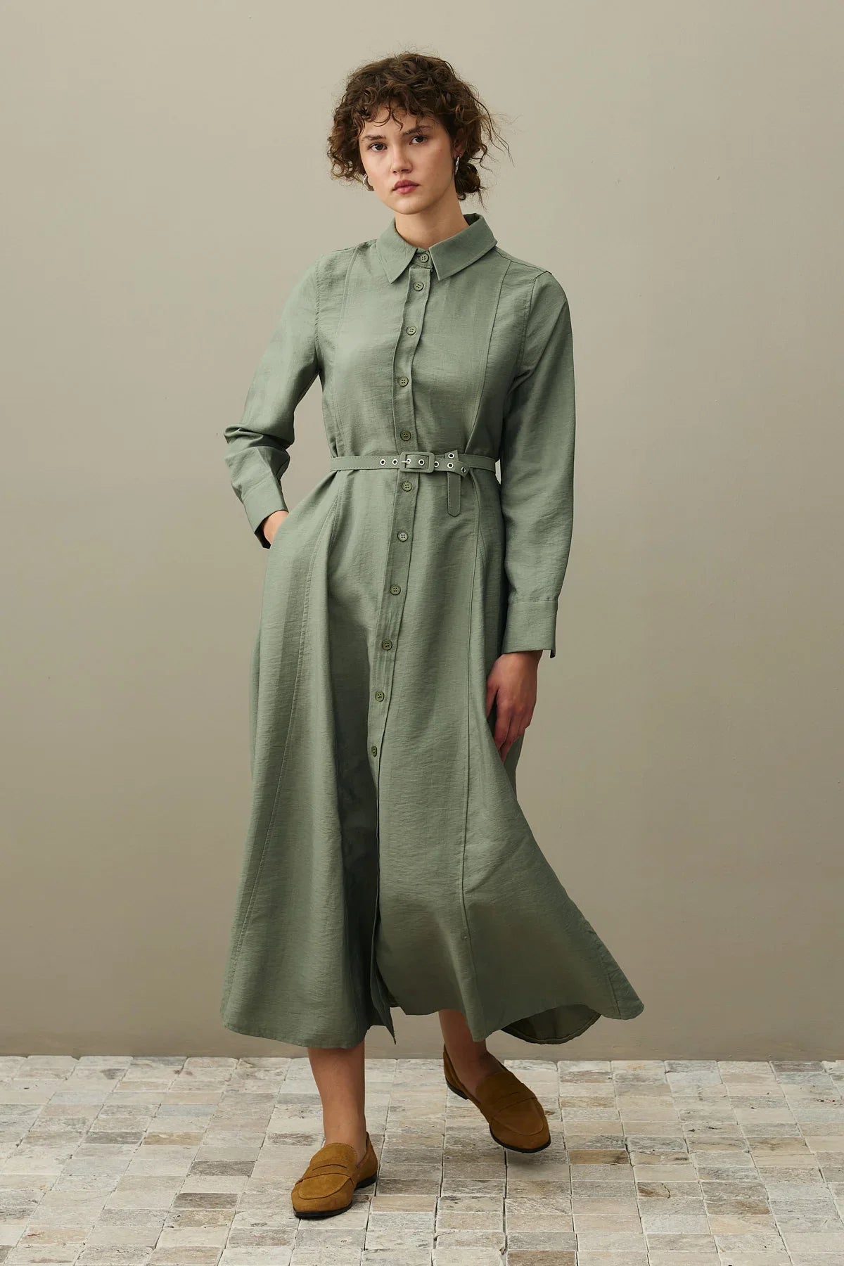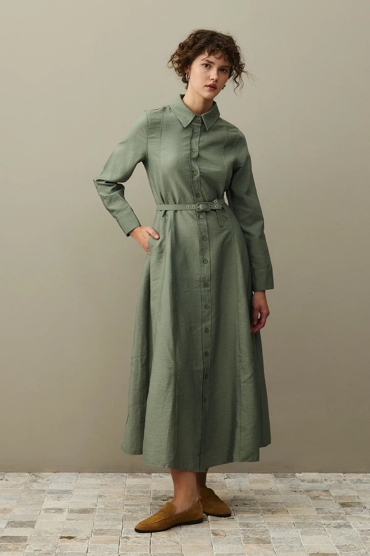Klasik yaka, gabardin dokuma kumaştan, uzun kollu, manşetli, önden düğmeli, parça kesimli, kuşgözü ince kemerli, maxi boy elbise. 36 Beden Uzunluk:130 cm, Kol Uzunluğu: 62 cm, Göğüs:48, Bel: 43 cm, Basen:51 cm, İki Omuz Arası Mesafe: 34 cm 38 Beden Uzunluk:133 cm, Kol Uzunluğu: 62 cm, Göğüs:50, Bel: 45cm, Basen:51cm, İki Omuz Arası Mesafe: 35 cm 40 Beden Uzunluk:135 cm, Kol Uzunluğu: 62 cm, Göğüs:52, Bel: 47 cm, Basen:57 cm, İki Omuz Arası Mesafe: 39 cm Ürün Seyyar Kemerlidir.