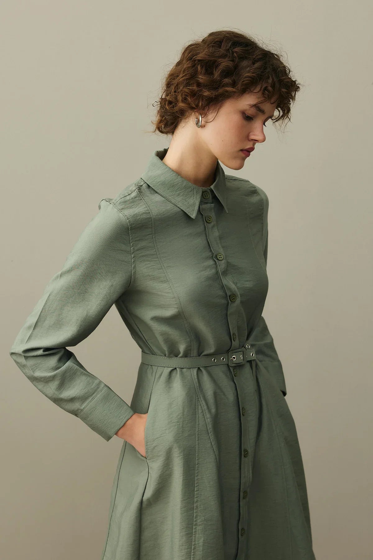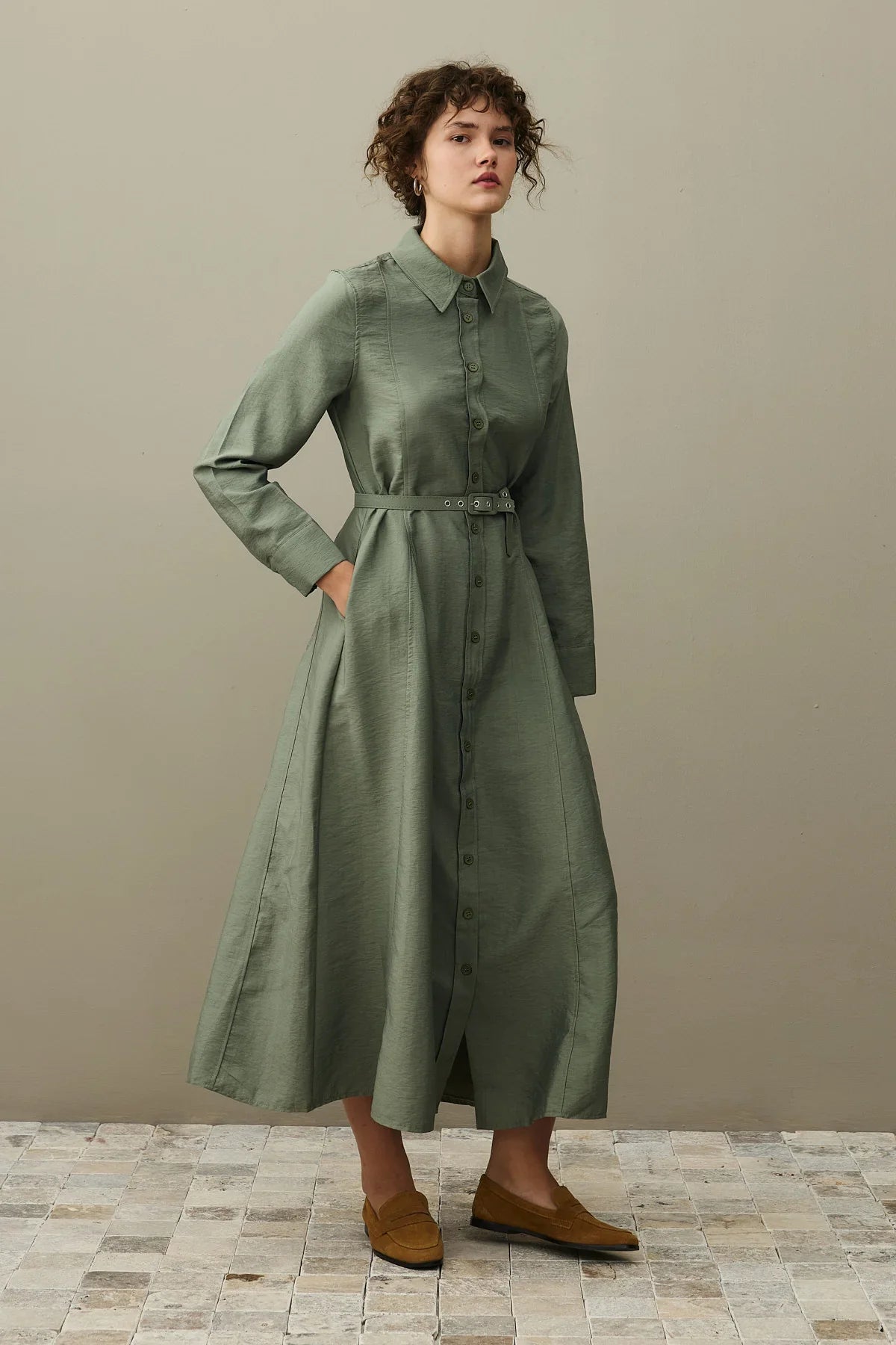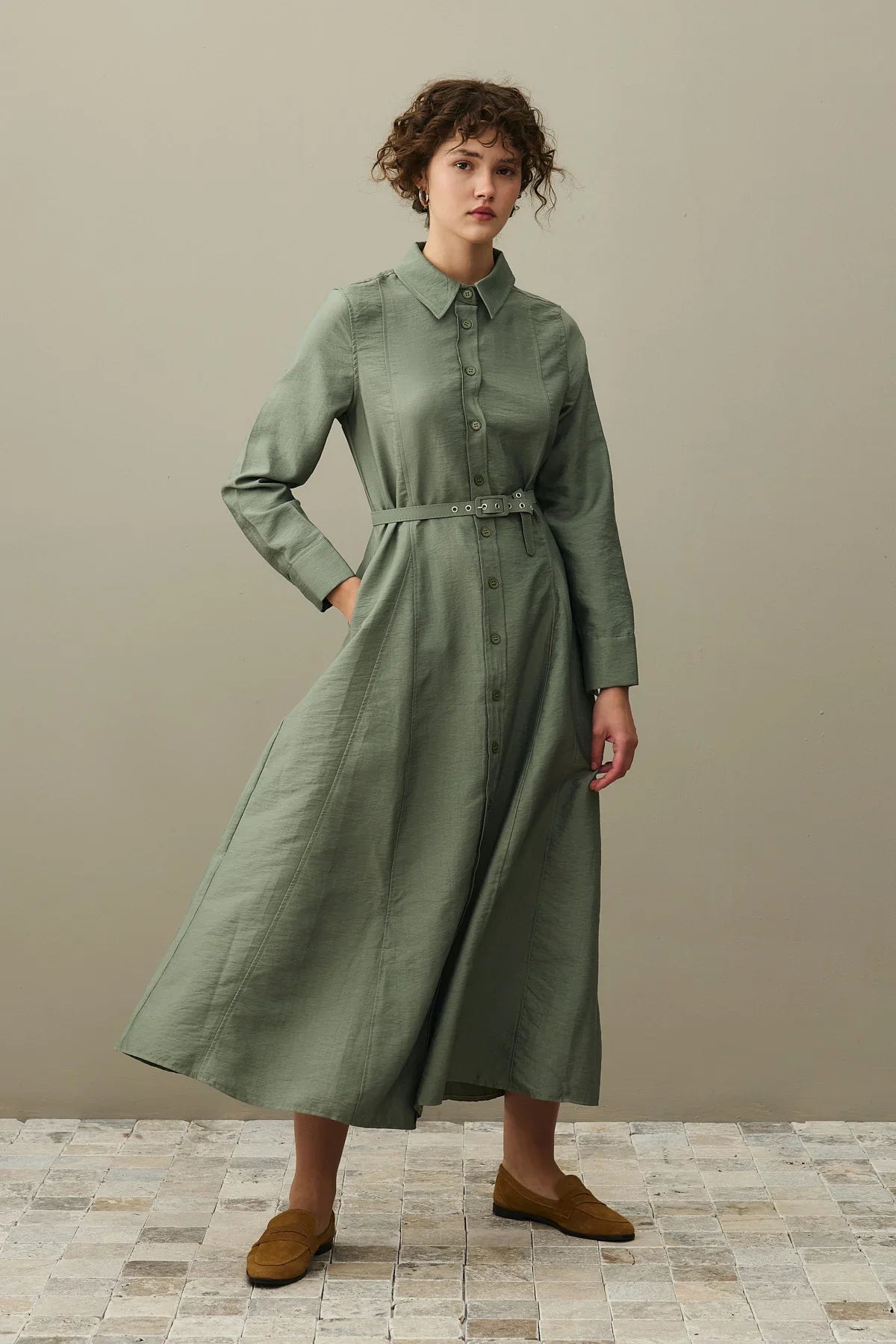 Klasik yaka, gabardin dokuma kumaştan, uzun kollu, manşetli, önden düğmeli, parça kesimli, kuşgözü ince kemerli, maxi boy elbise. 36 Beden Uzunluk:130 cm, Kol Uzunluğu: 62 cm, Göğüs:48, Bel: 43 cm, Basen:51 cm, İki Omuz Arası Mesafe: 34 cm 38 Beden Uzunluk:133 cm, Kol Uzunluğu: 62 cm, Göğüs:50, Bel: 45cm, Basen:51cm, İki Omuz Arası Mesafe: 35 cm 40 Beden Uzunluk:135 cm, Kol Uzunluğu: 62 cm, Göğüs:52, Bel: 47 cm, Basen:57 cm, İki Omuz Arası Mesafe: 39 cm Ürün Seyyar Kemerlidir.