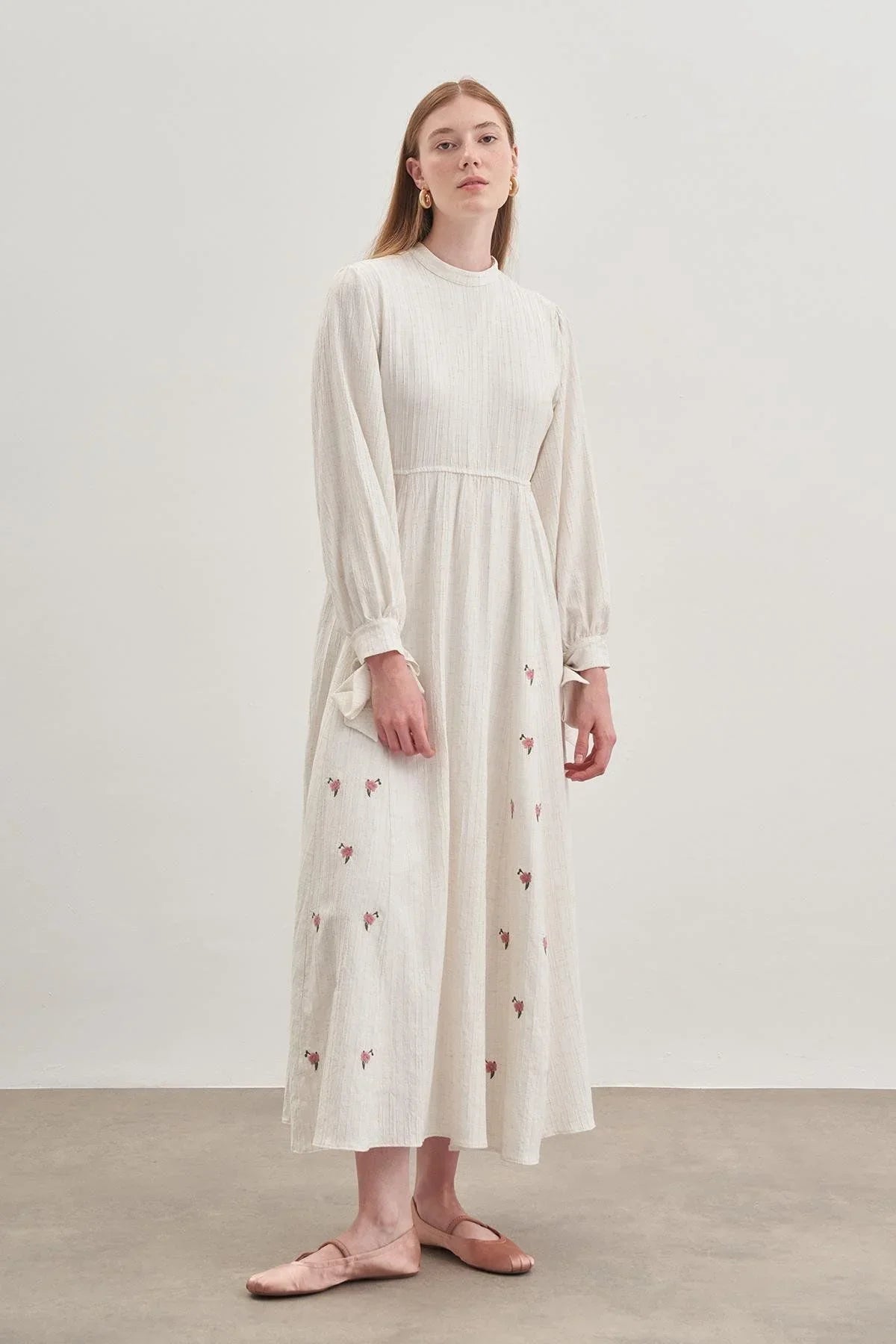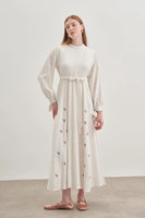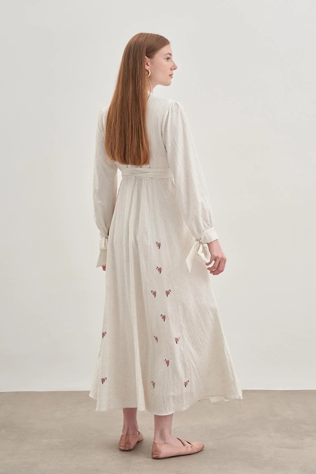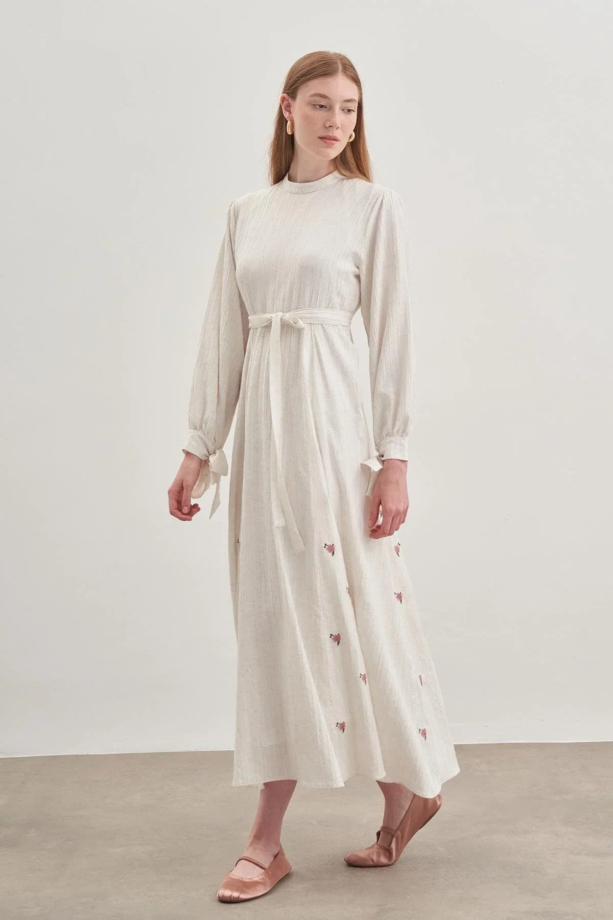 Kolları kumaş bağlamalı, arkadan fermuarlı, hakim yakalı, eteği parça kesimli, nakışlı, bürümcük dokuma kumaştan elbise.