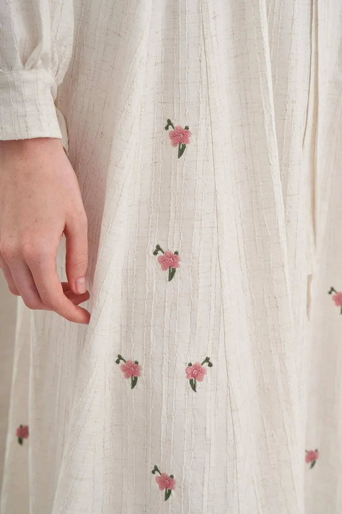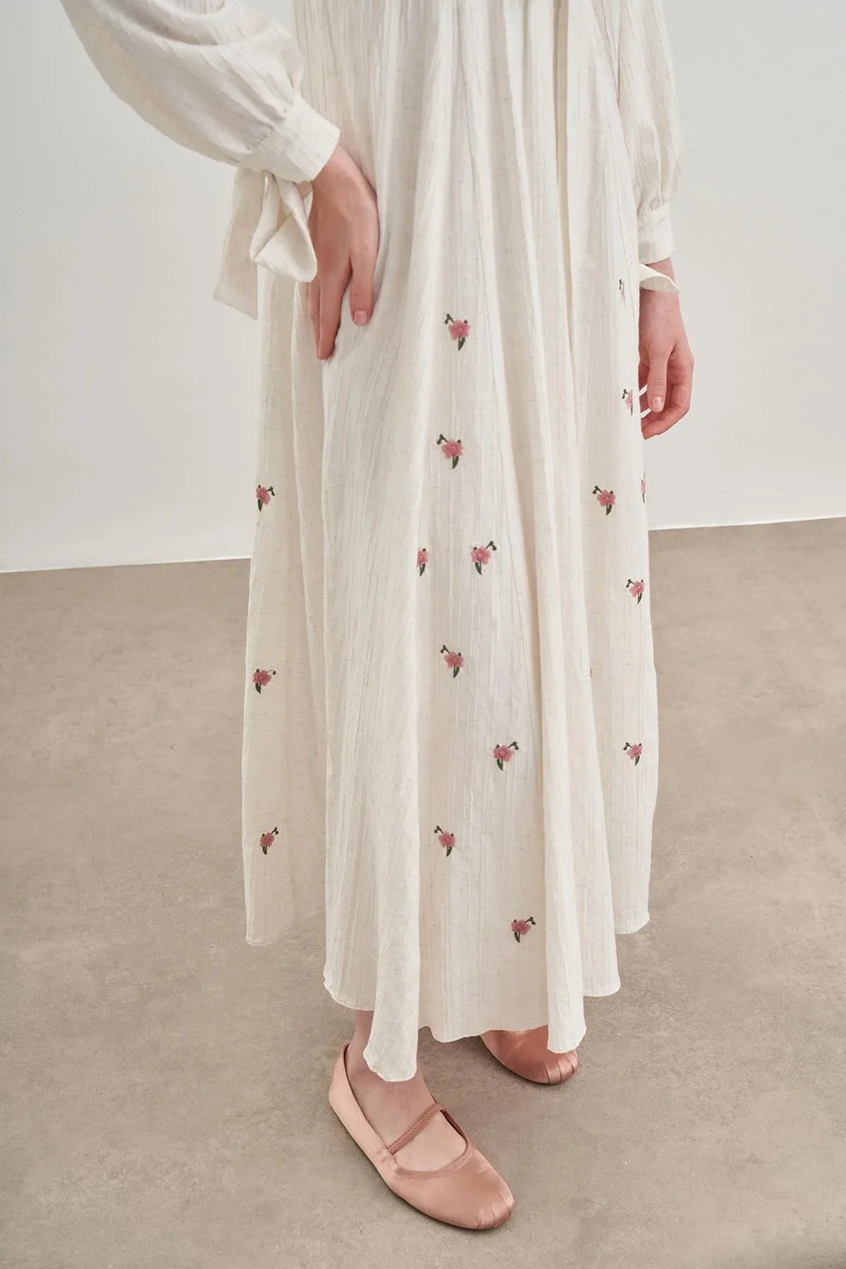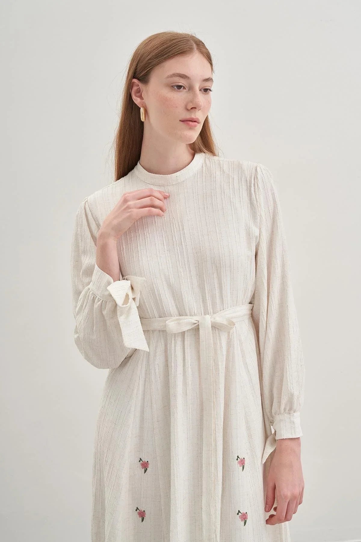 Kolları kumaş bağlamalı, arkadan fermuarlı, hakim yakalı, eteği parça kesimli, nakışlı, bürümcük dokuma kumaştan elbise.