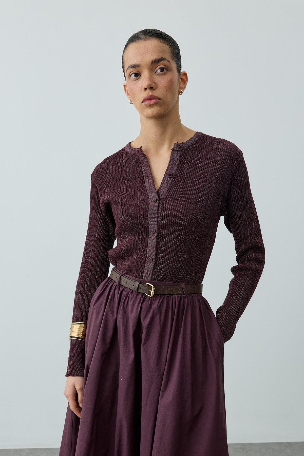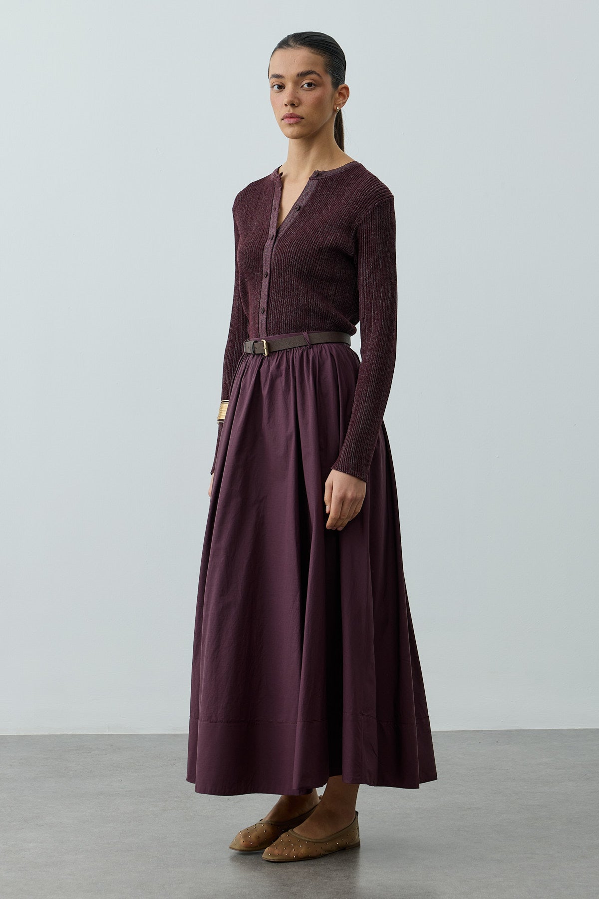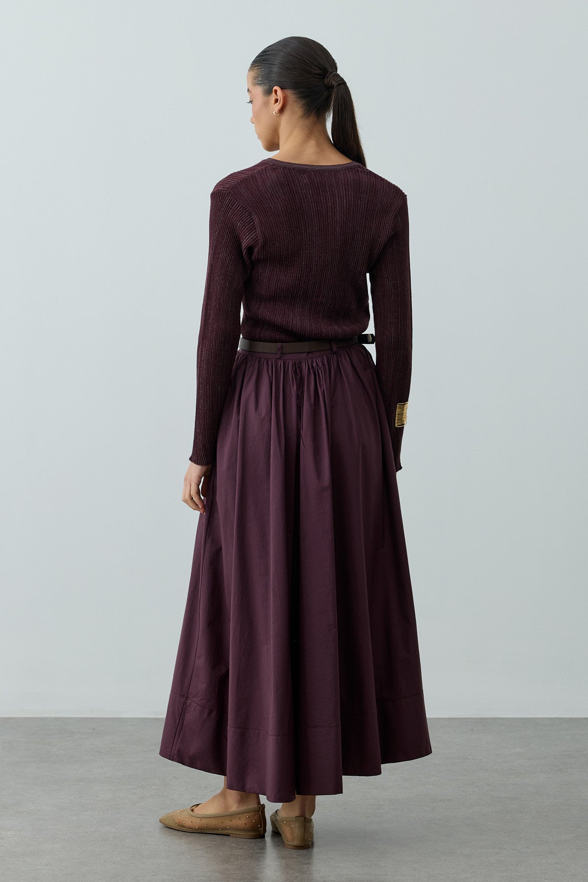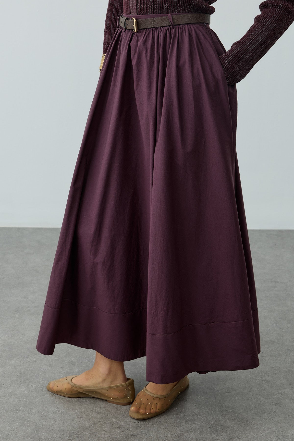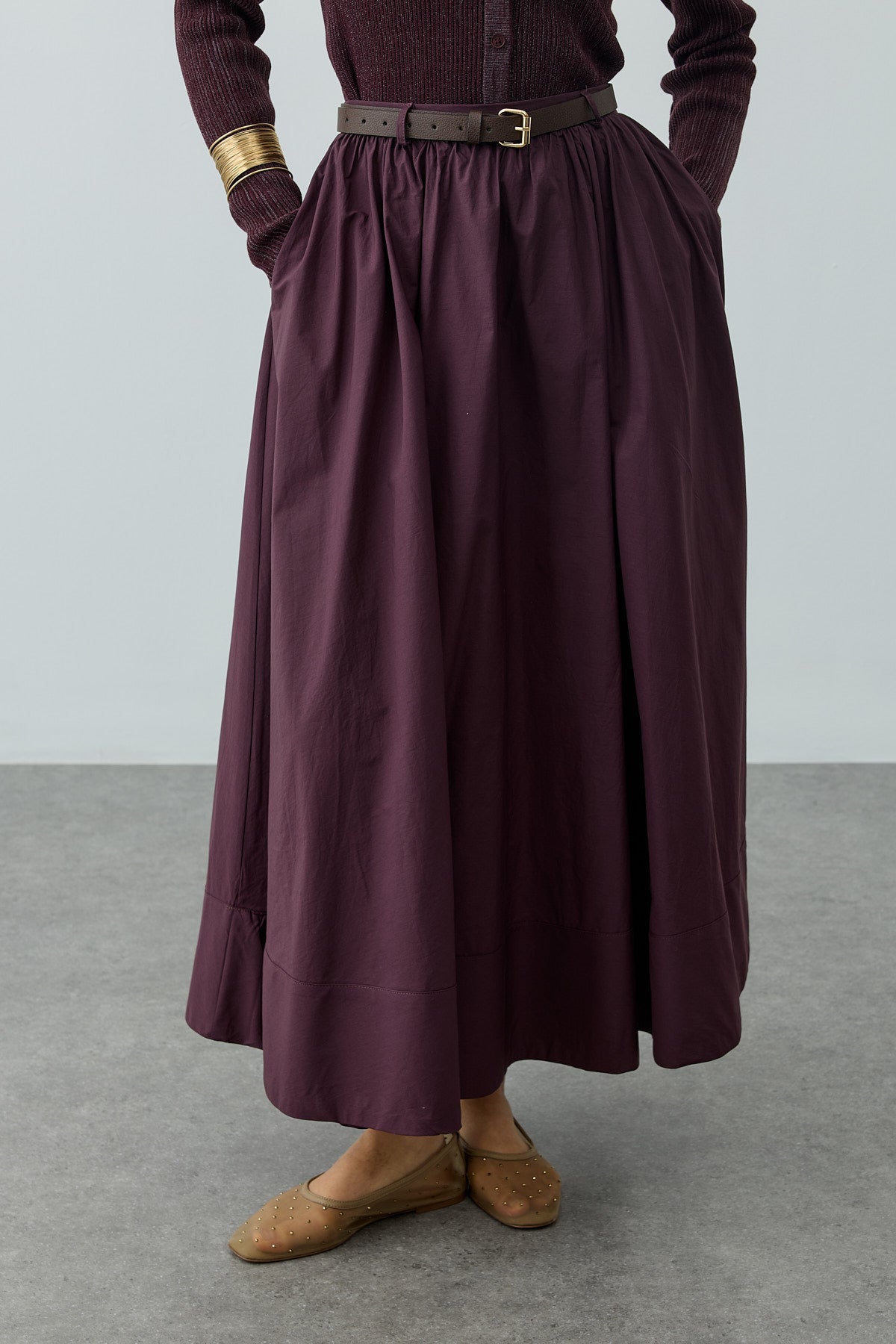 Büzgü Detaylı Maxi Etek Mürdüm