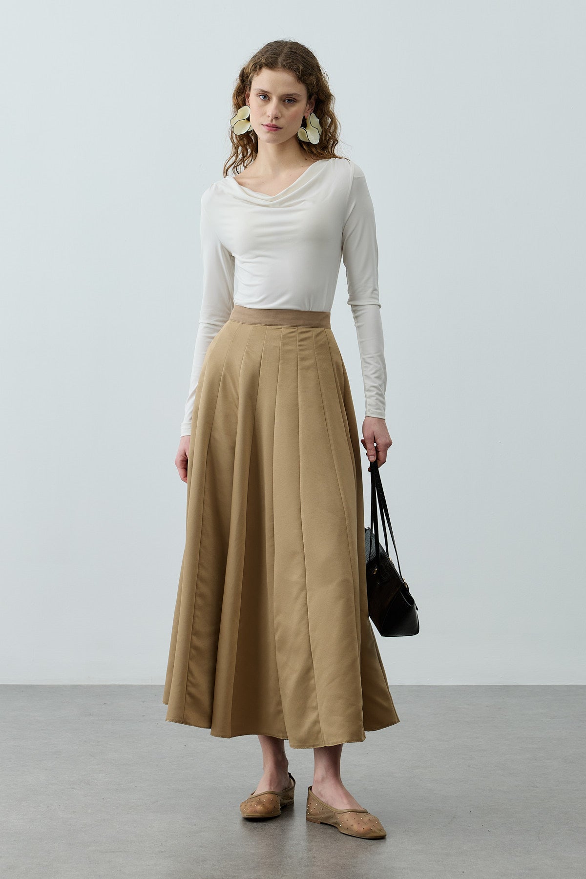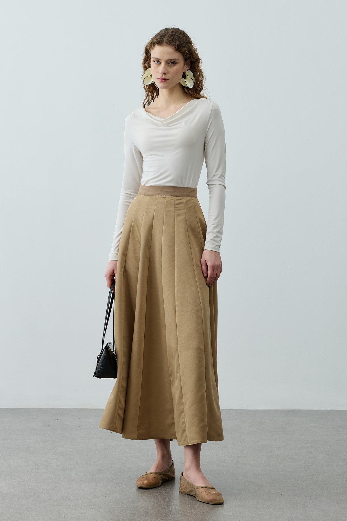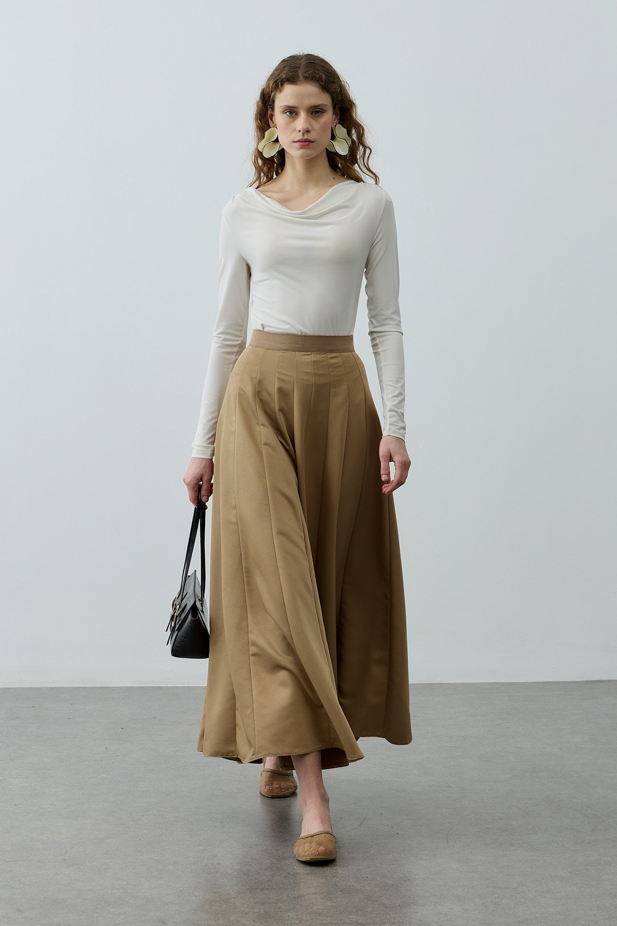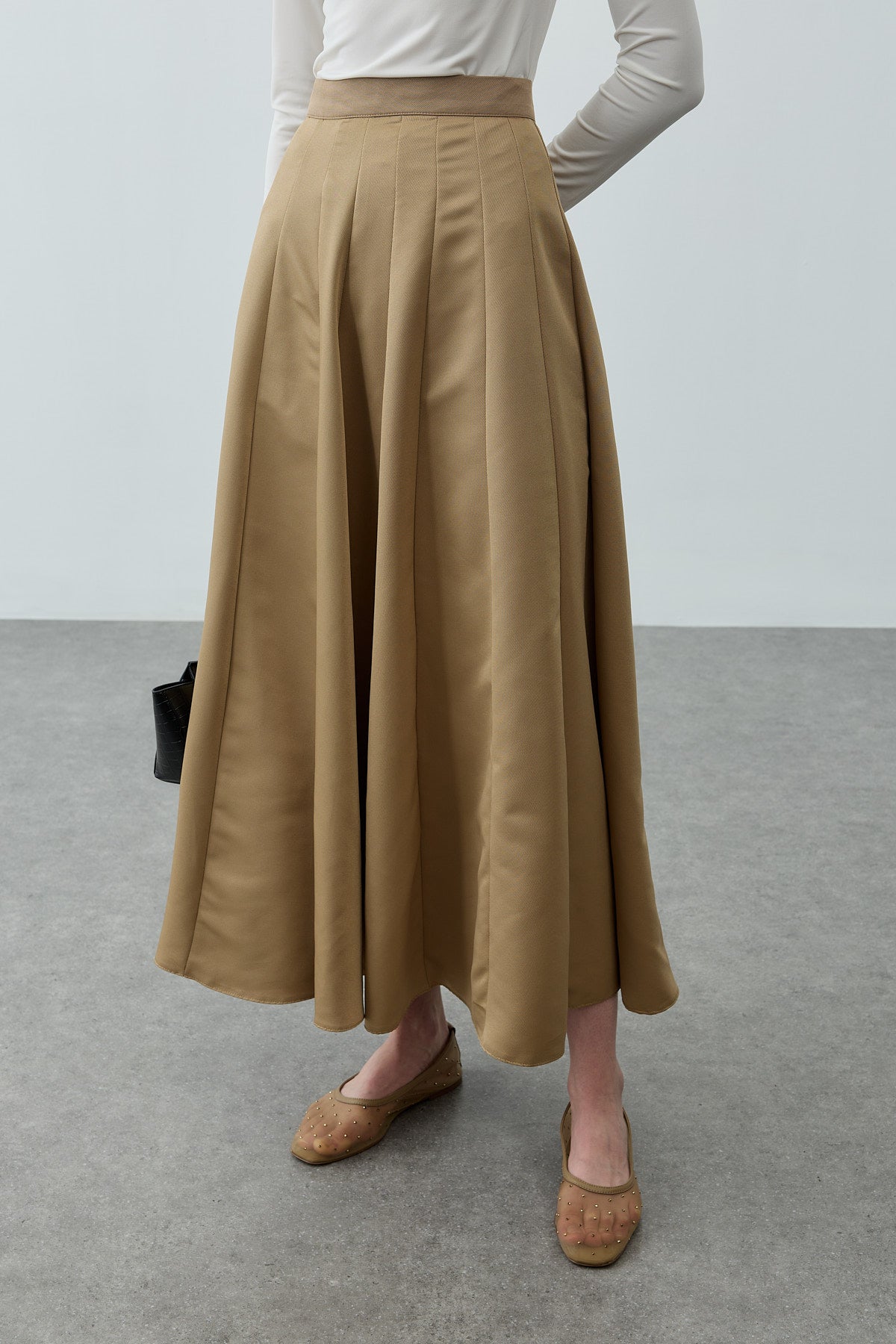 Tok dokuma kumaştan, beli ince kemerli, fermuar kapamalı, çok parçalı, gode açılımlı, maxi etek.