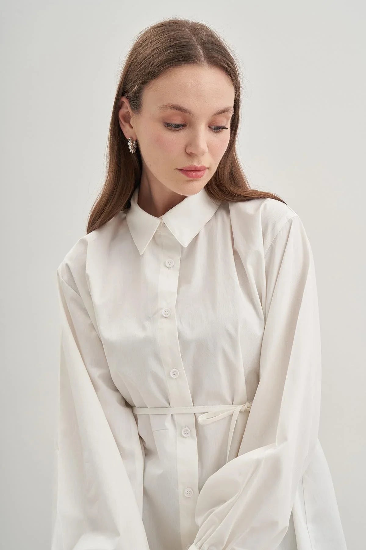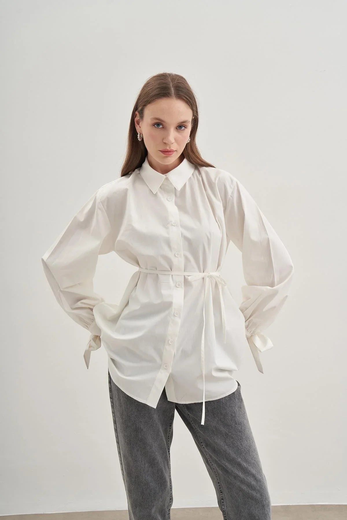 Manşetleri kuşak bağlama detaylı, gömlek yakalı, düğmeli, seyyar biye kemerli, %100 pamuk poplin dokuma kumaştan gömlek.