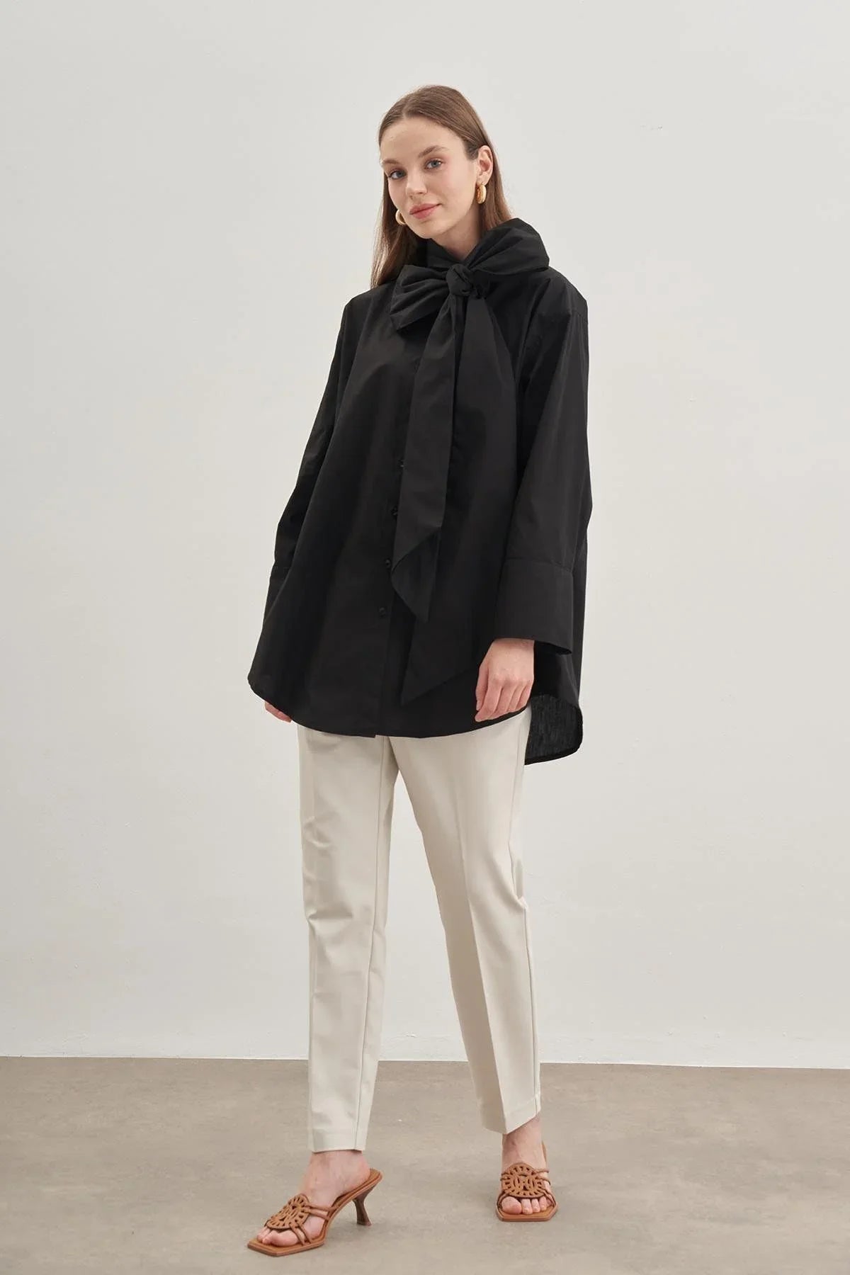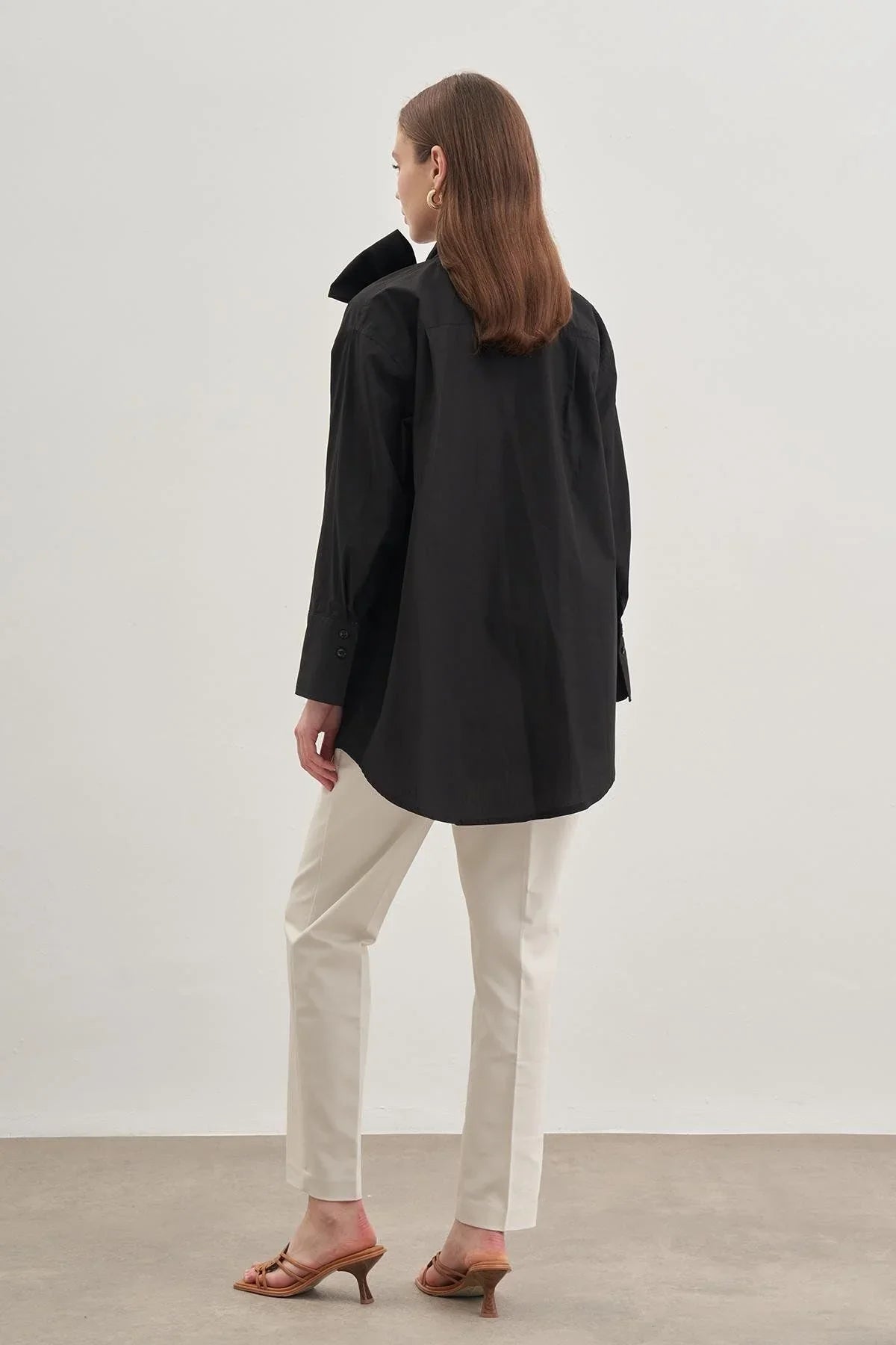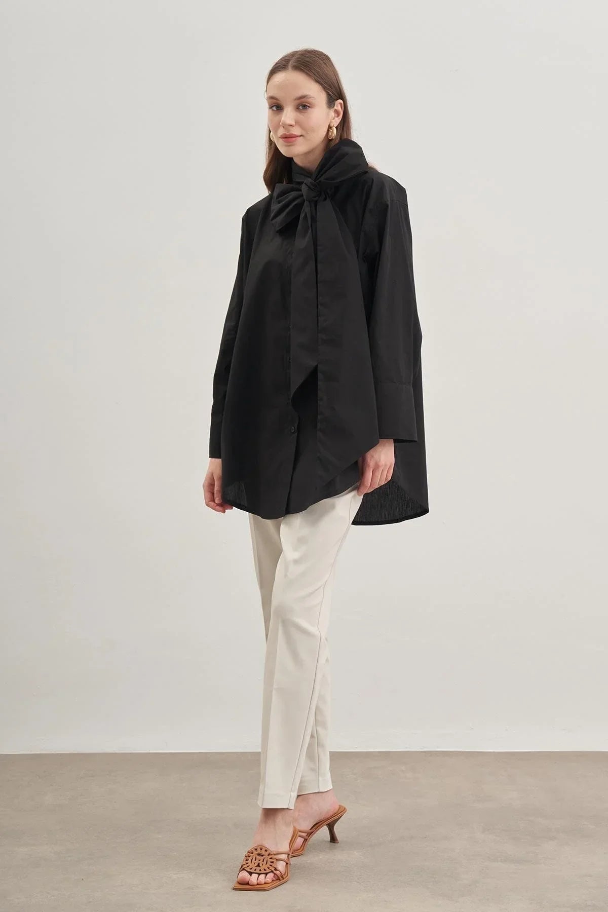 Geniş Bağlamalı Poplin Gömlek Siyah