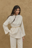 Bisiklet yaka, sırtı fermuar kapamalı, keten karışımlı dokuma kumaştan, beli pensli, kalın katlamalı gömlek. 1(36-38) BEDEN Uzunlu: 70 cm, Bel:39 cm, İki Omuz Arası Mesafe: 40 cm, Basen: 65 cm, Kol Uzunluğu: 59. 2 (40-42) BEDEN Uzunlu: 72 cm, Bel:42 cm, İki Omuz Arası Mesafe: 42 cm, Basen: 67 cm, Kol Uzunluğu: 61.