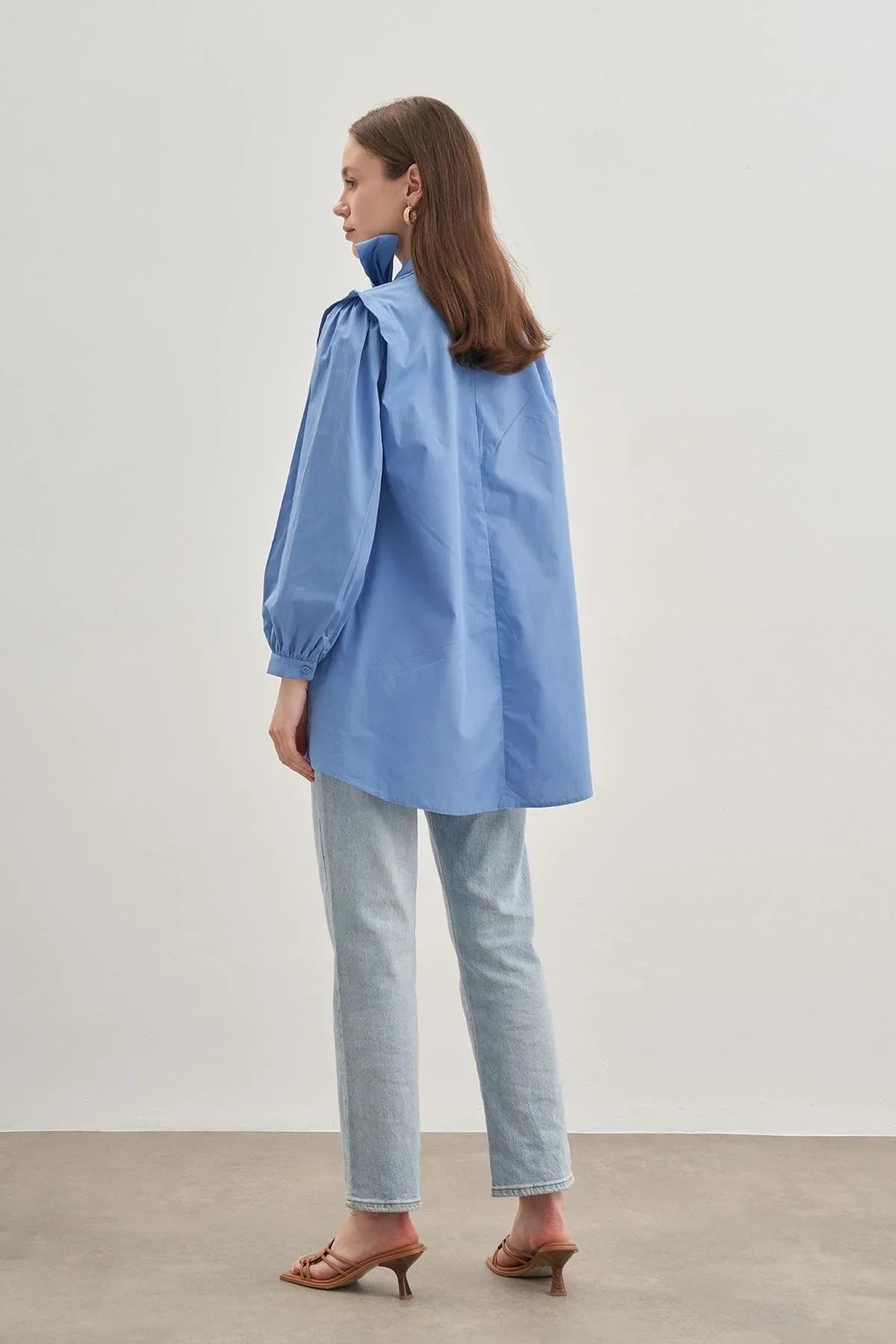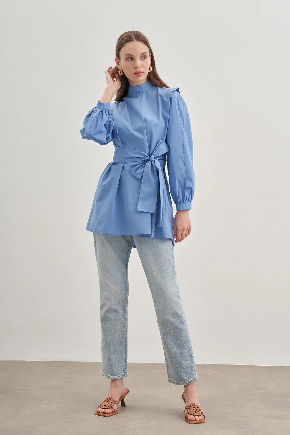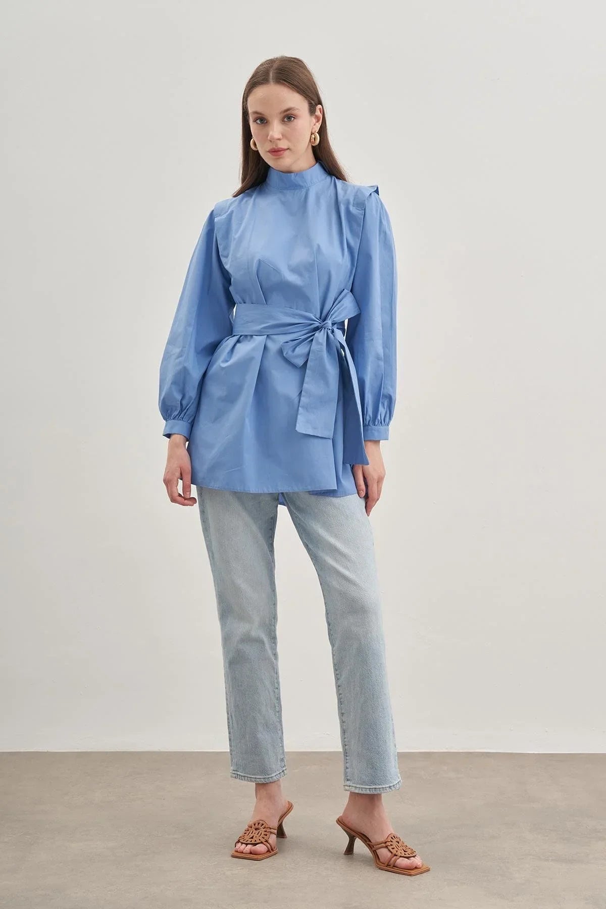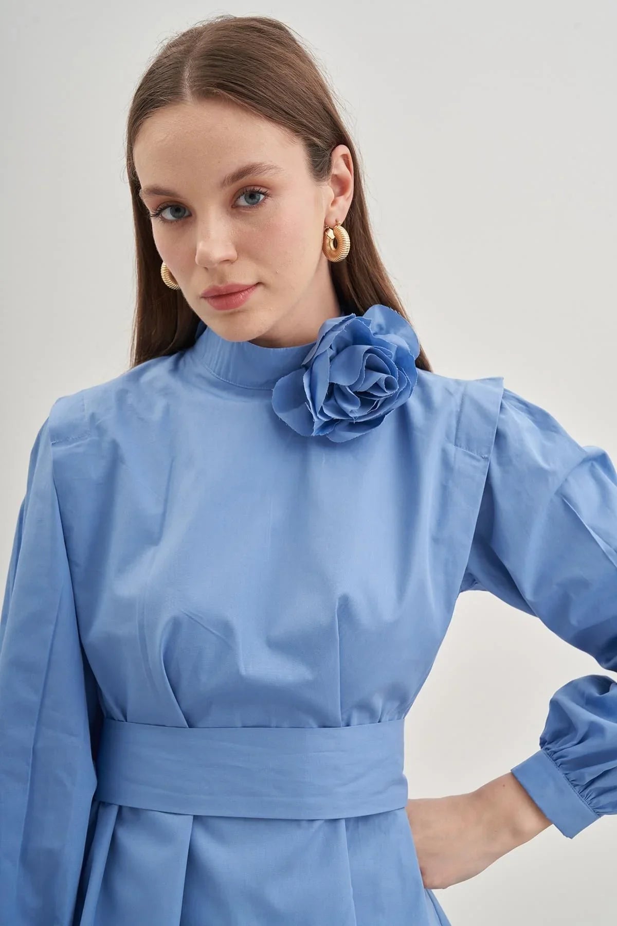 Hakim yakalı, arkadan fermuarlı, ince manşetli, %100 pamuk poplin dokuma kumaştan, ister boyunda ister belde kullanılabilen seyyar kemerli, omuzları kat detaylı gömlek.