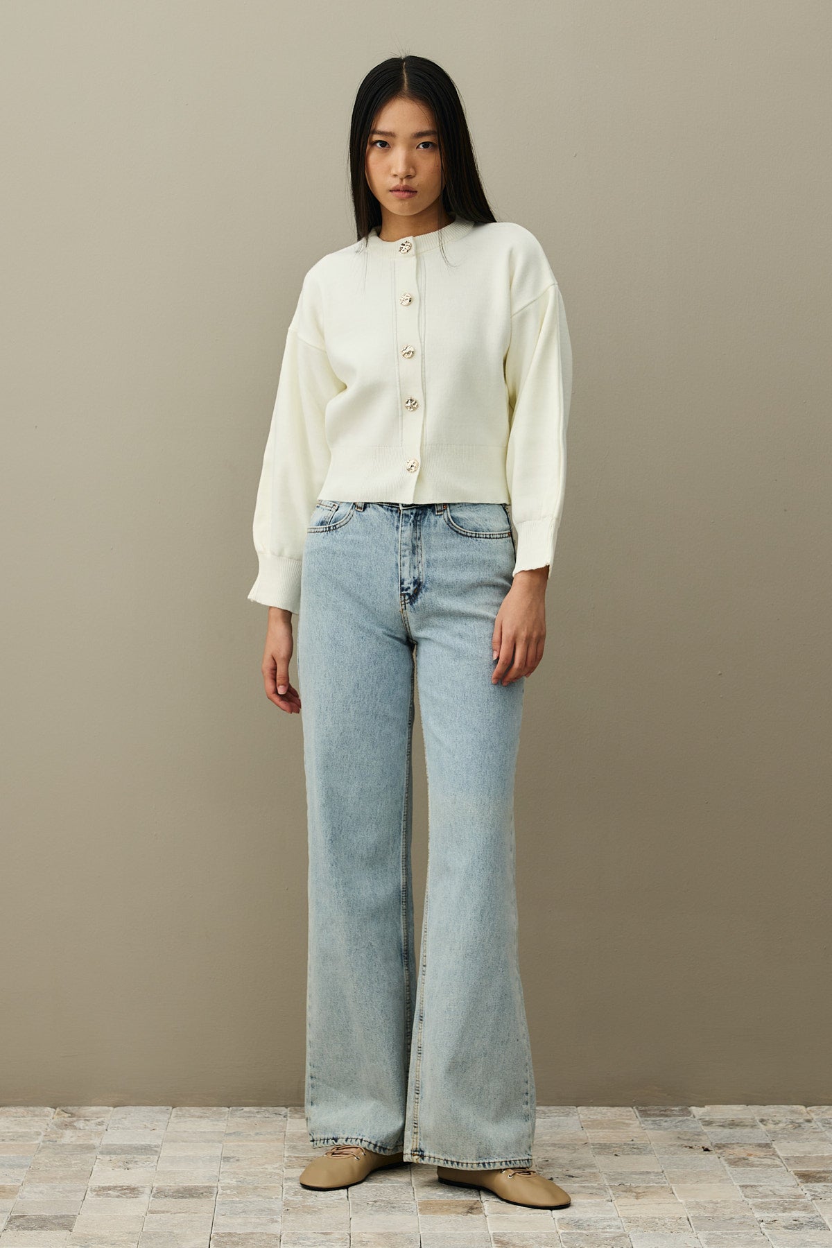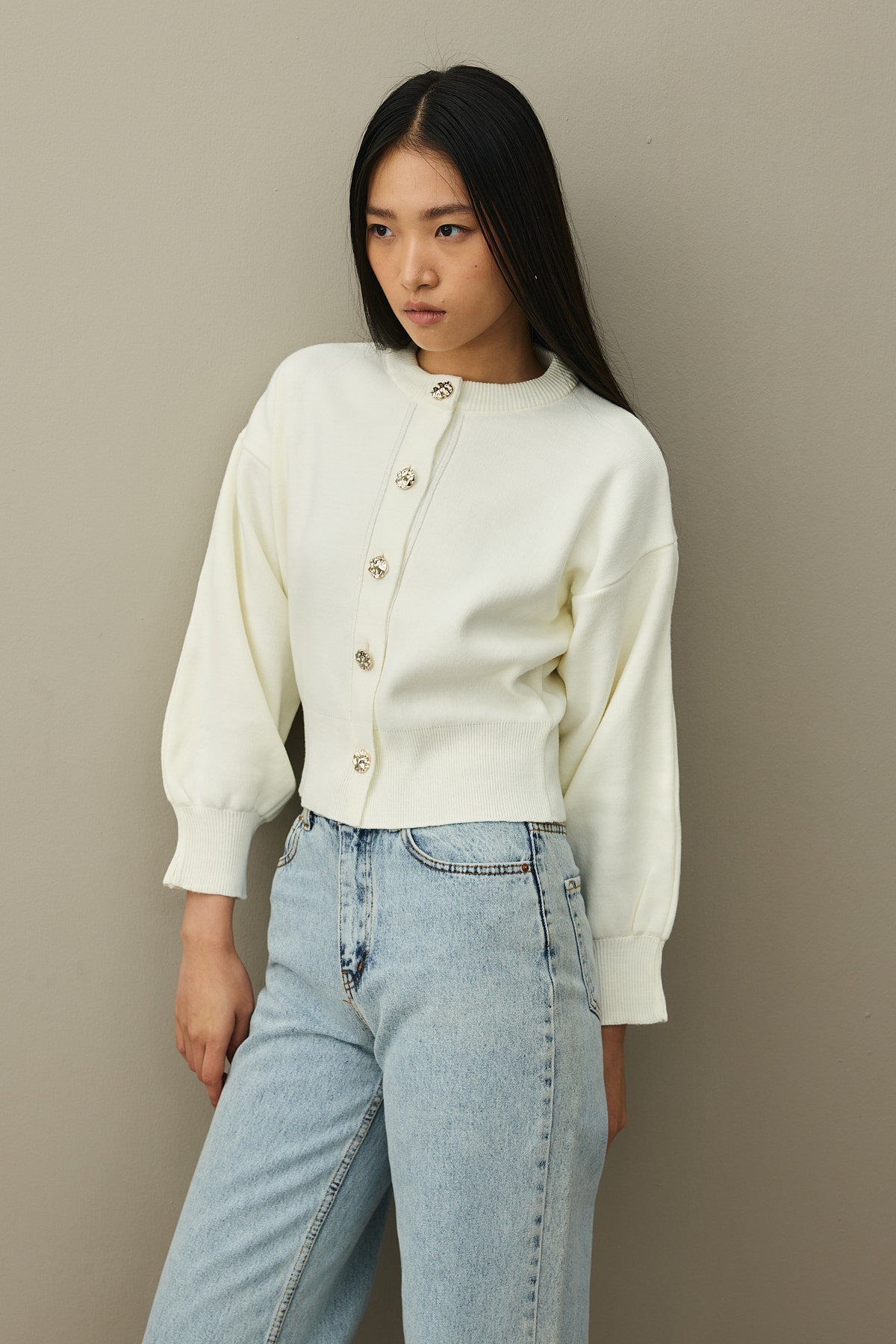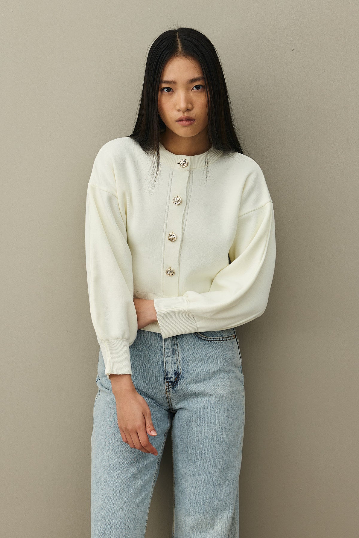 Sık örme trikodan, bisiklet yakalı, balon uzun kollu, önü dore düğme kapamalı hırka