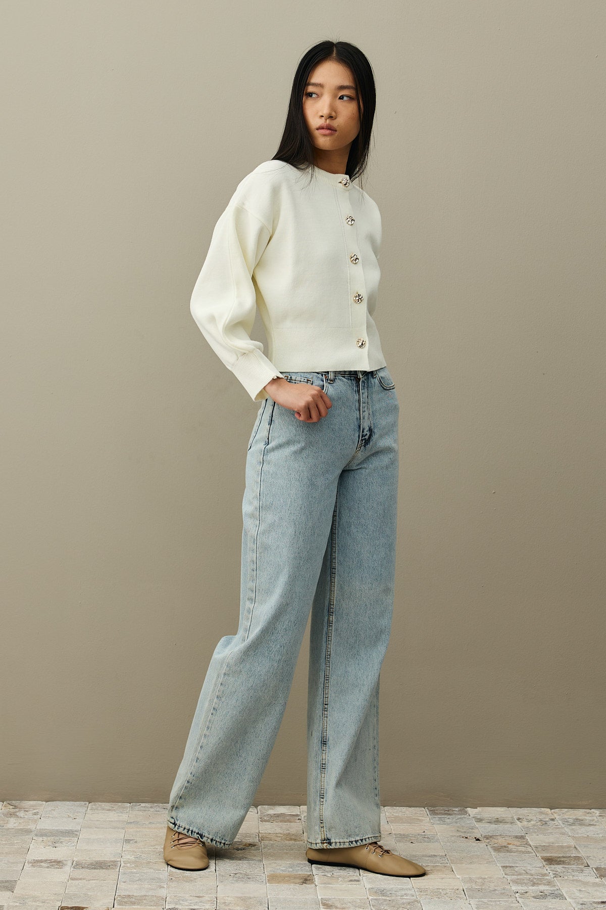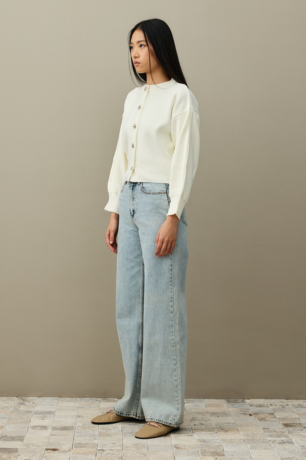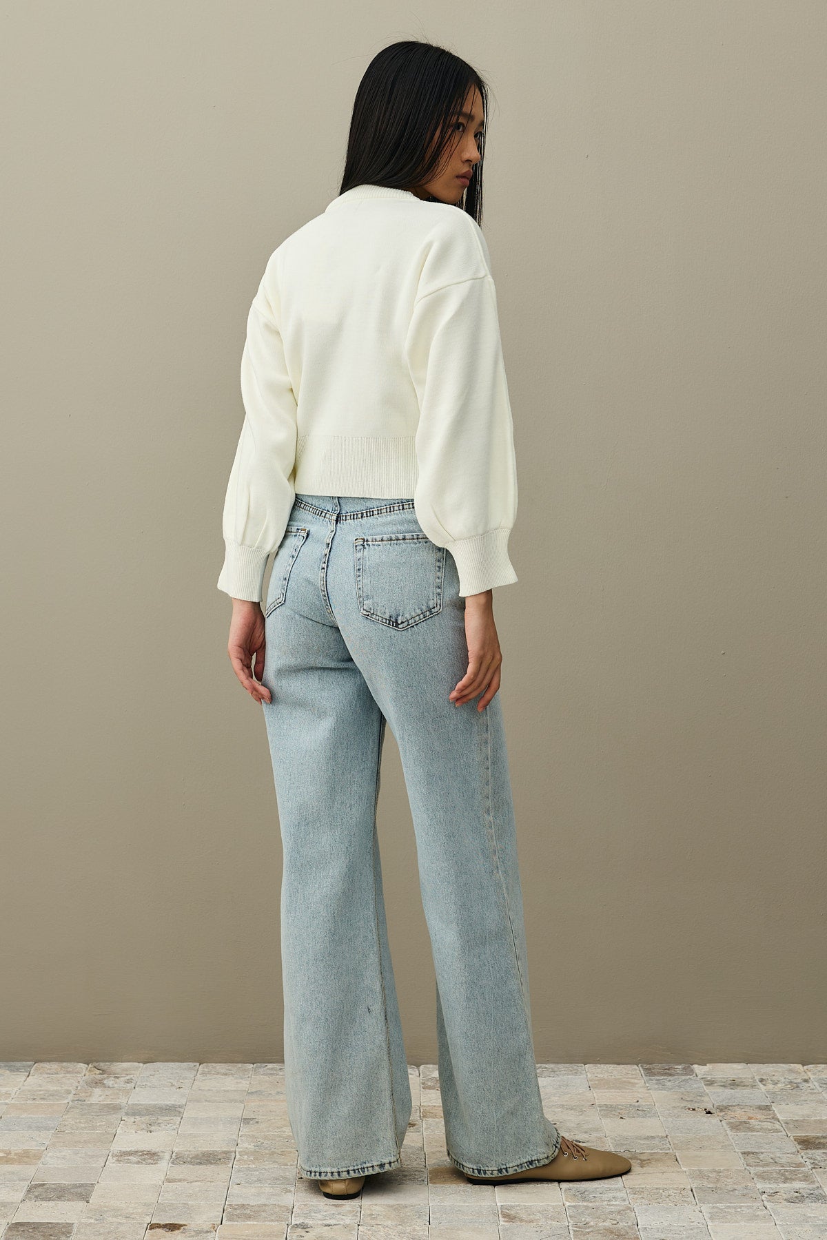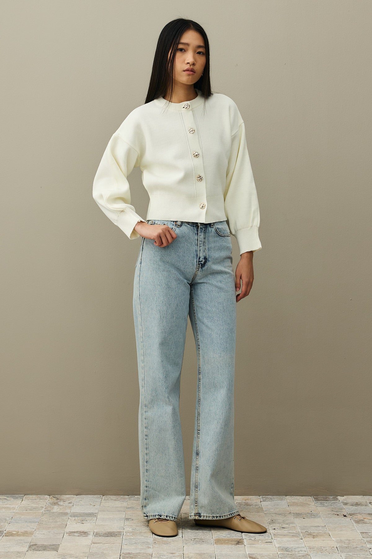 Sık örme trikodan, bisiklet yakalı, balon uzun kollu, önü dore düğme kapamalı hırka