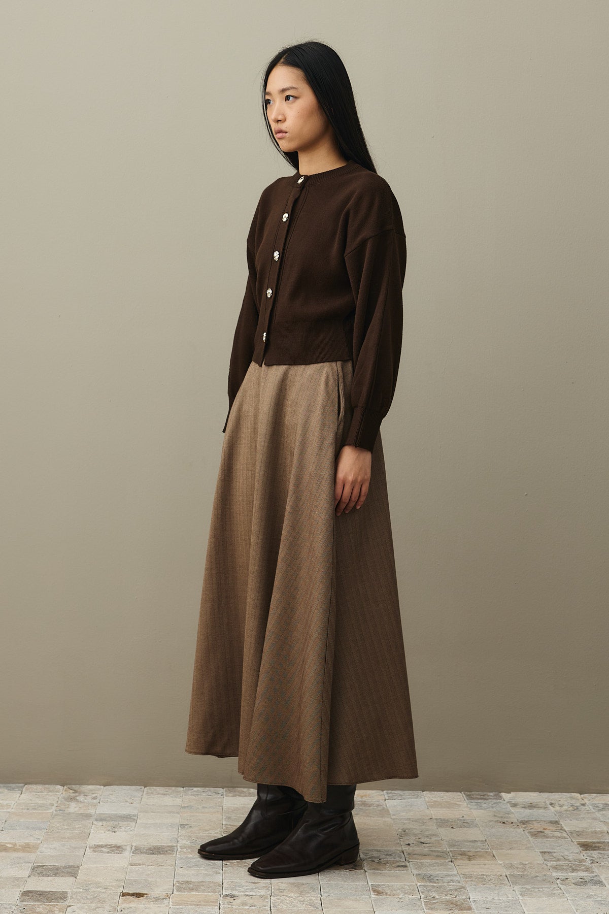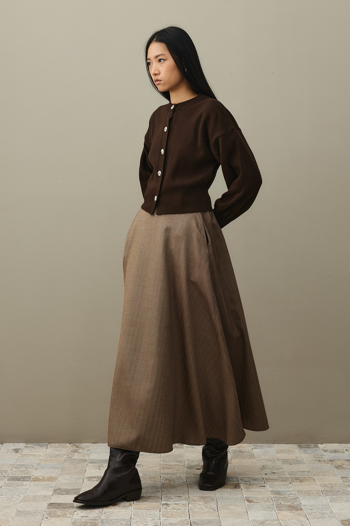Sık örme trikodan, bisiklet yakalı, balon uzun kollu, önü dore düğme kapamalı hırka