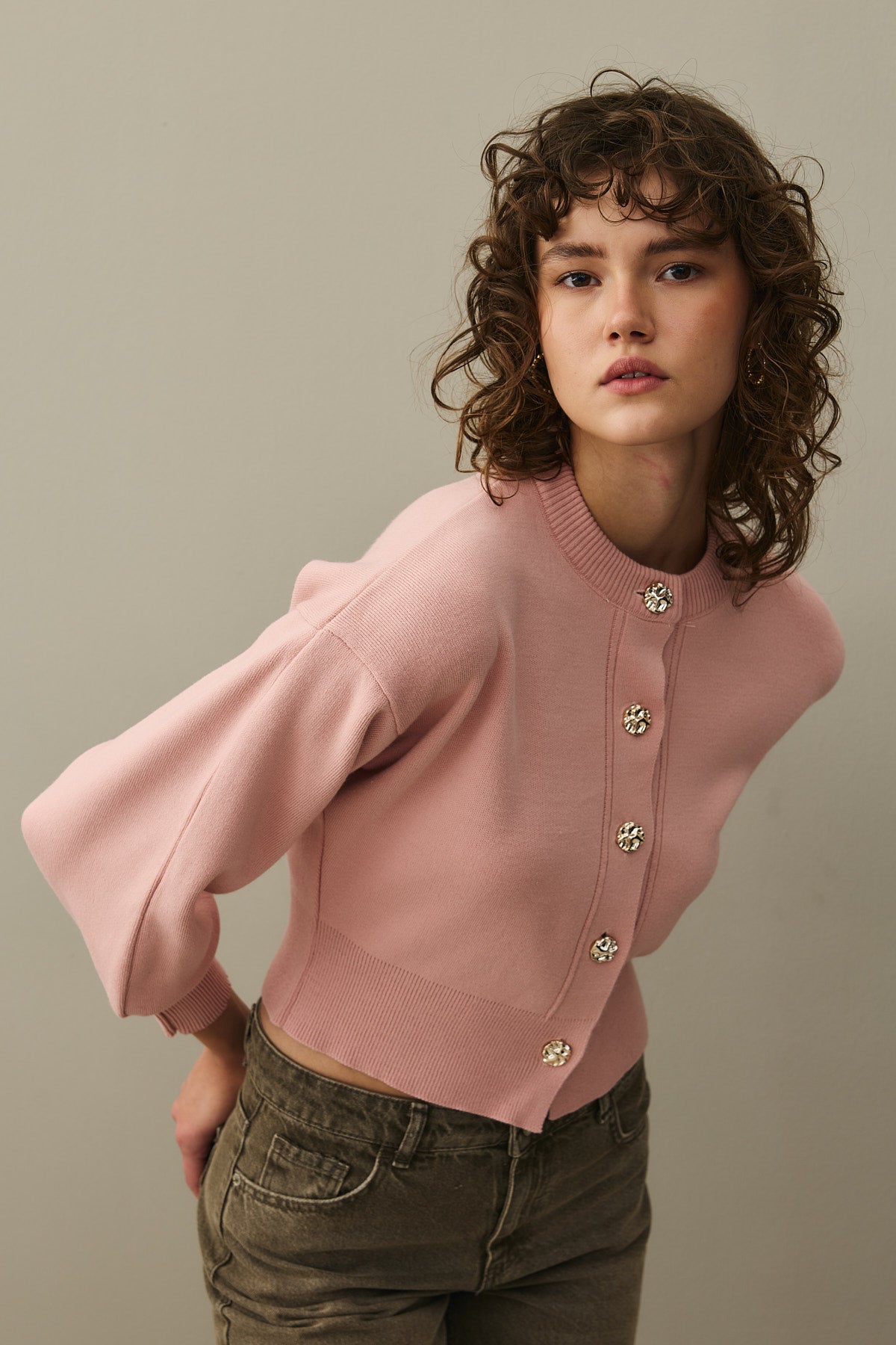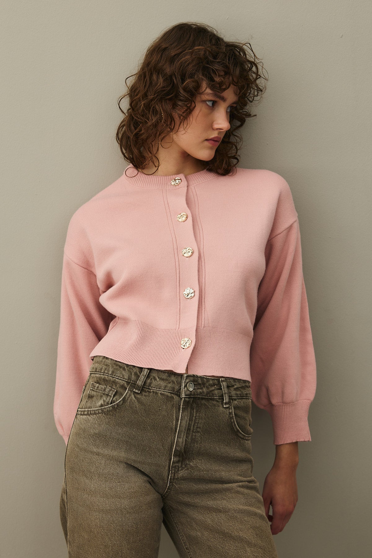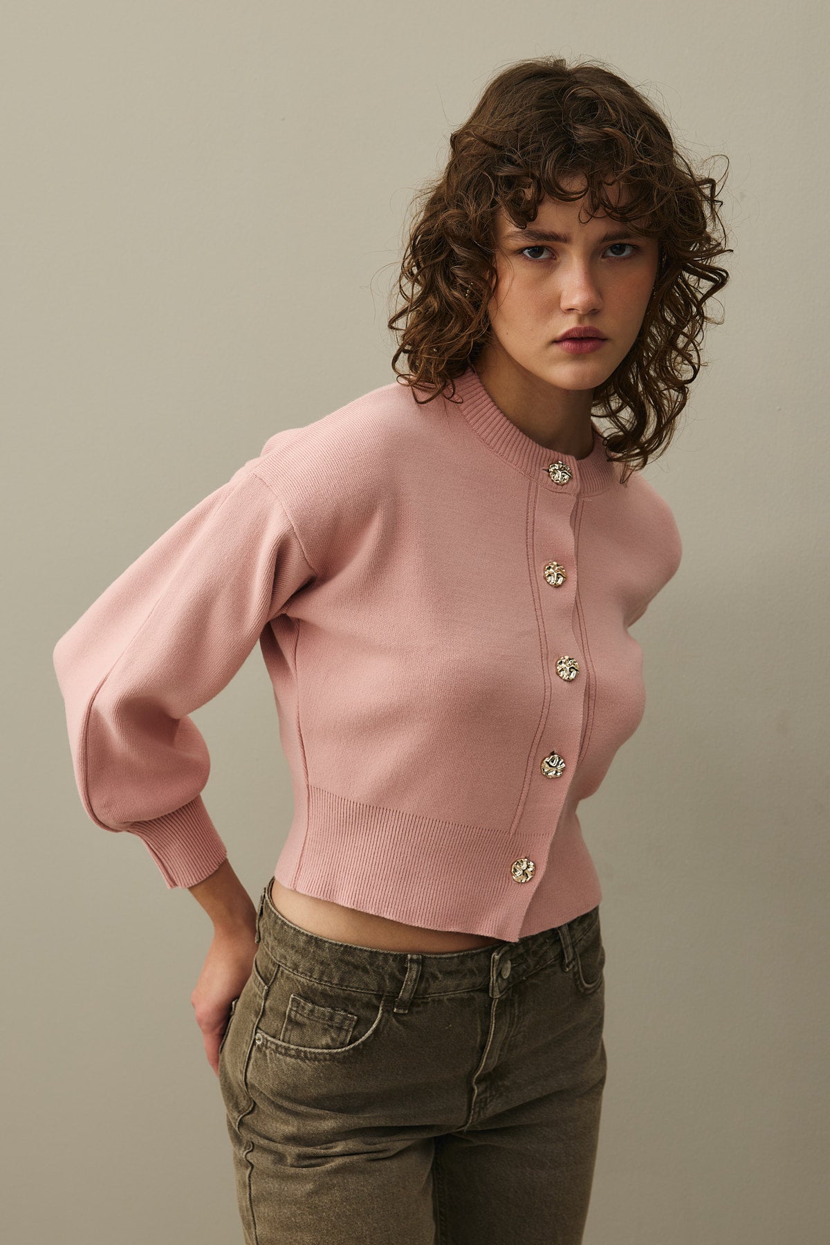 Sık örme trikodan, bisiklet yakalı, balon uzun kollu, önü dore düğme kapamalı hırka