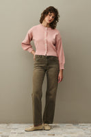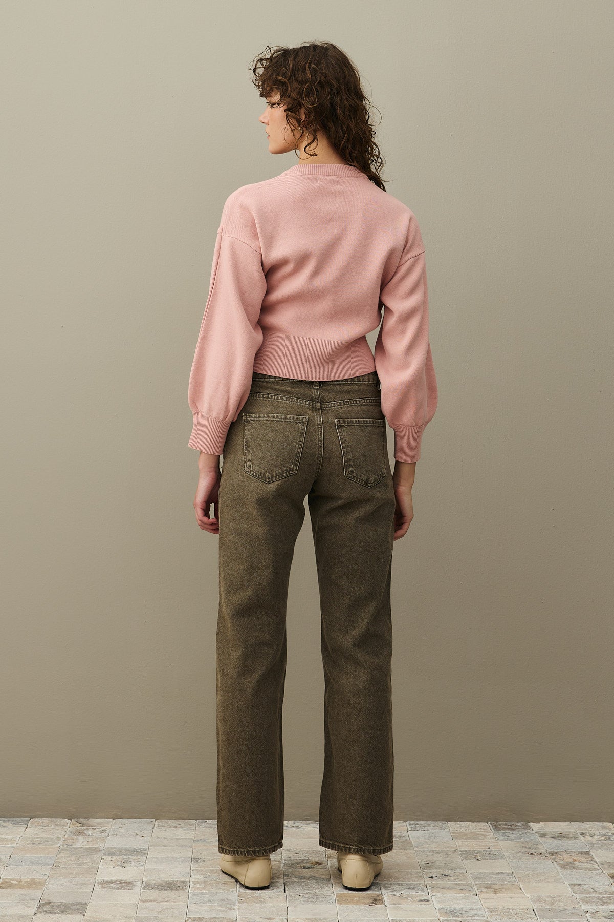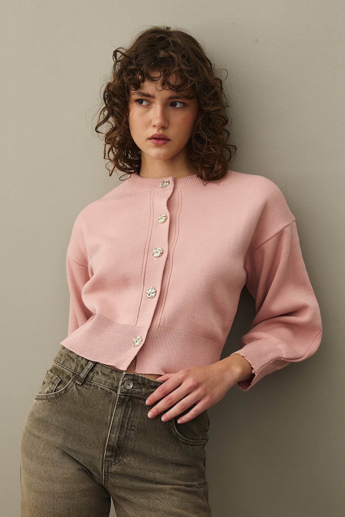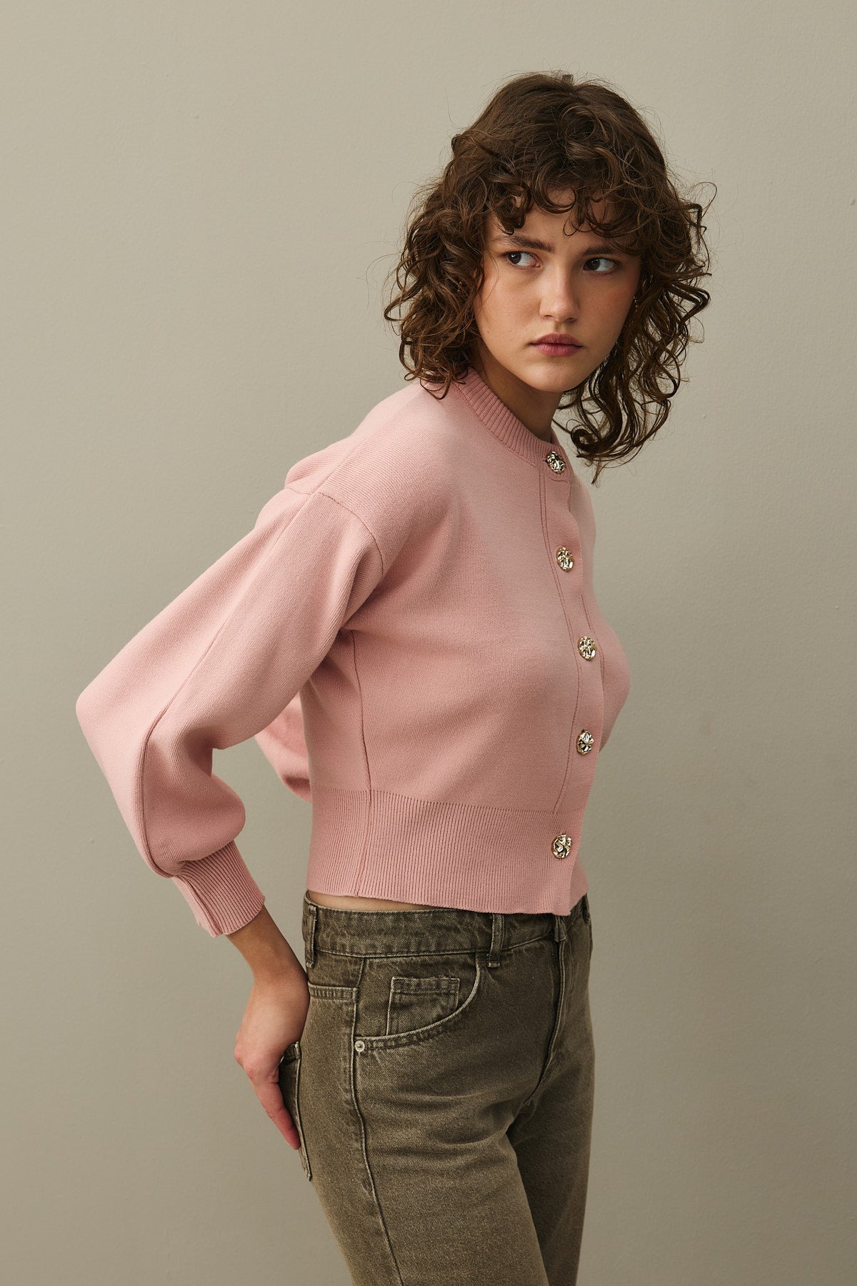 Sık örme trikodan, bisiklet yakalı, balon uzun kollu, önü dore düğme kapamalı hırka