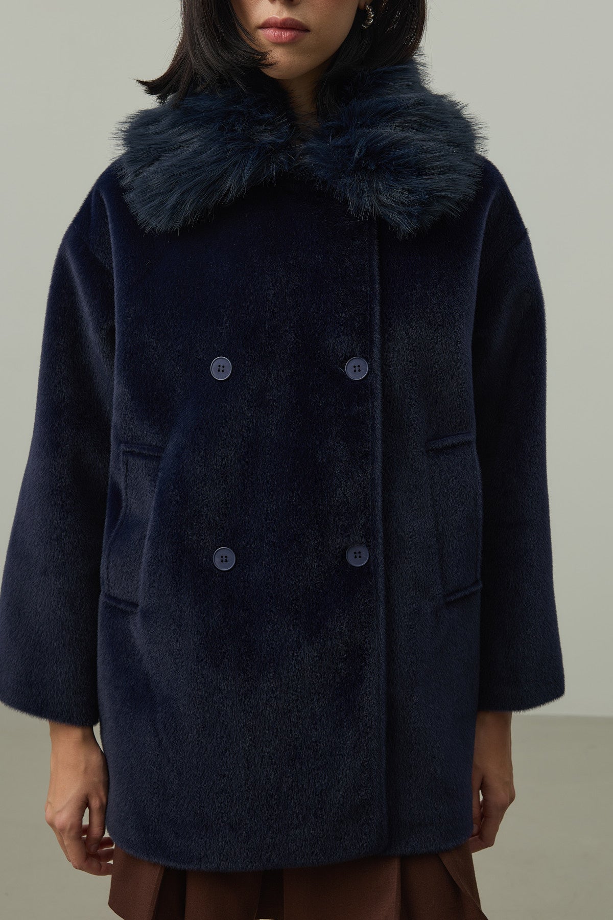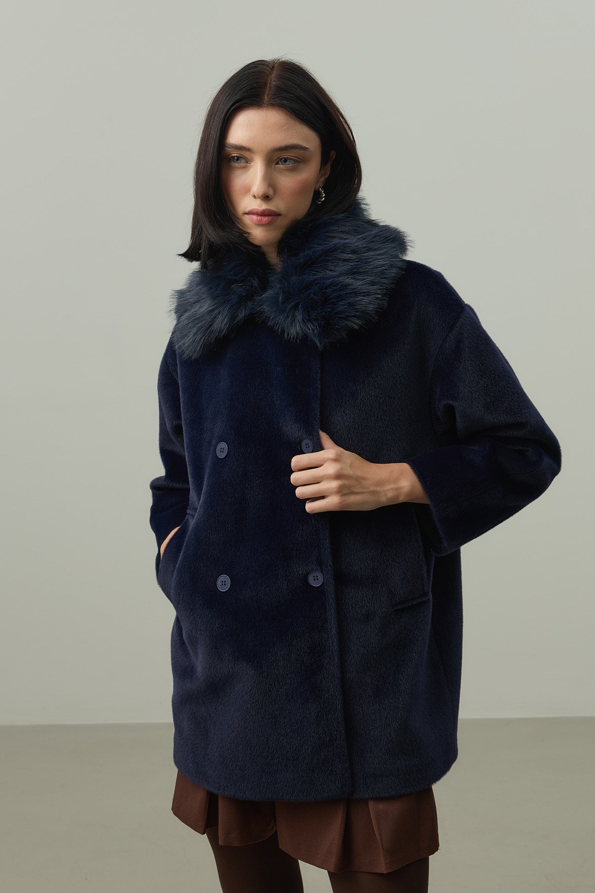 Tilki tüyü dokulu dokuma kumaştan, çıkarılabilir premium kürklü, astarlı, cepli, uzun kollu, kruvaze kesim, önü düğme kapamalı, bomb kesim kaşe kaban