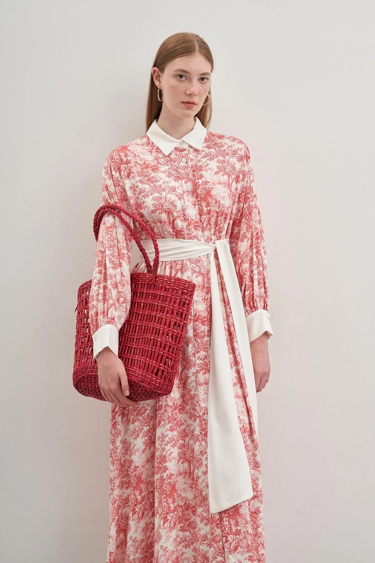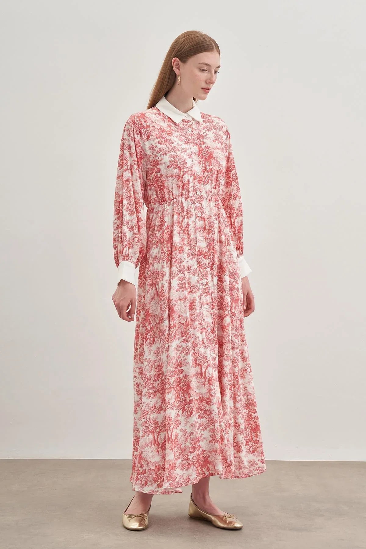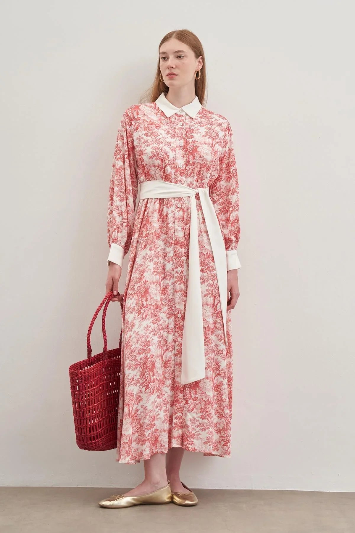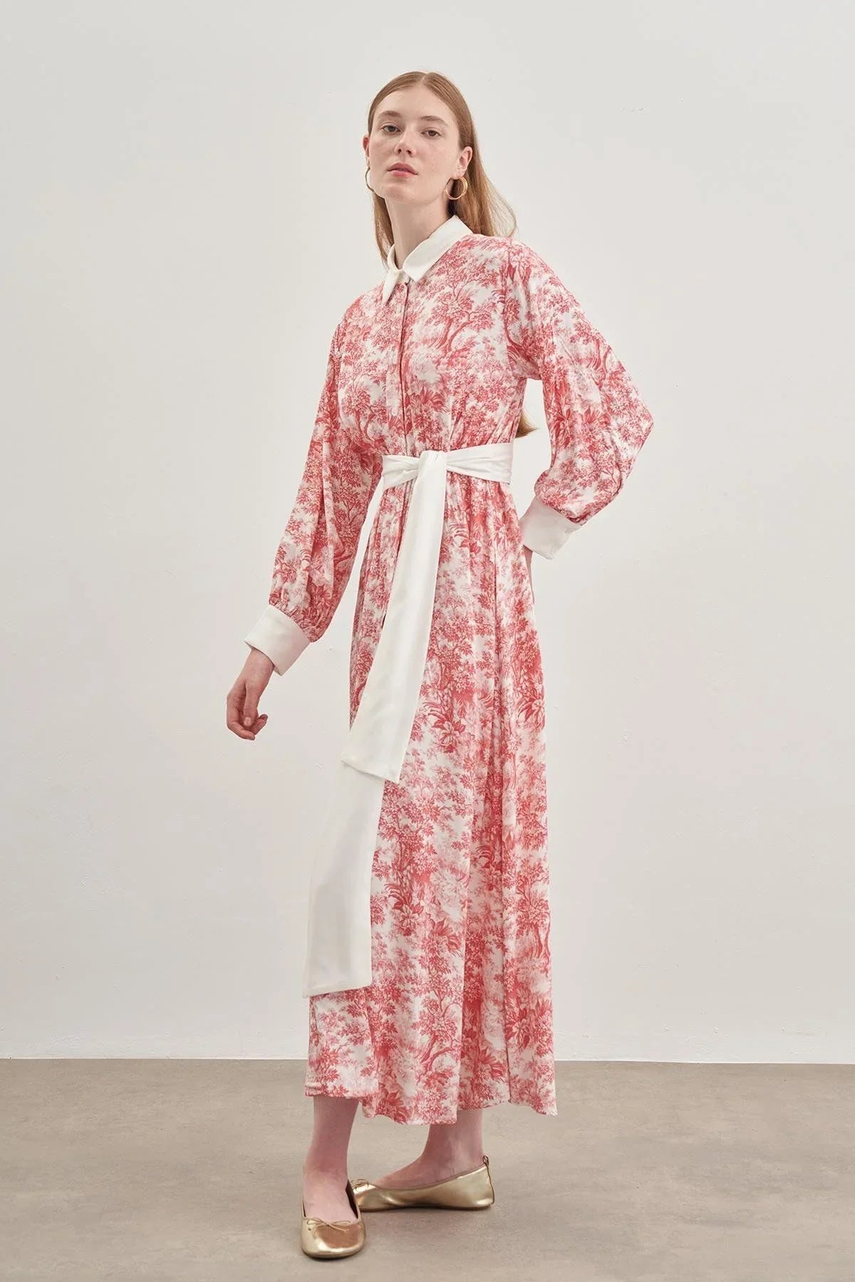 Gömlek yakalı, önden düğmeli, beli ince lastikli, manşetli, seyyar kemer detaylı, özel pigment boyalı %100 pamuk viscone dokuma kumaştan elbise.