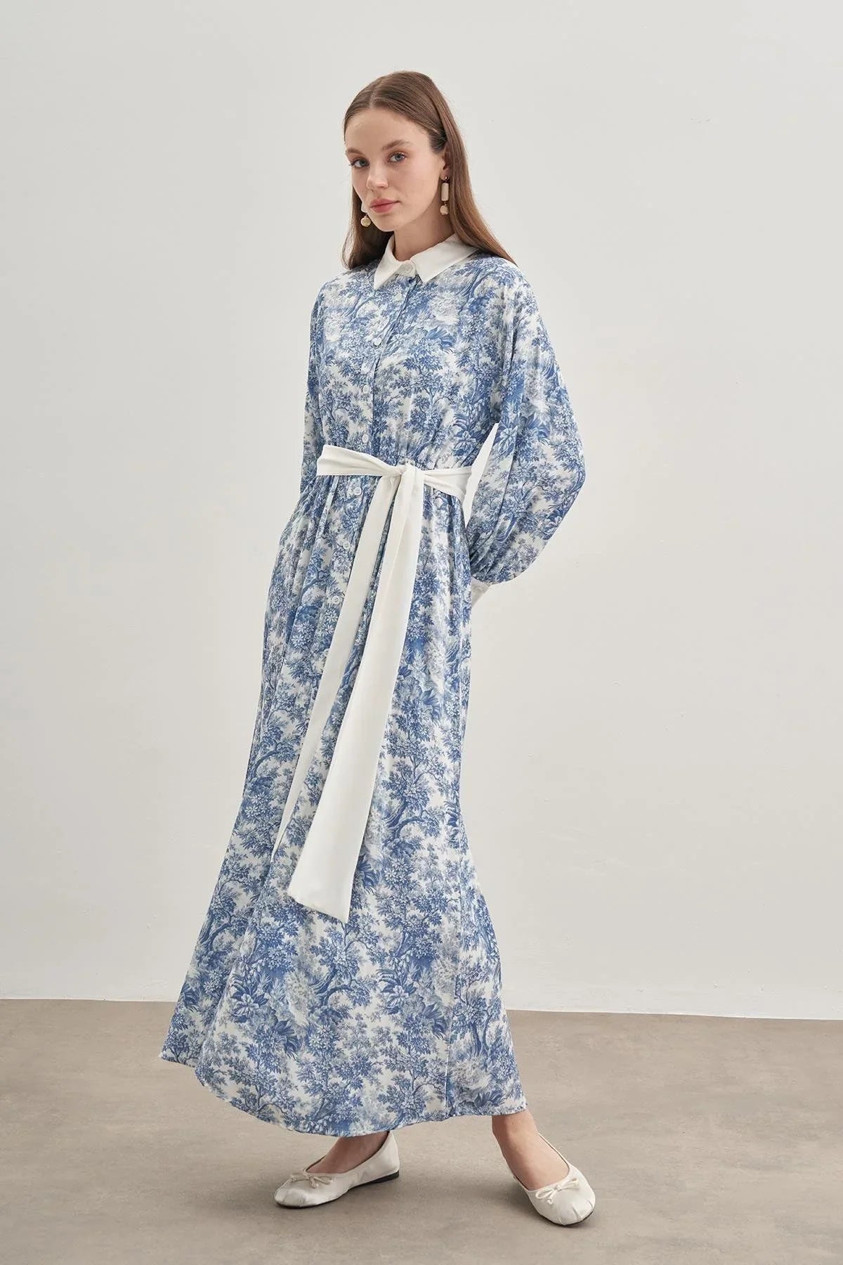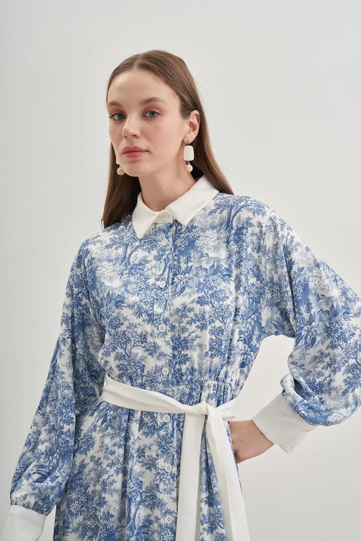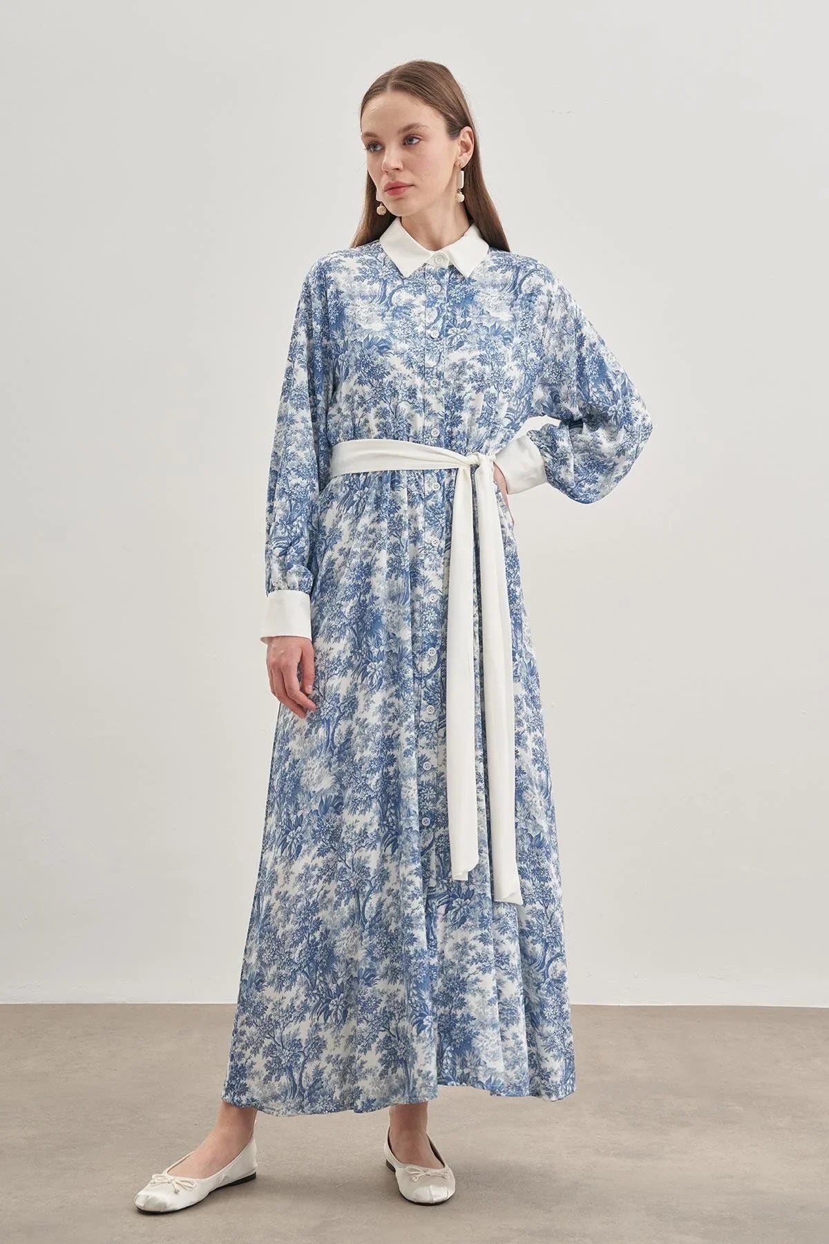 Gömlek yakalı, önden düğmeli, beli ince lastikli, manşetli, seyyar kemer detaylı, özel pigment boyalı %100 pamuk viscone dokuma kumaştan elbise.