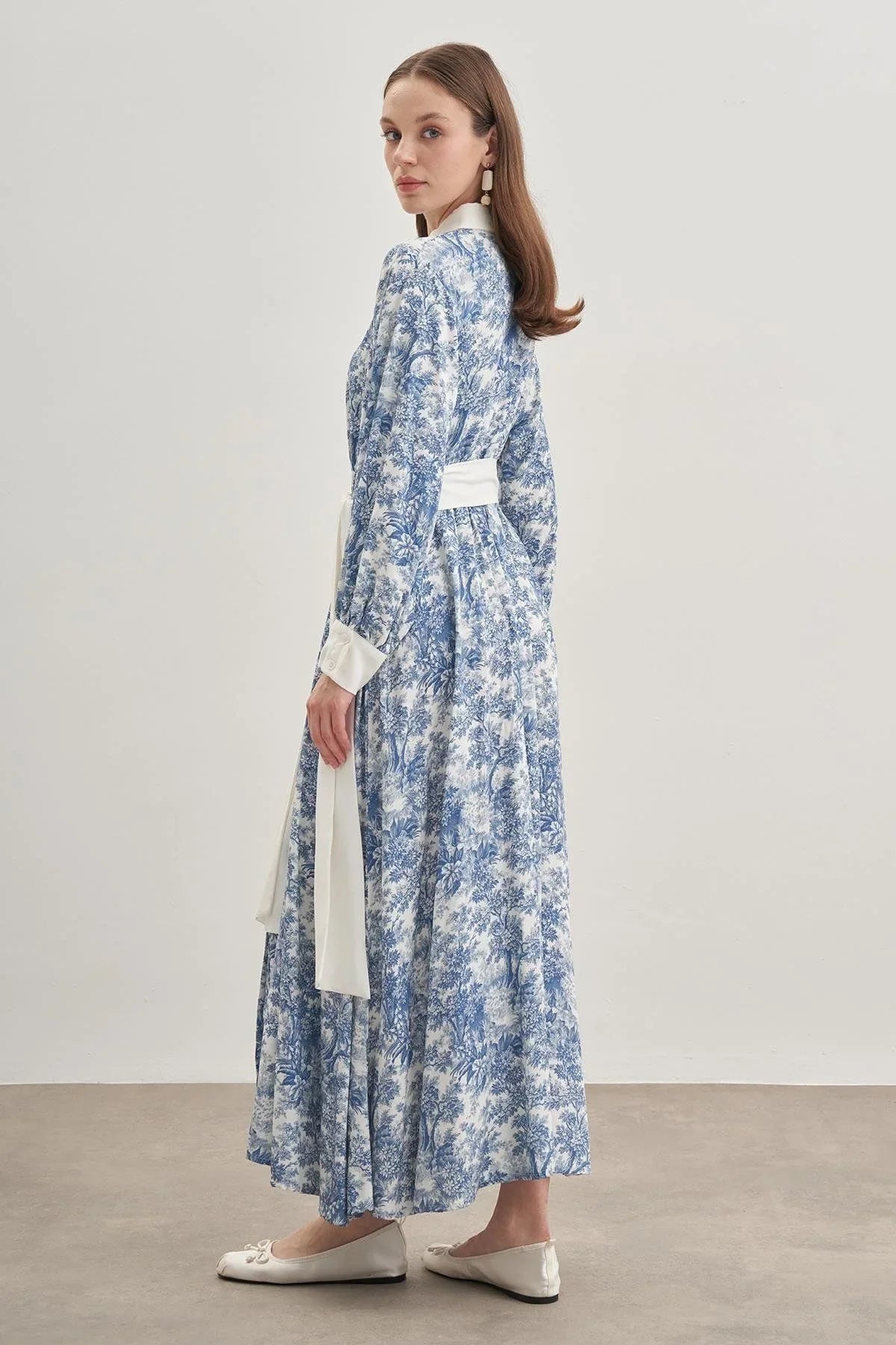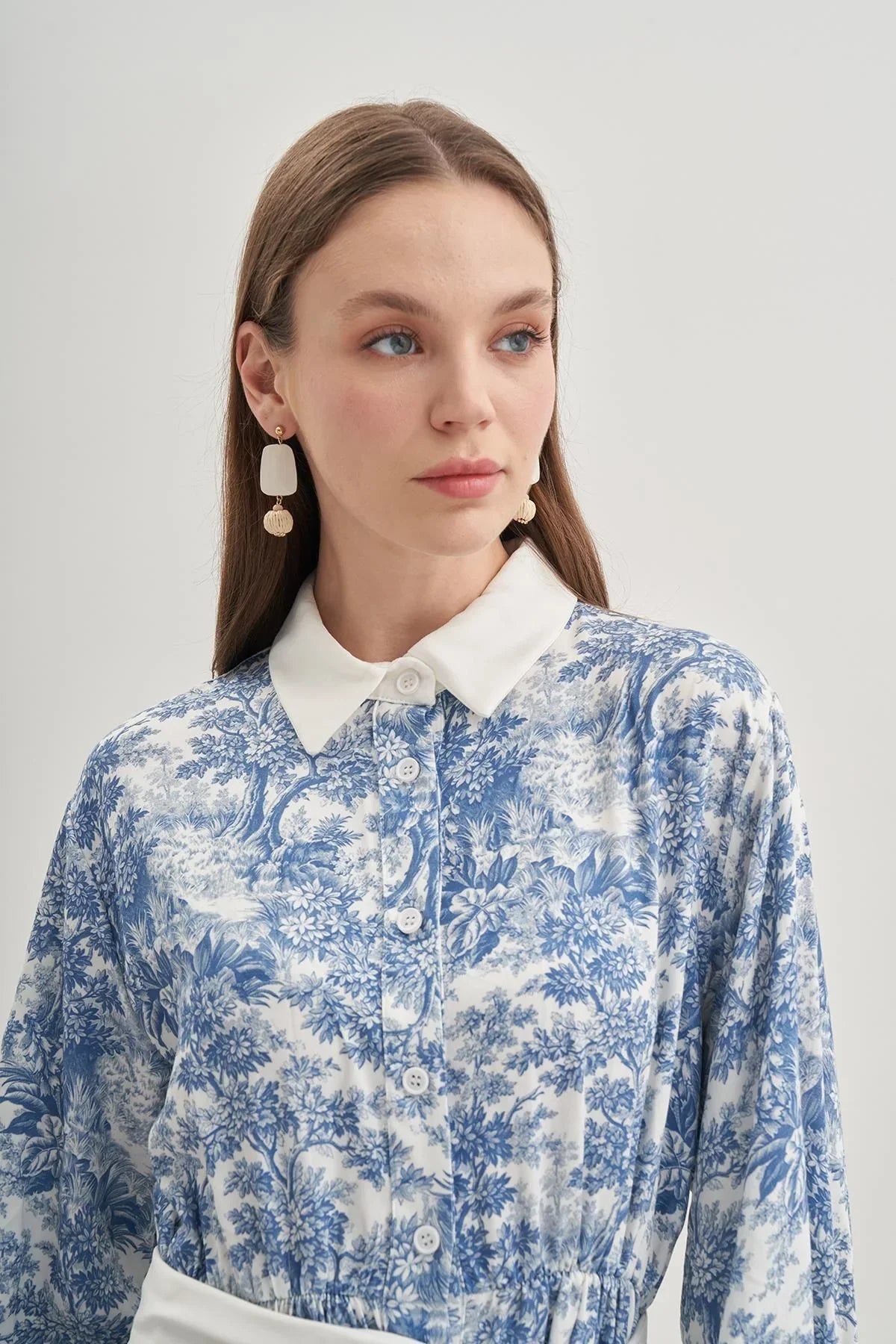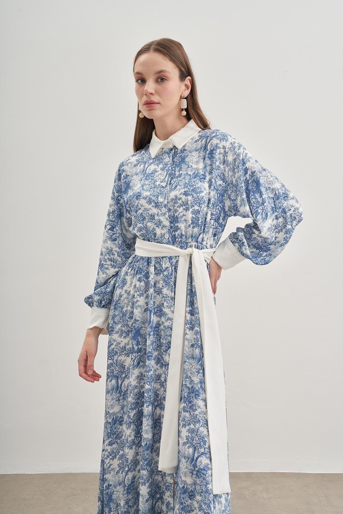 Gömlek yakalı, önden düğmeli, beli ince lastikli, manşetli, seyyar kemer detaylı, özel pigment boyalı %100 pamuk viscone dokuma kumaştan elbise.