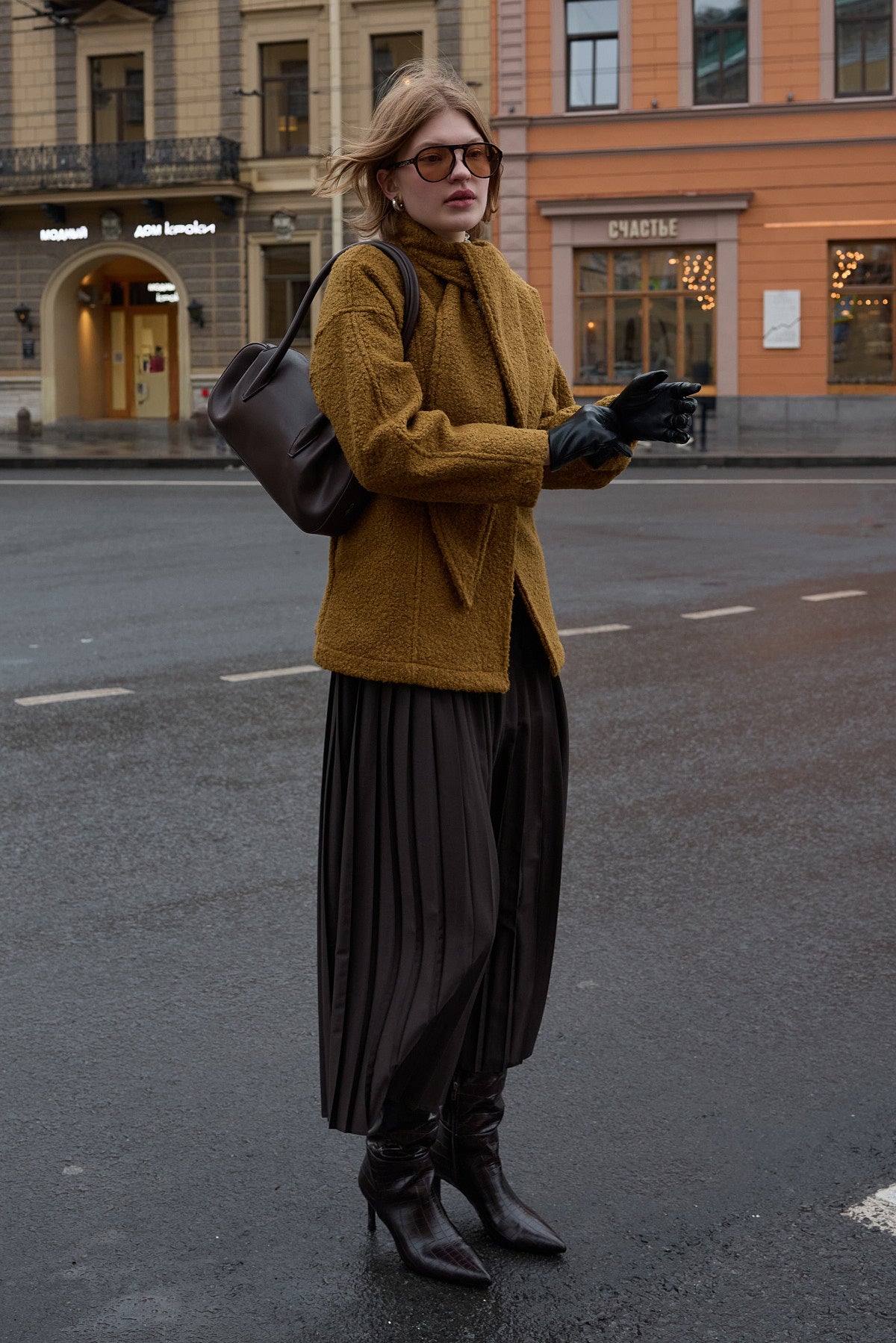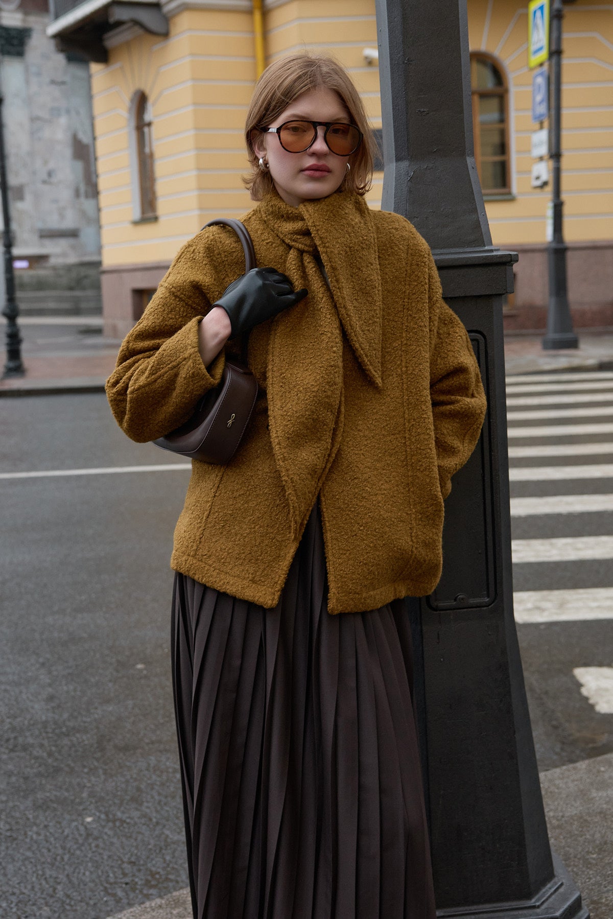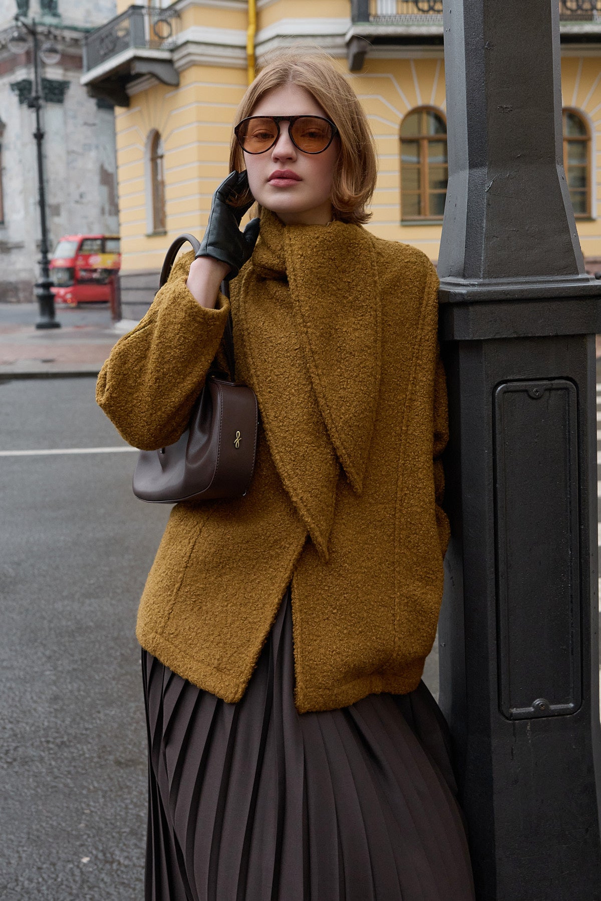 Fularlı Dokulu Kaşe Ceket Yağ Yeşili