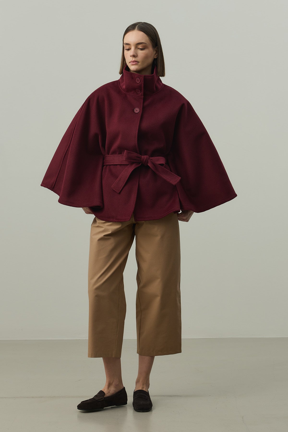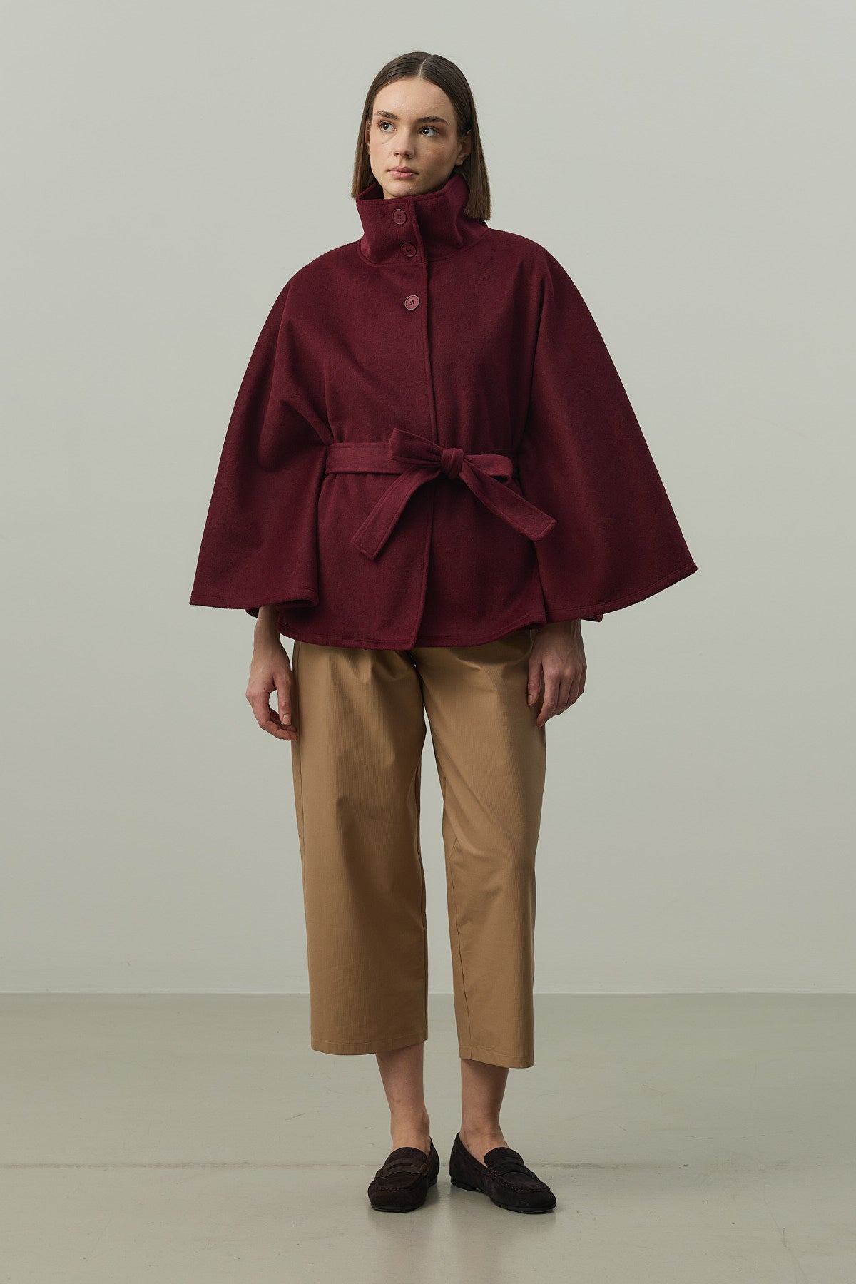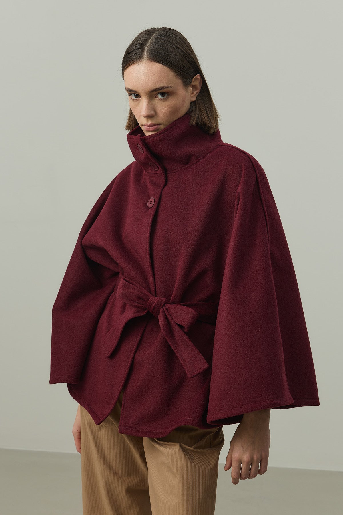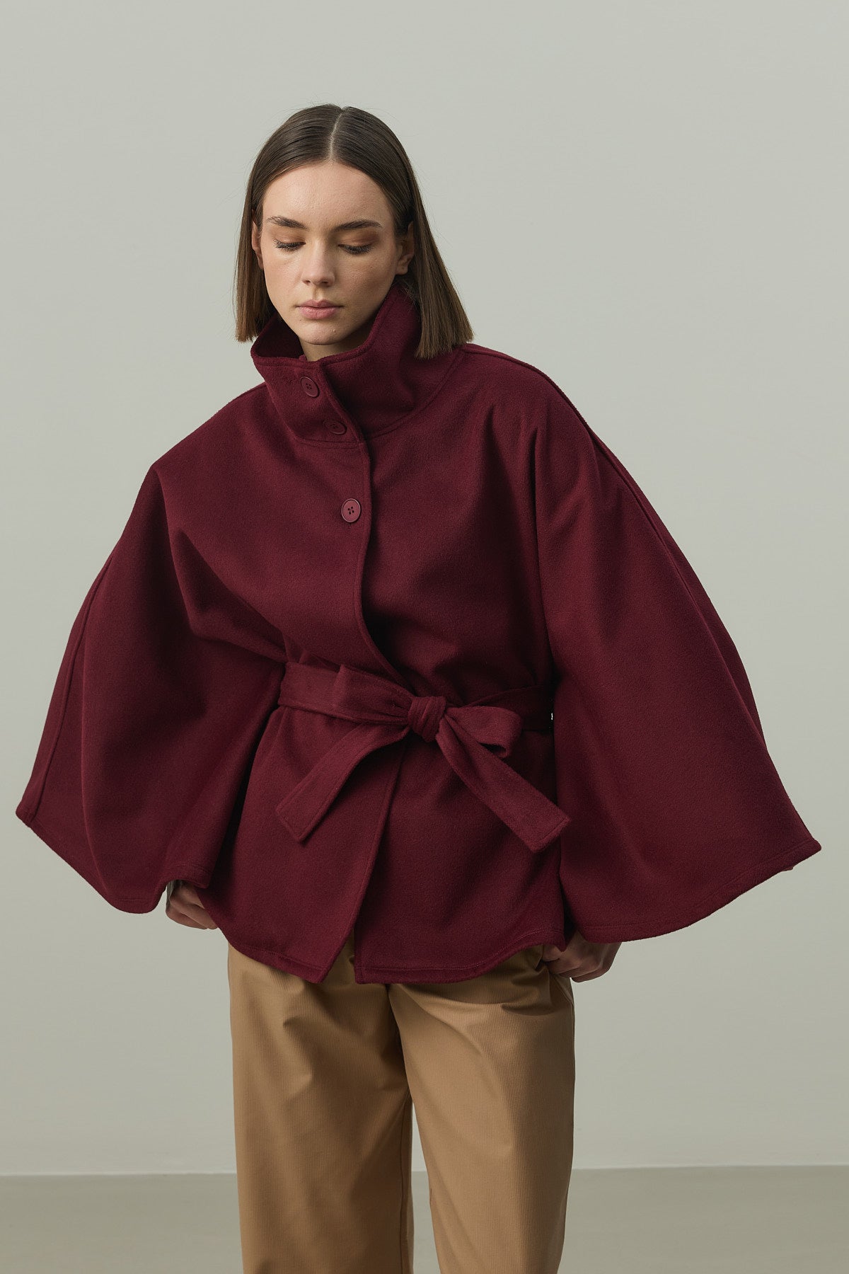 Dokuma kaşe kumaştan, önü düğme kapamalı, geniş boğazlı, astarlı, seyyar kemerli, geniş kollu, kaşe panço. STANDART Beden Uzunluk: 74 cm, Kol Genişliği: 38 cm, Bel Genişliği : 58 cm