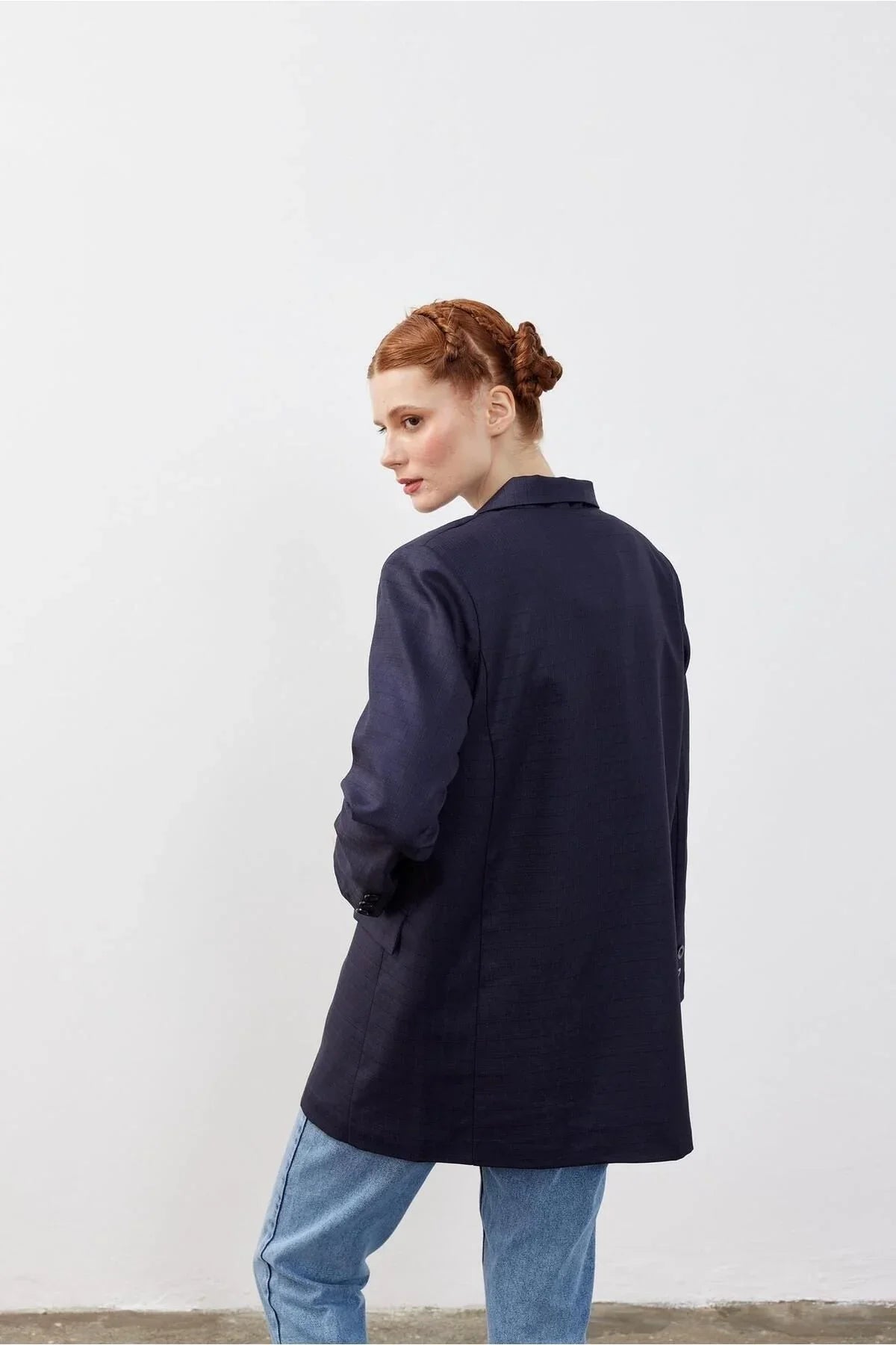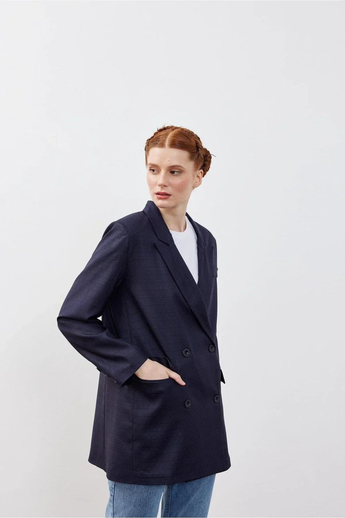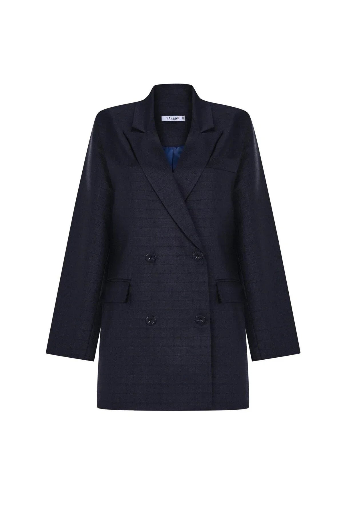 Kruvaze Oversize Blazer Ekose Lacivert Kareli