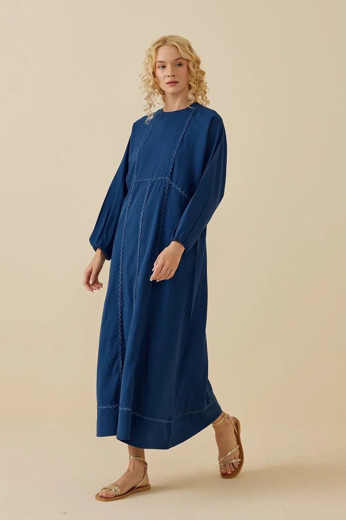 Keten karışımlı pamuk dokuma kumaştan, sutaşı detaylı, parça kesimli, bisiklet yakalı, arkadan fermuarl, kolağzı ince lastikli, maxi boy elbise.