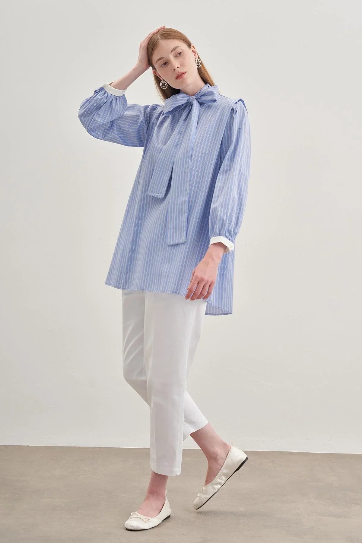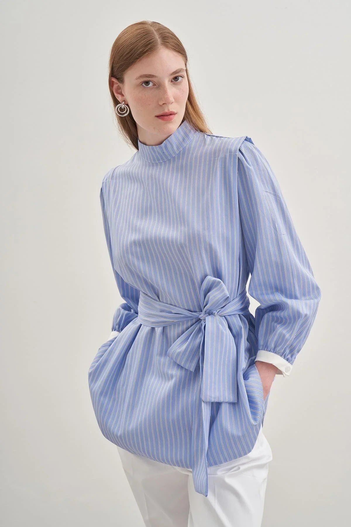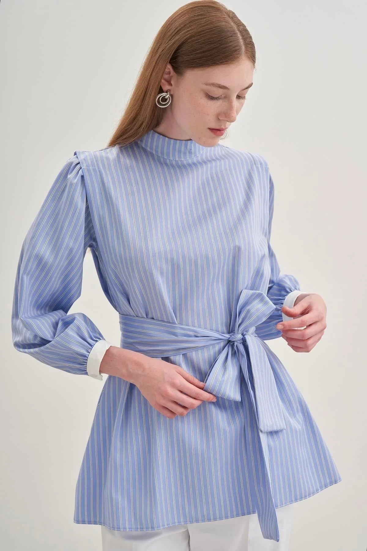 Seyyar Fularlı Kadın Gömlek Çizgili Açık Mavi