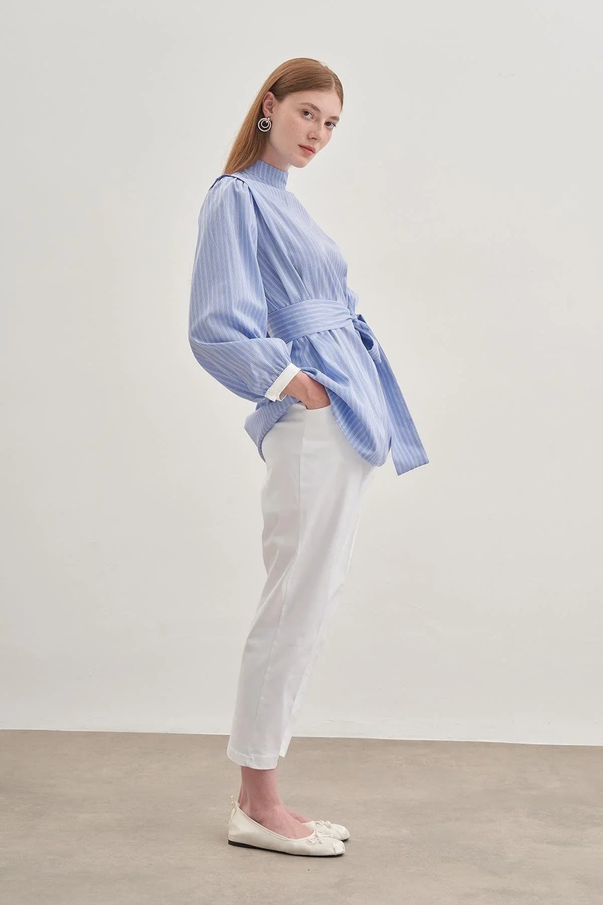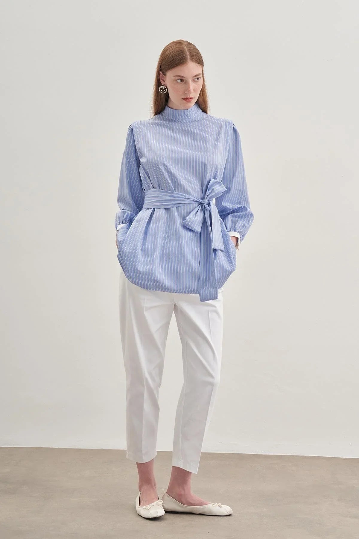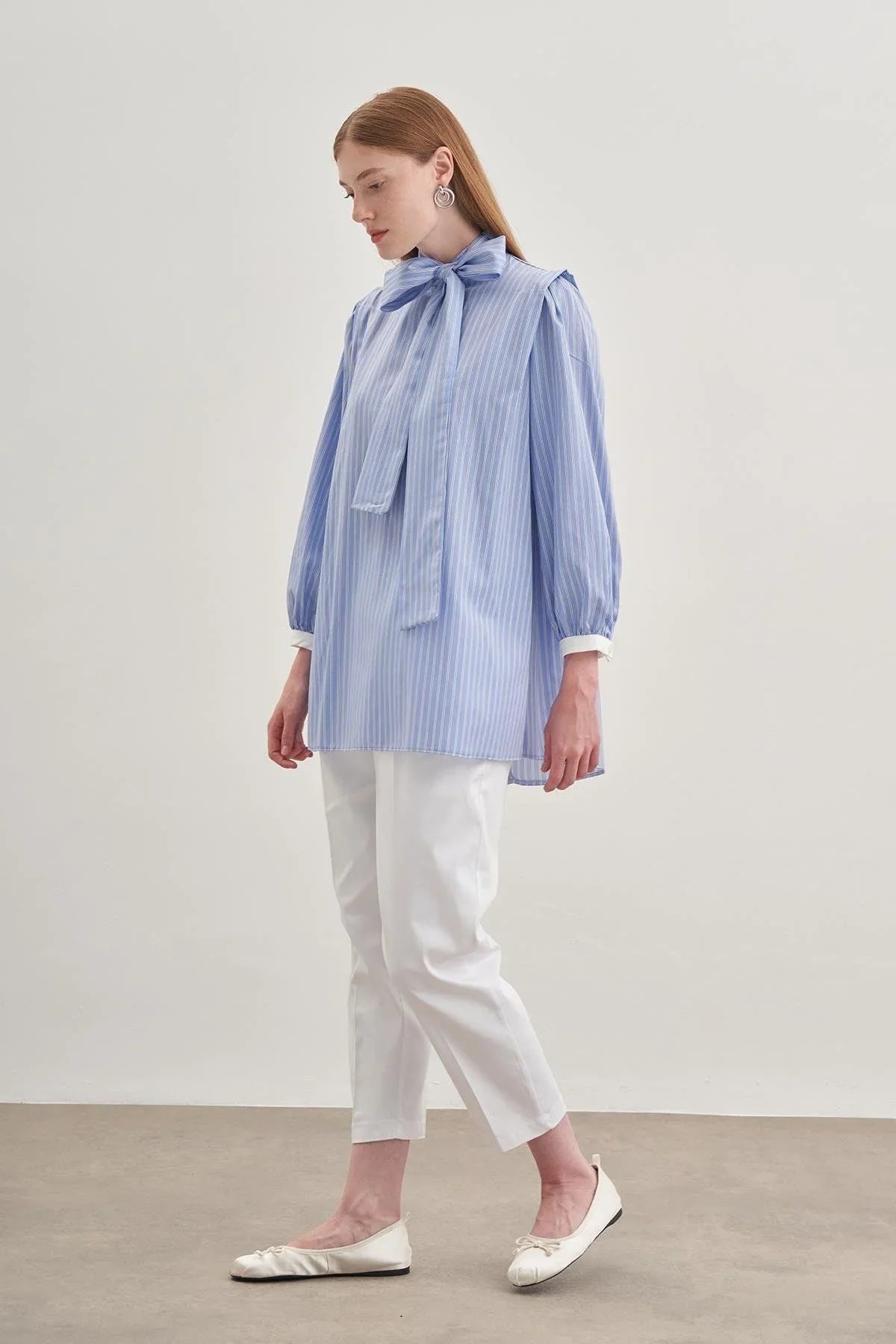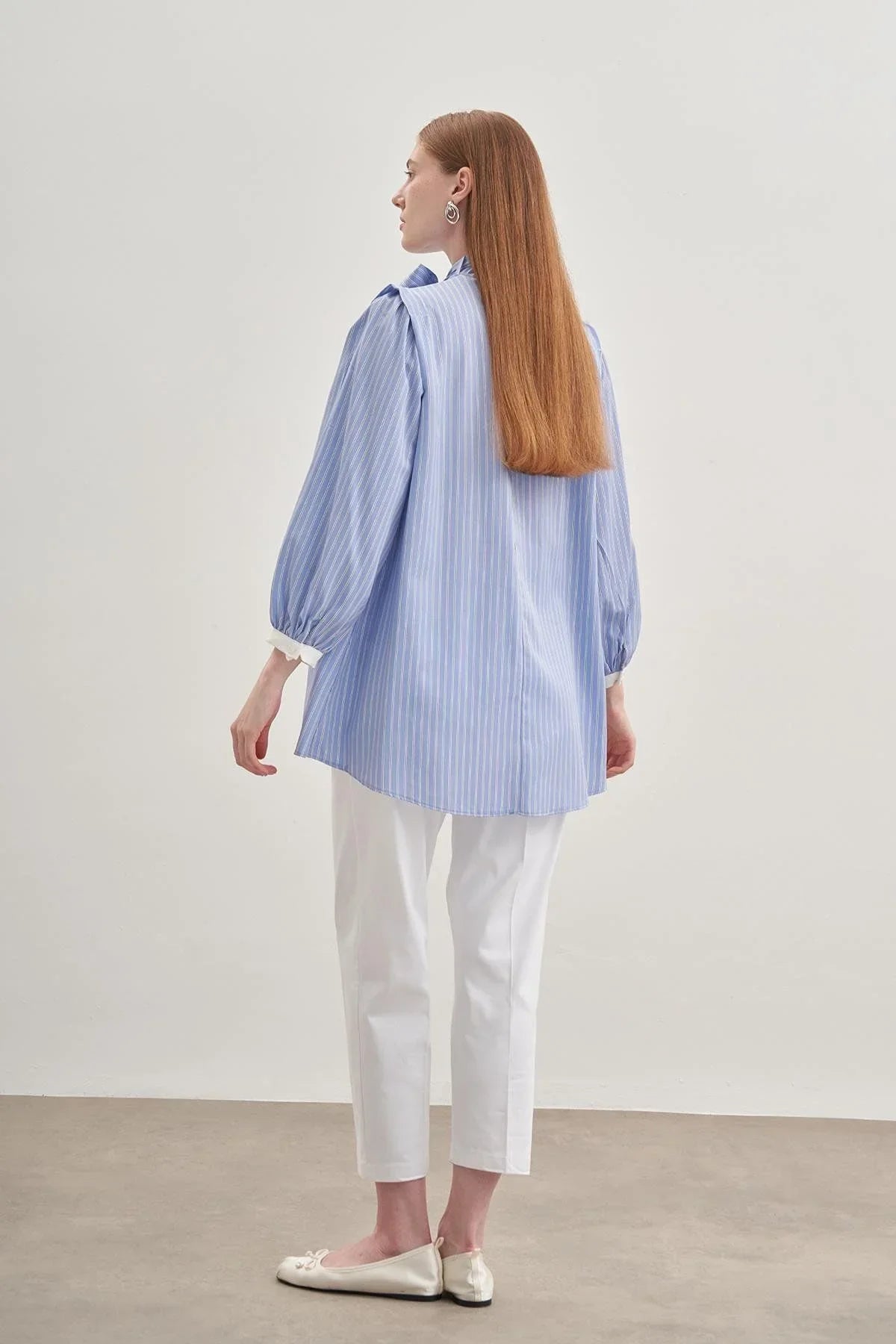 Seyyar Fularlı Kadın Gömlek Çizgili Açık Mavi