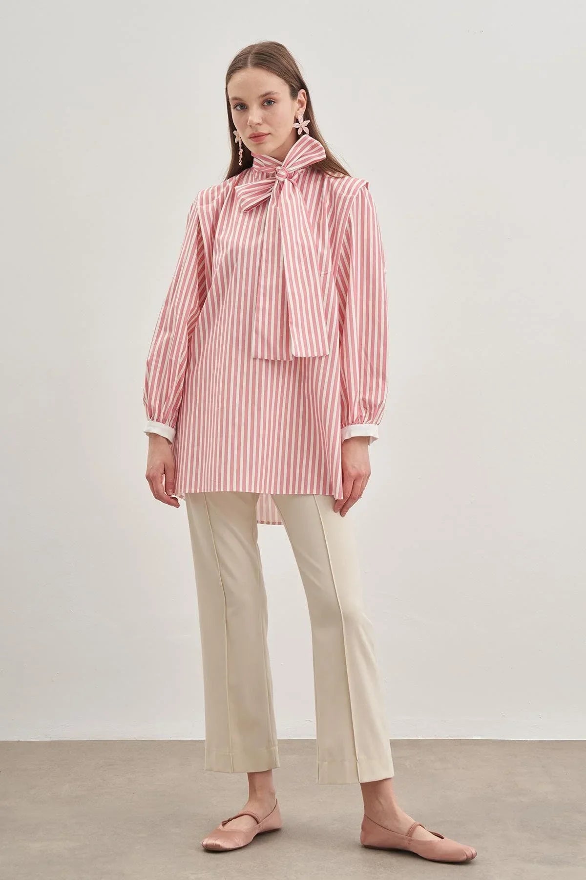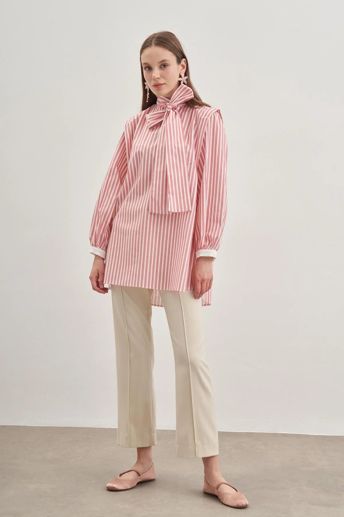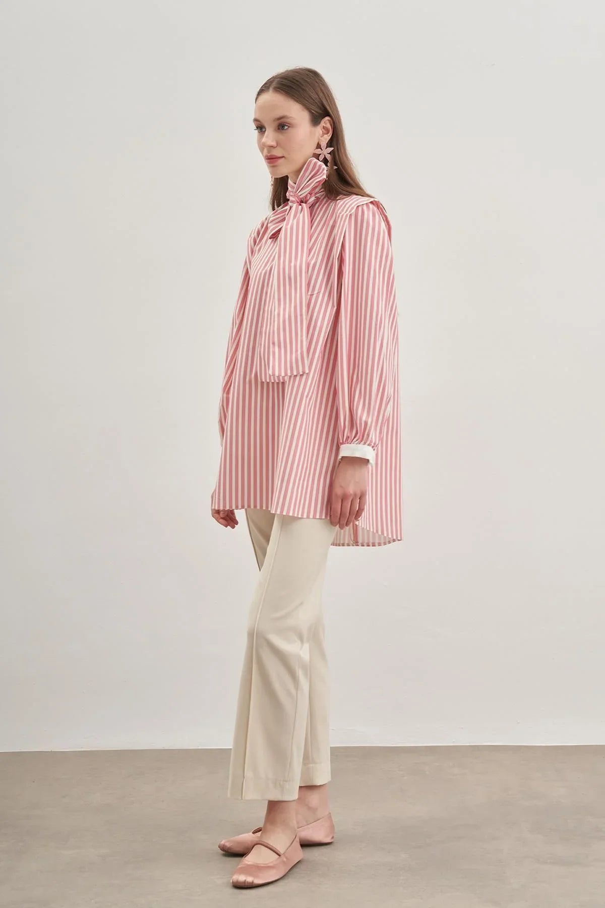 Seyyar Fularlı Kadın Gömlek Çizgili Açık Pembe