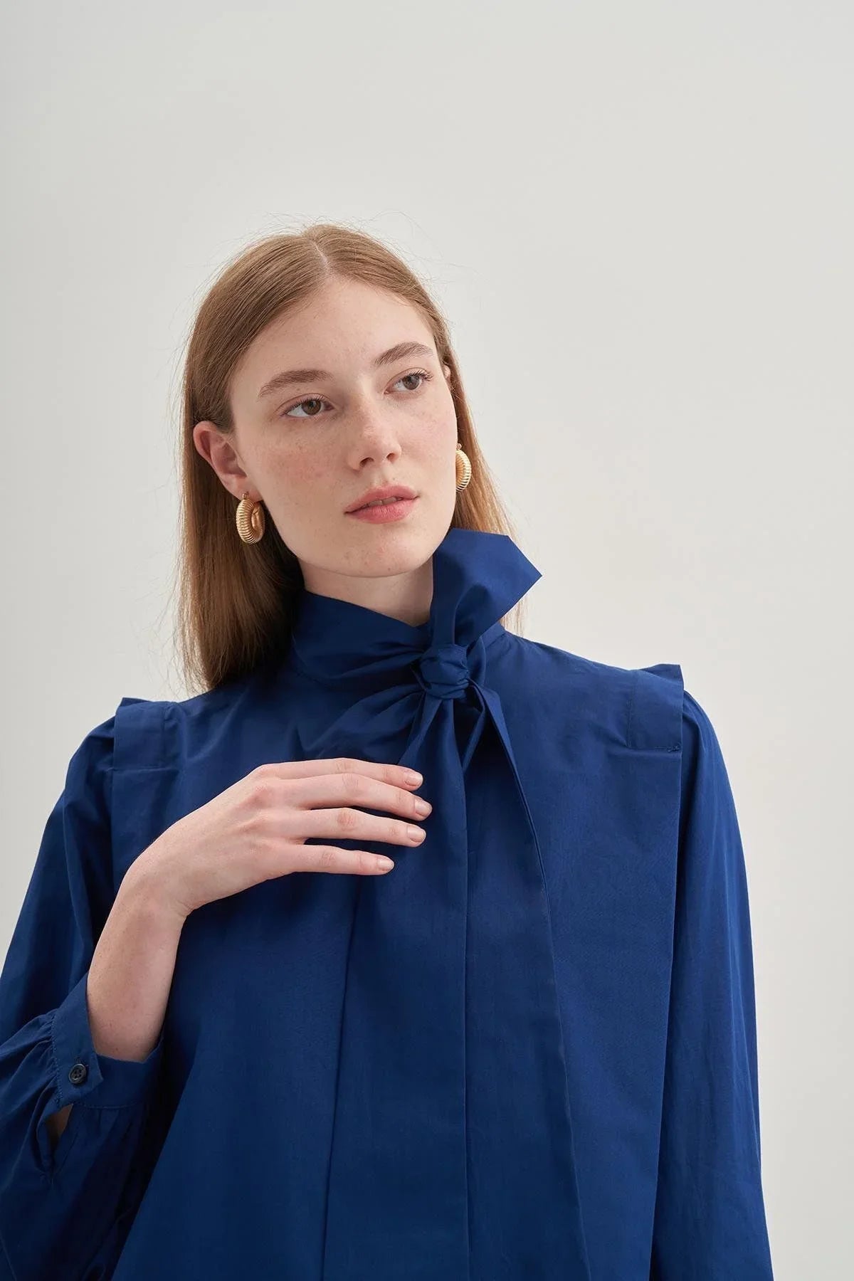 Hakim yakalı, arkadan fermuarlı, ince manşetli, %100 pamuk poplin dokuma kumaştan, ister boyunda ister belde kullanılabilen seyyar kemerli, omuzları kat detaylı gömlek.