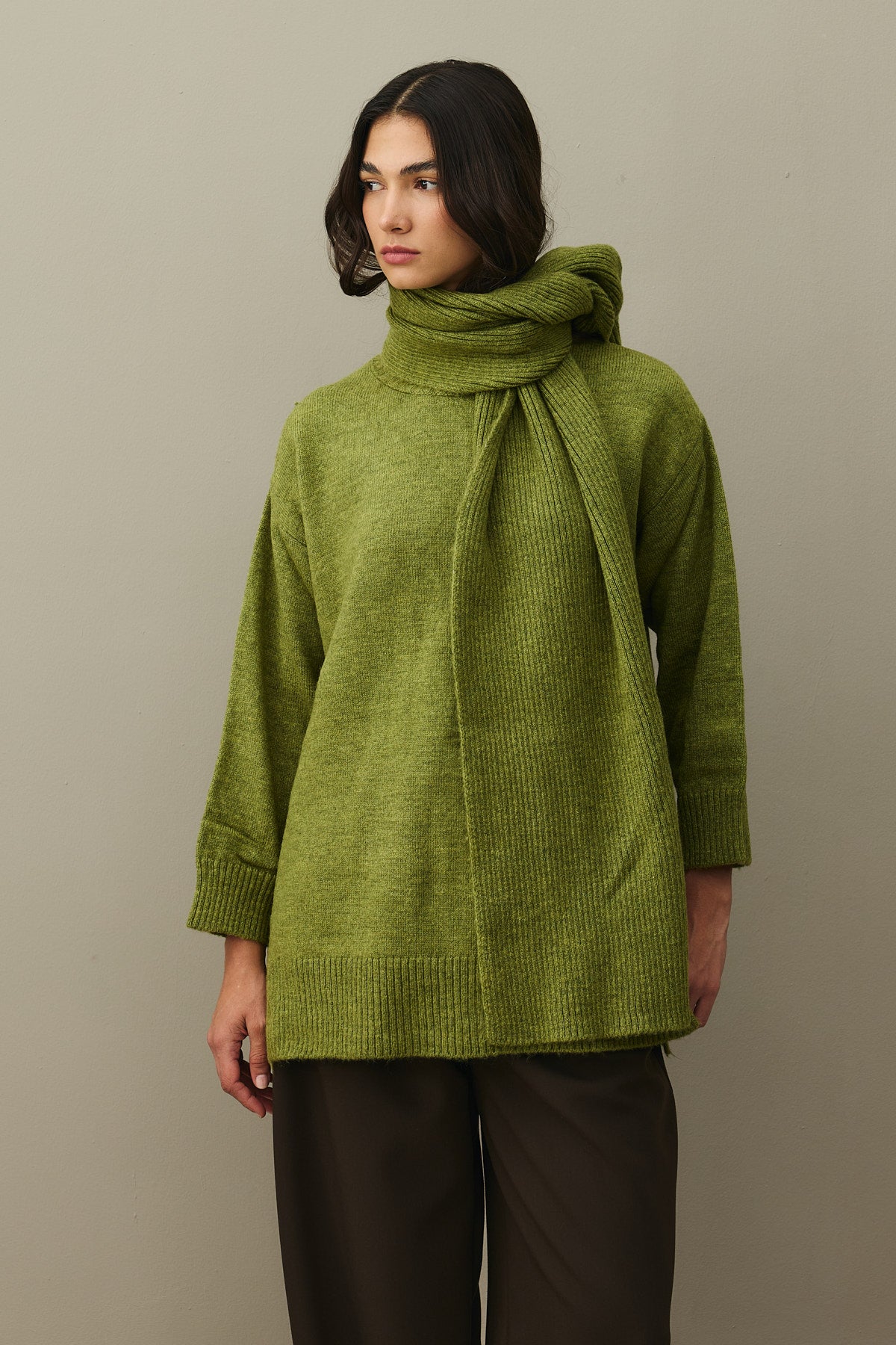İnce lastik örgü yakalı, tiftik karışımlı sık dokuma iplikten, kolağzı ve etek ucu lastik örgü, yanları yırtmaç detaylı, selanik örgülü atkılı kazak.; STANDART Beden Uzunluk: 73 cm, Göğüs: 58 cm, Bel: 56 cm, Kol Uzunluğu: 49 cm, İki Omuz Arası Mesafe: 54 cm.; Atkı Boyu:188 cm, Atkı Eni: 33 cm