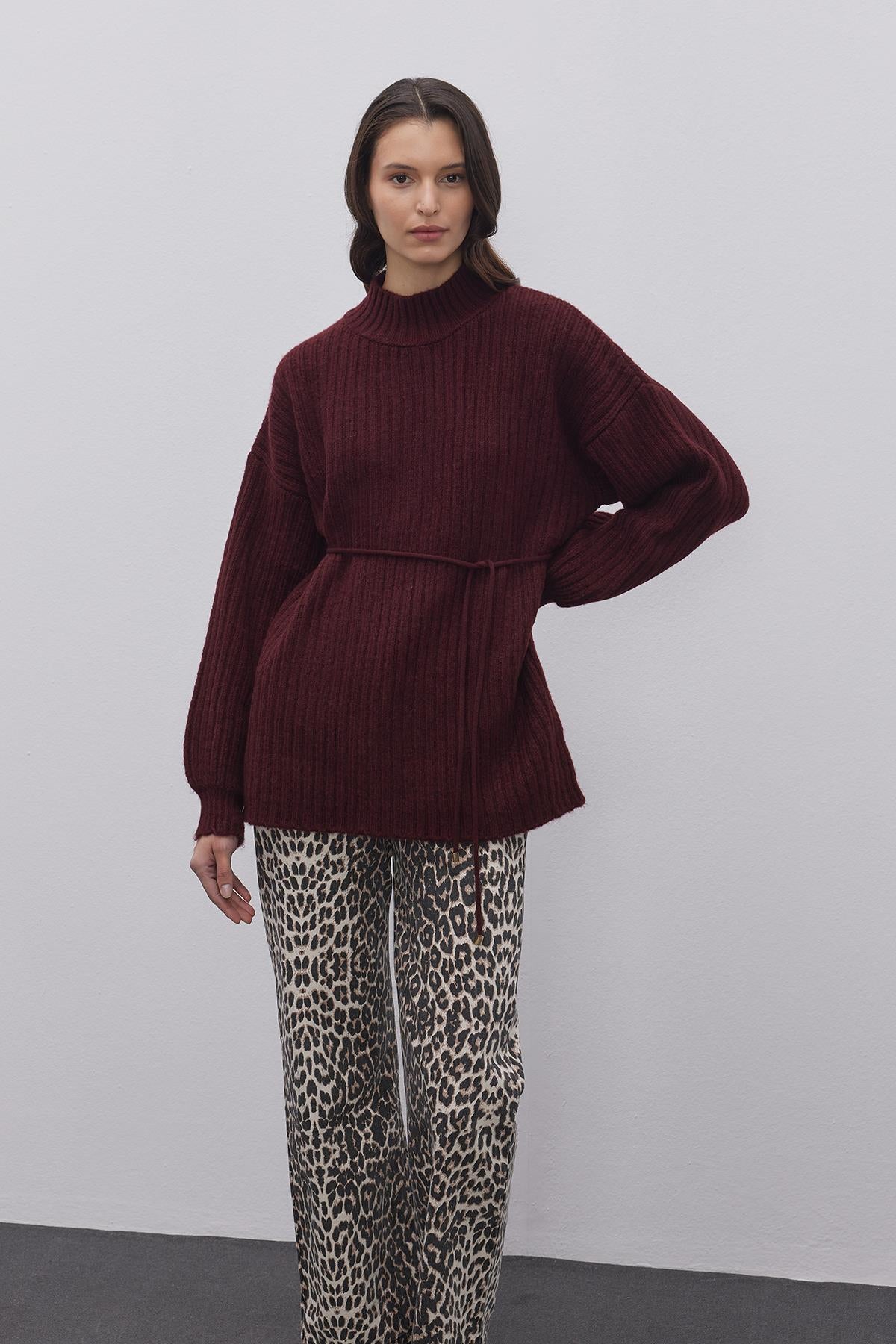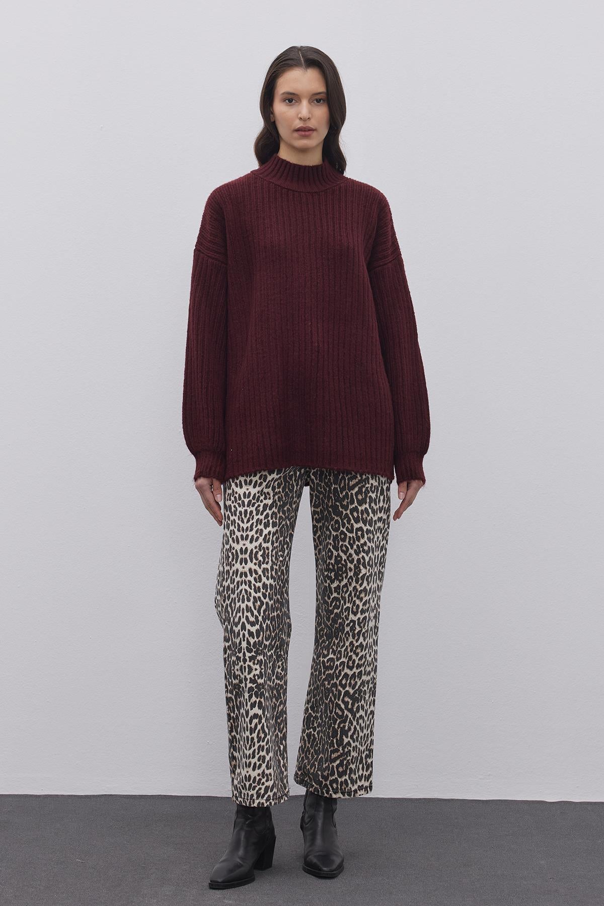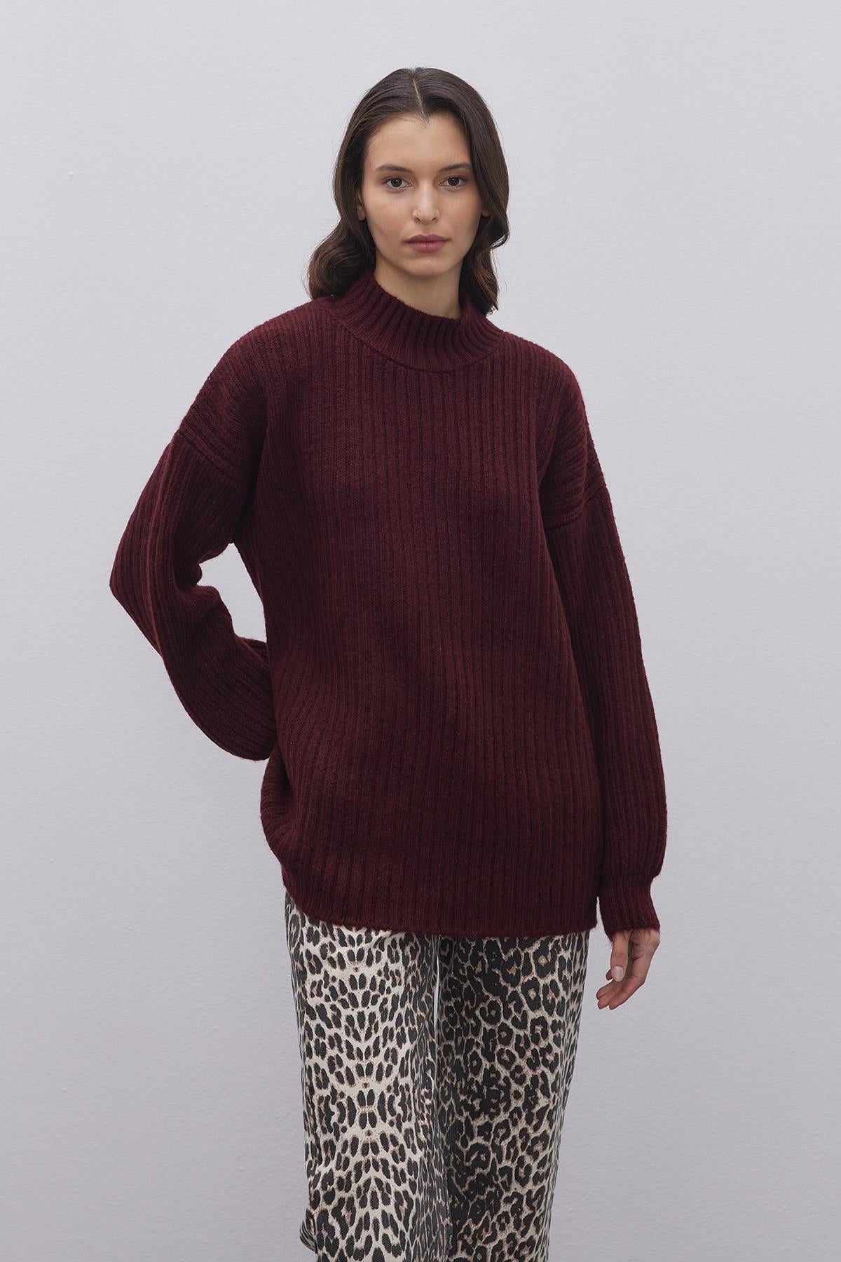 Çizgi Dokuma Basic Kazak Bordo