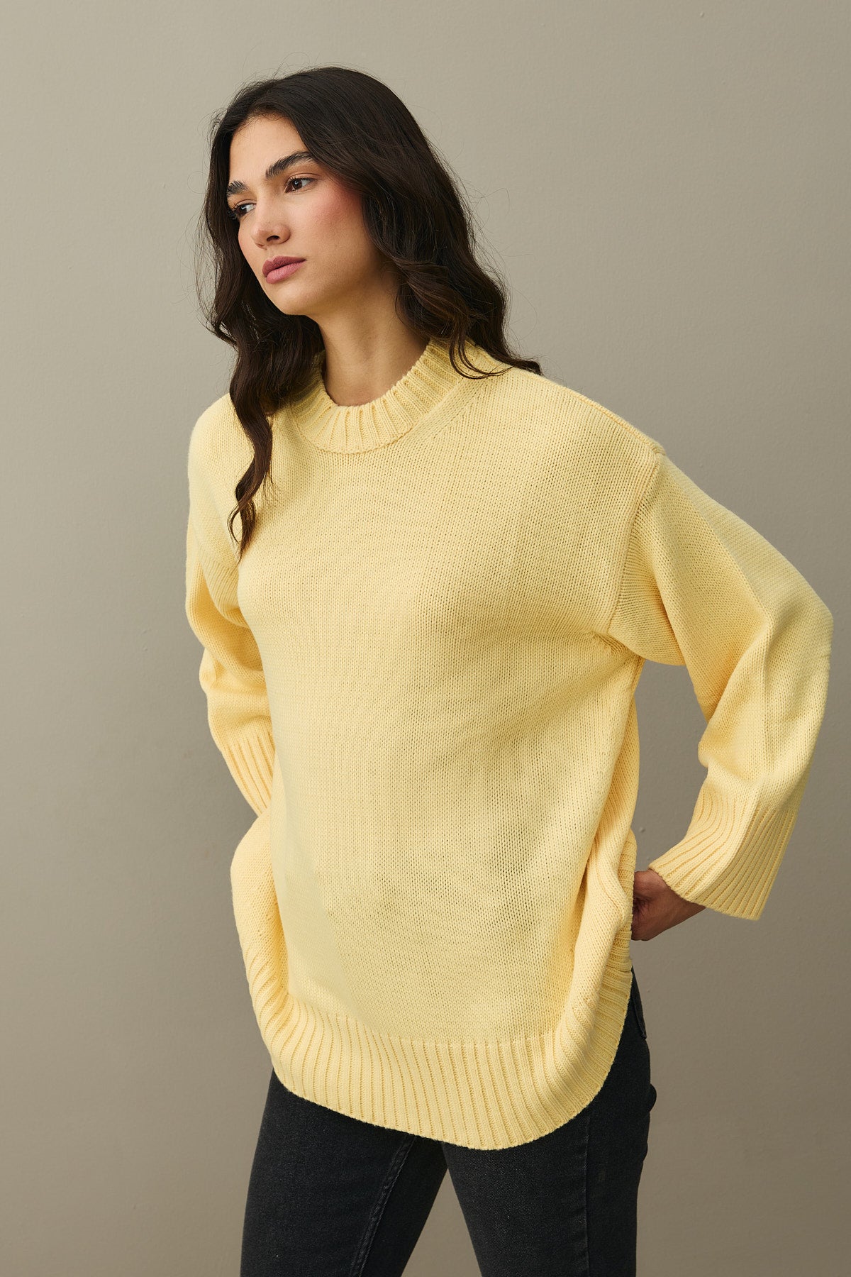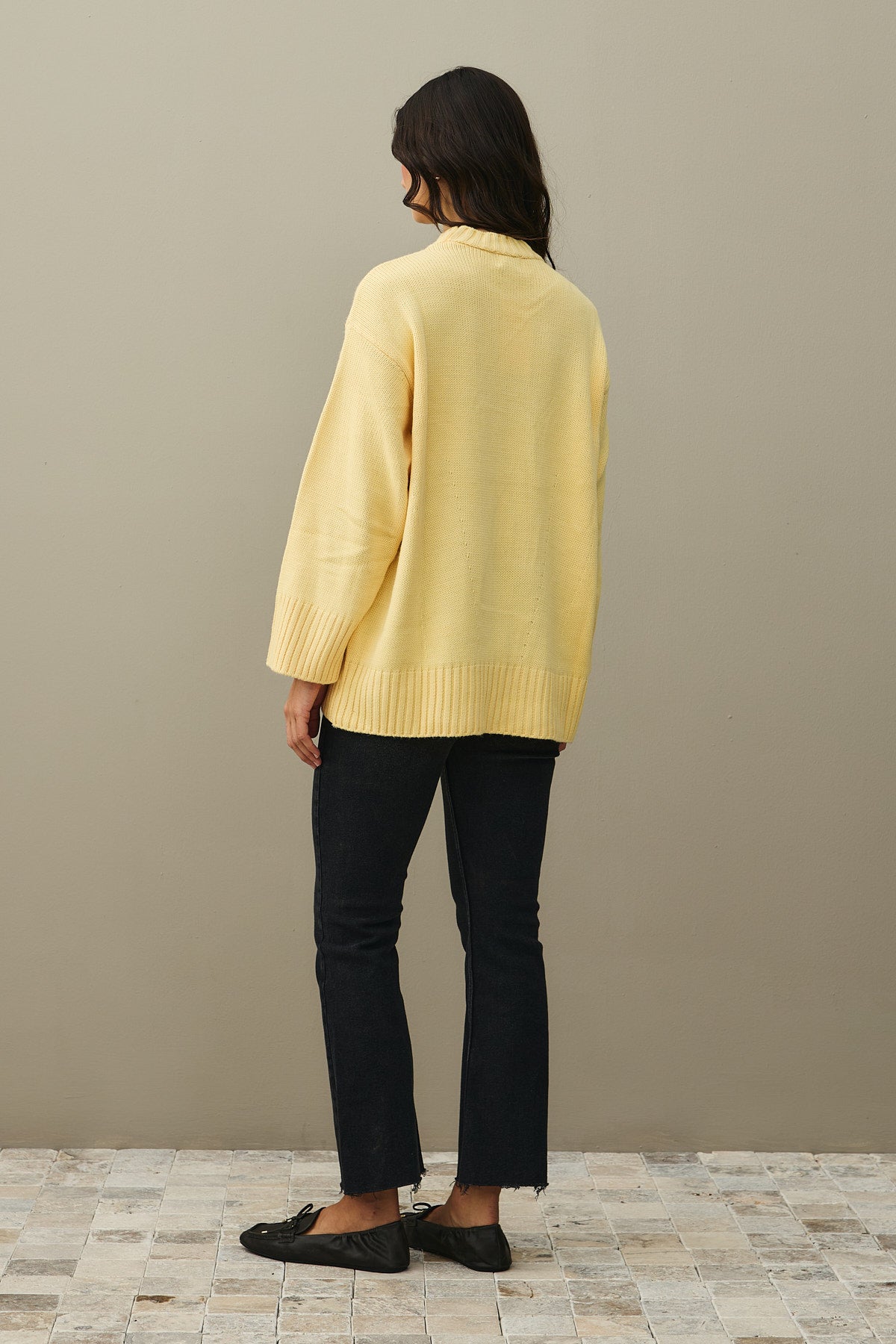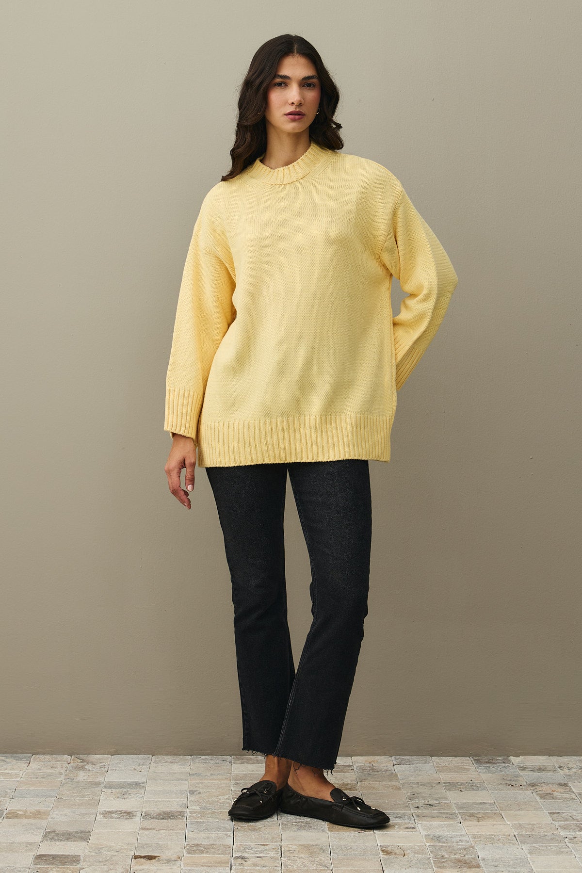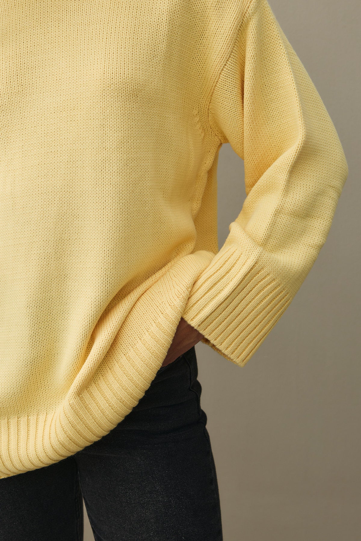 Örme trikodan, yarım balıkçı yakalı, uzun kollu, manşetleri ve etek ucu lastik örgülü, oversize kalıplı kazak