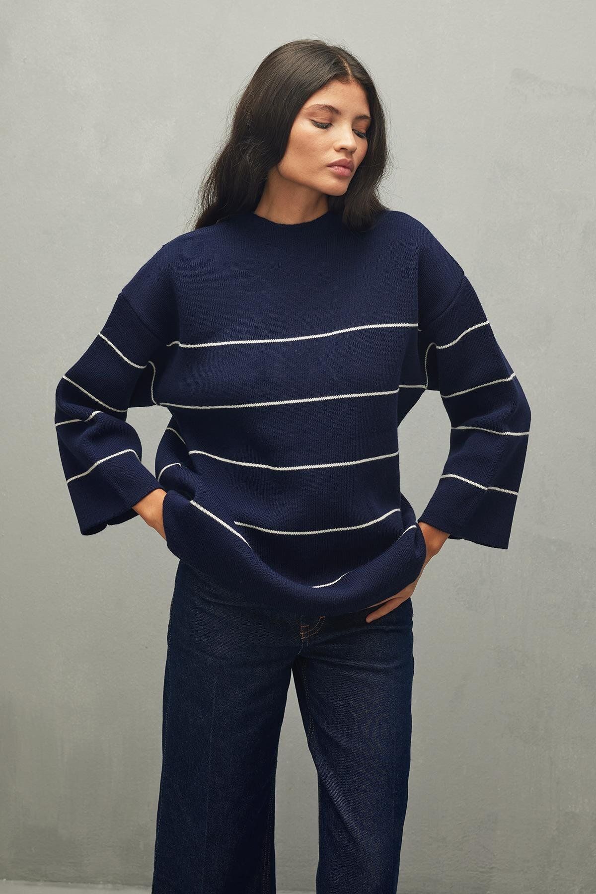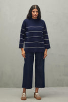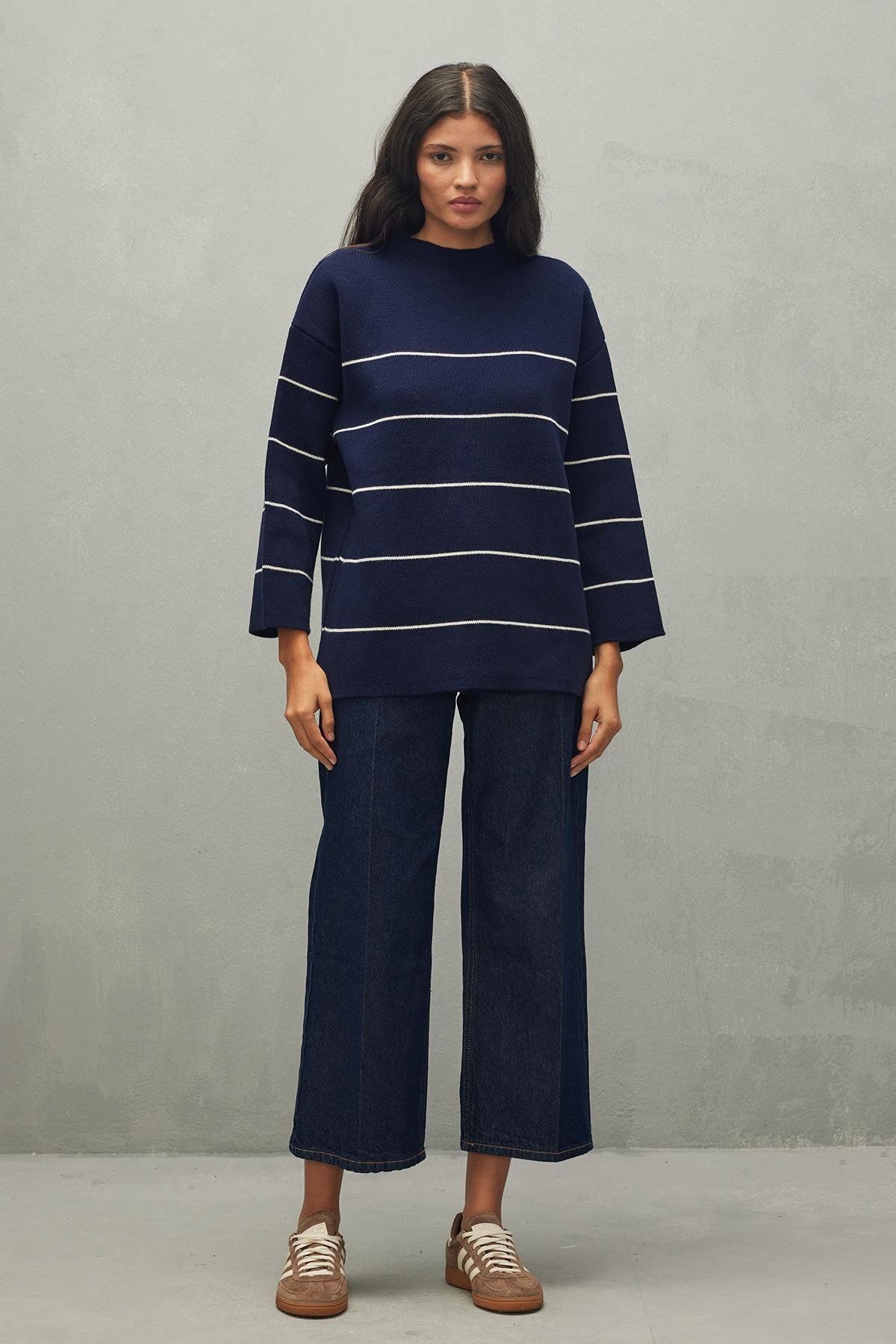 Tiftikli Oversize Çizgili Kazak Lacivert