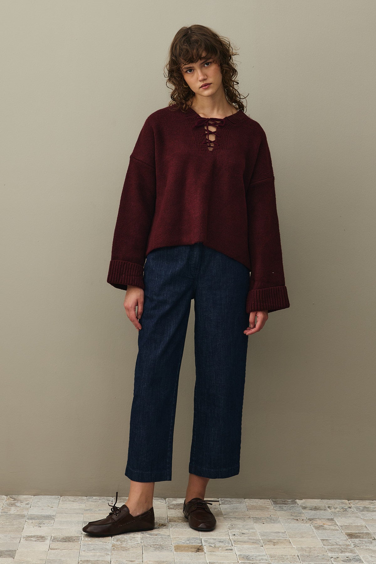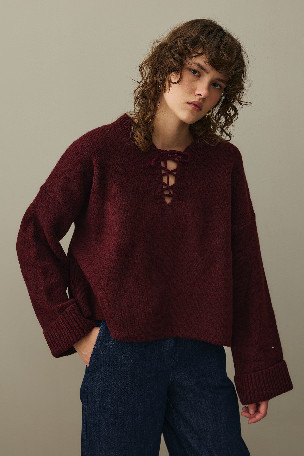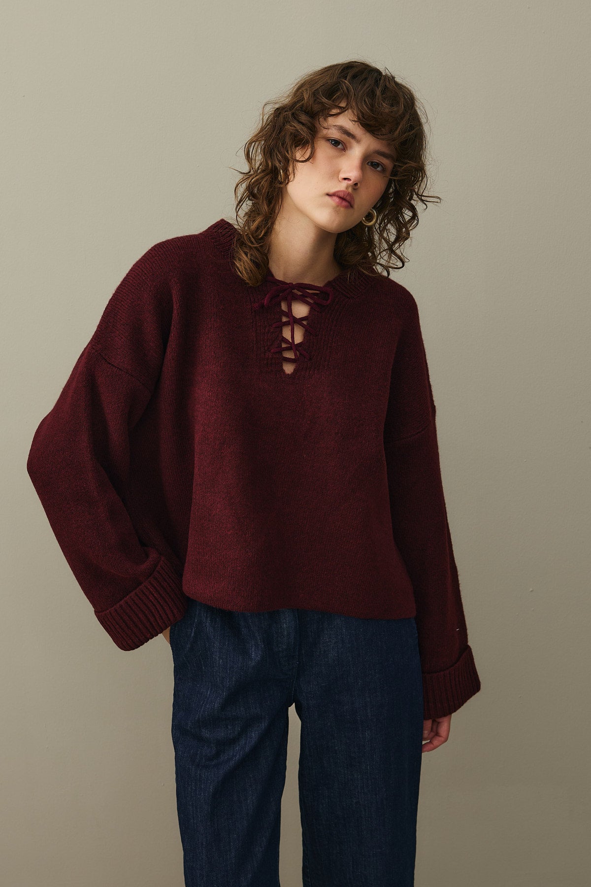 Sık örme trikodan, önü ilik ve bağcıklı, uzun kollu kazak