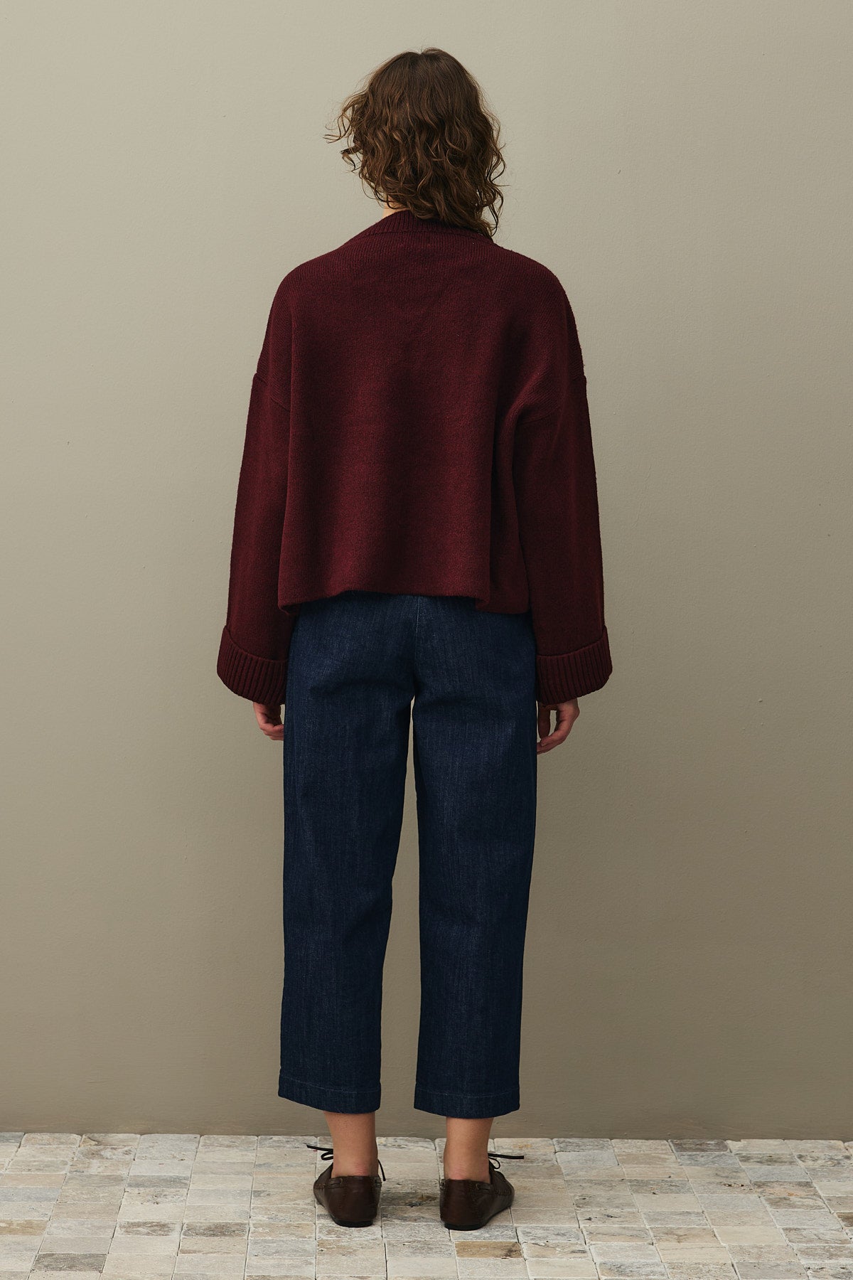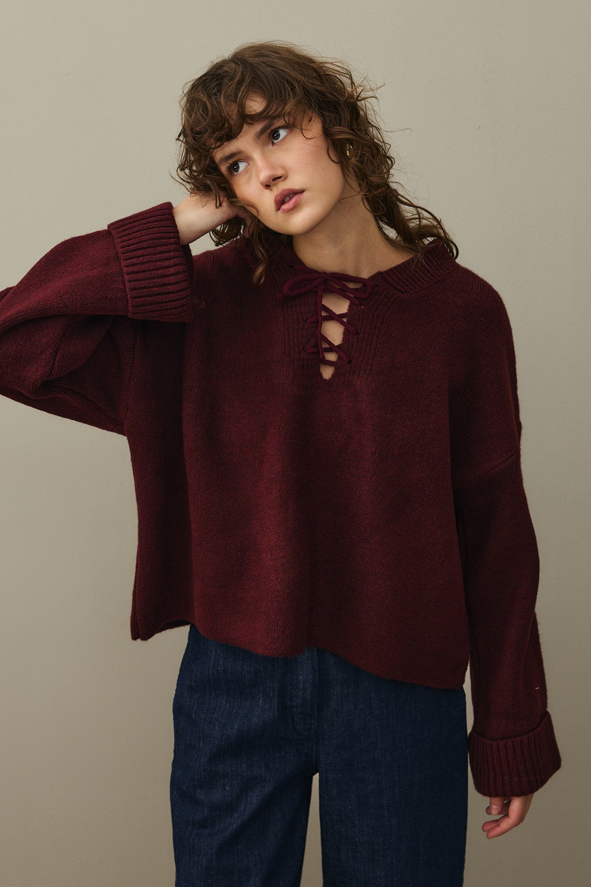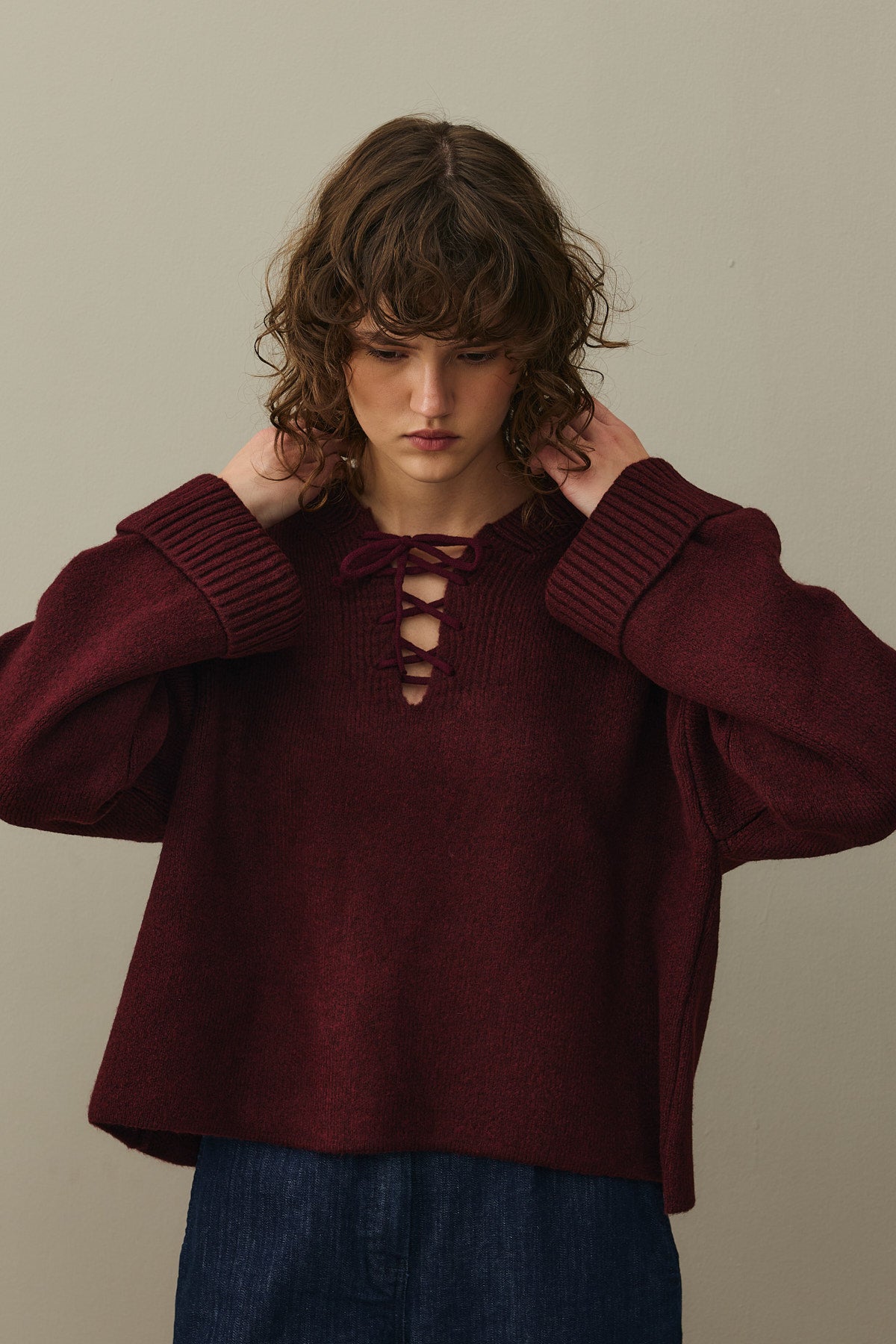 Sık örme trikodan, önü ilik ve bağcıklı, uzun kollu kazak