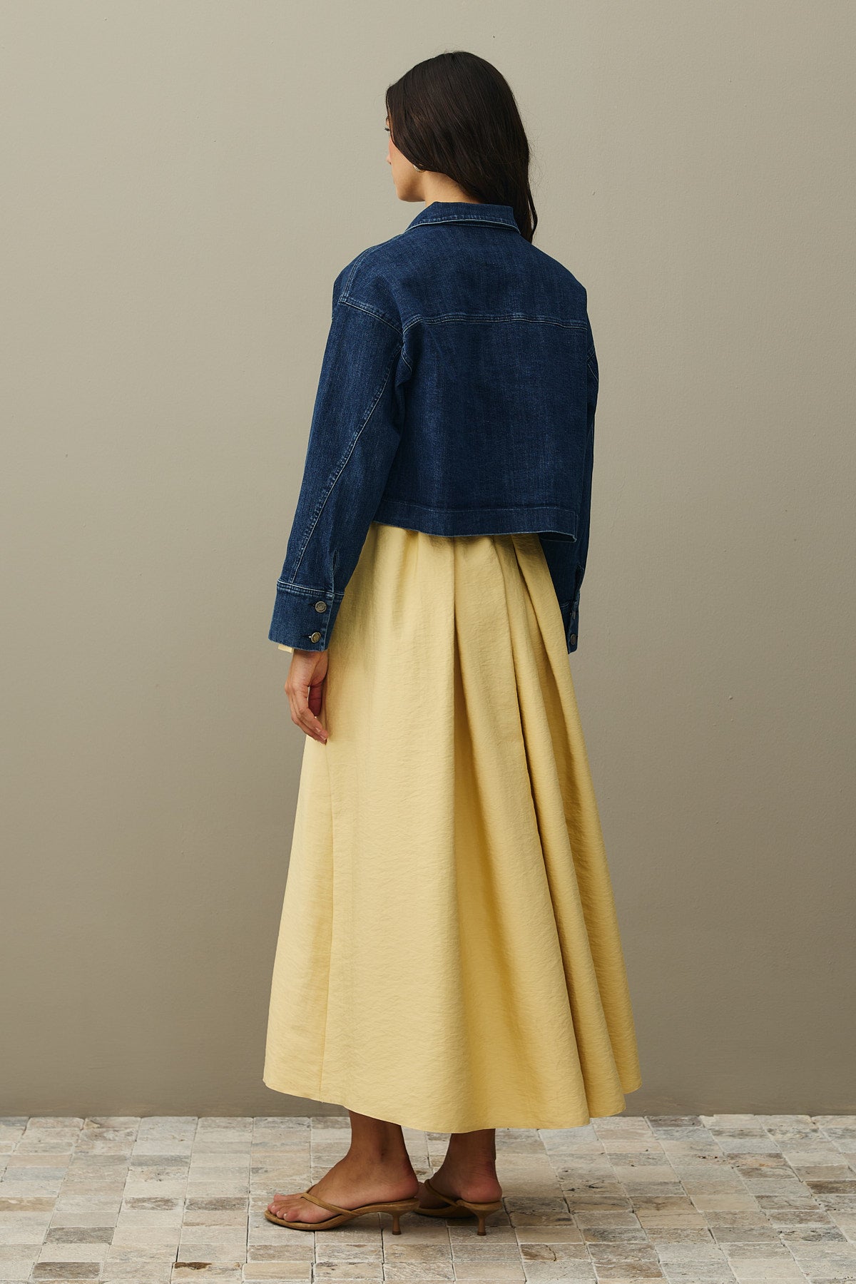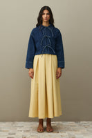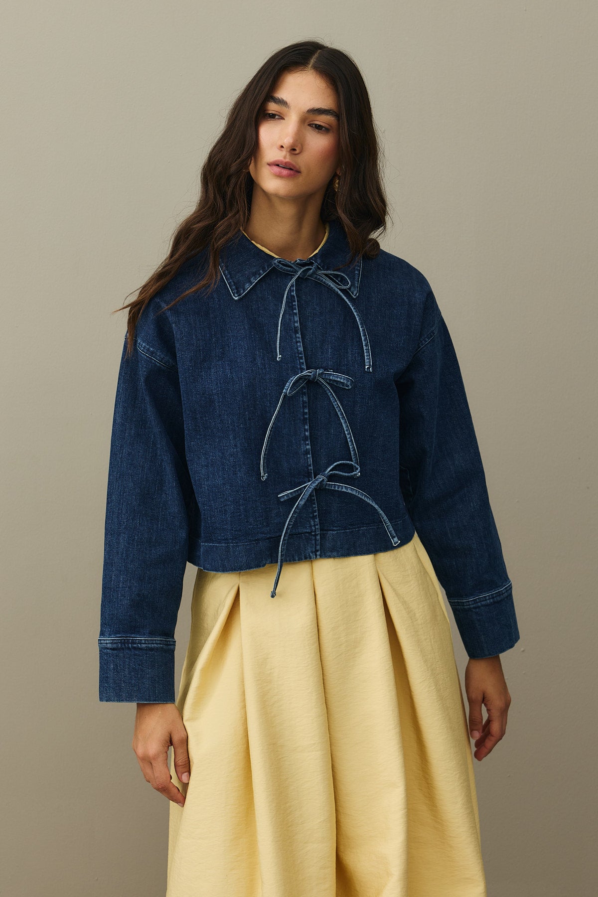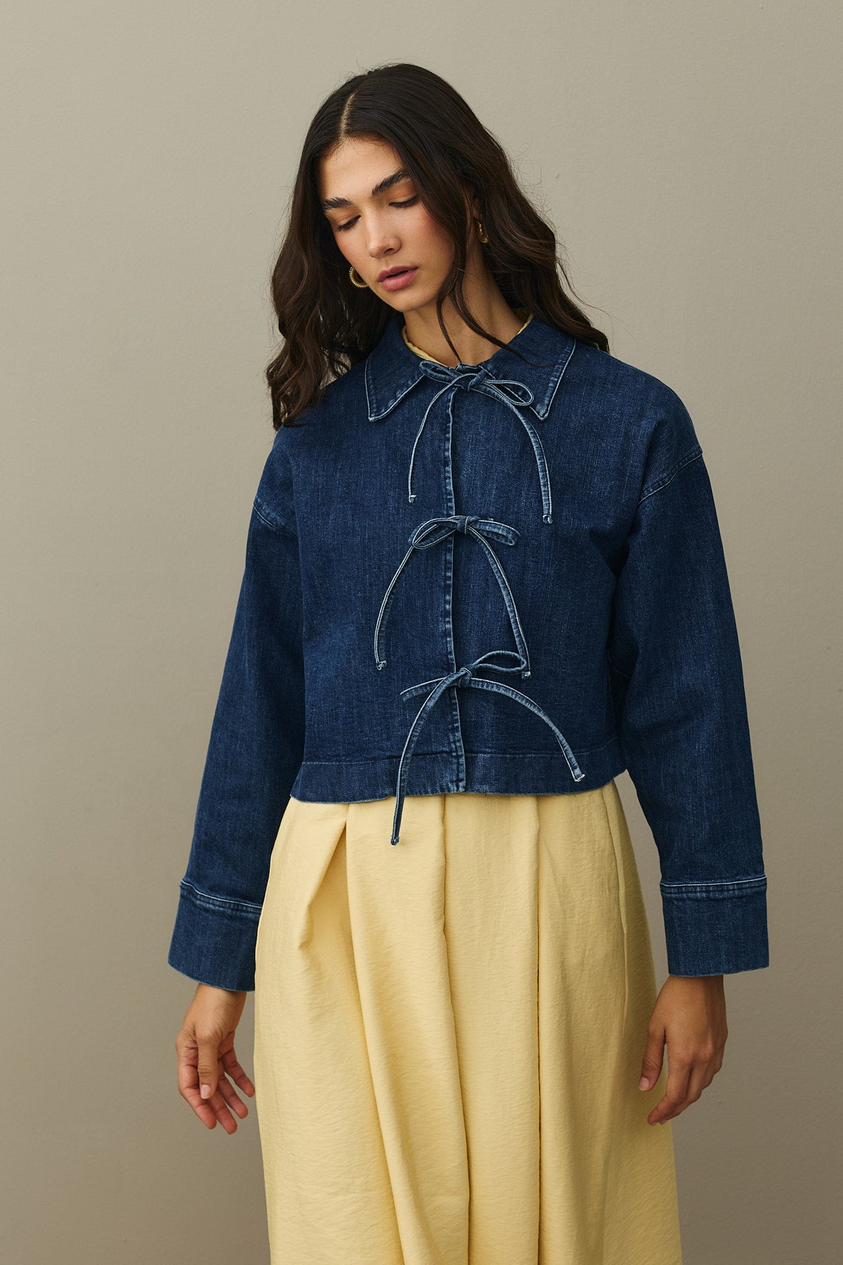Pamuklu kot kumaştan, yakalı, önü bağcık detaylı, cepli, rahat kesim denim ceket