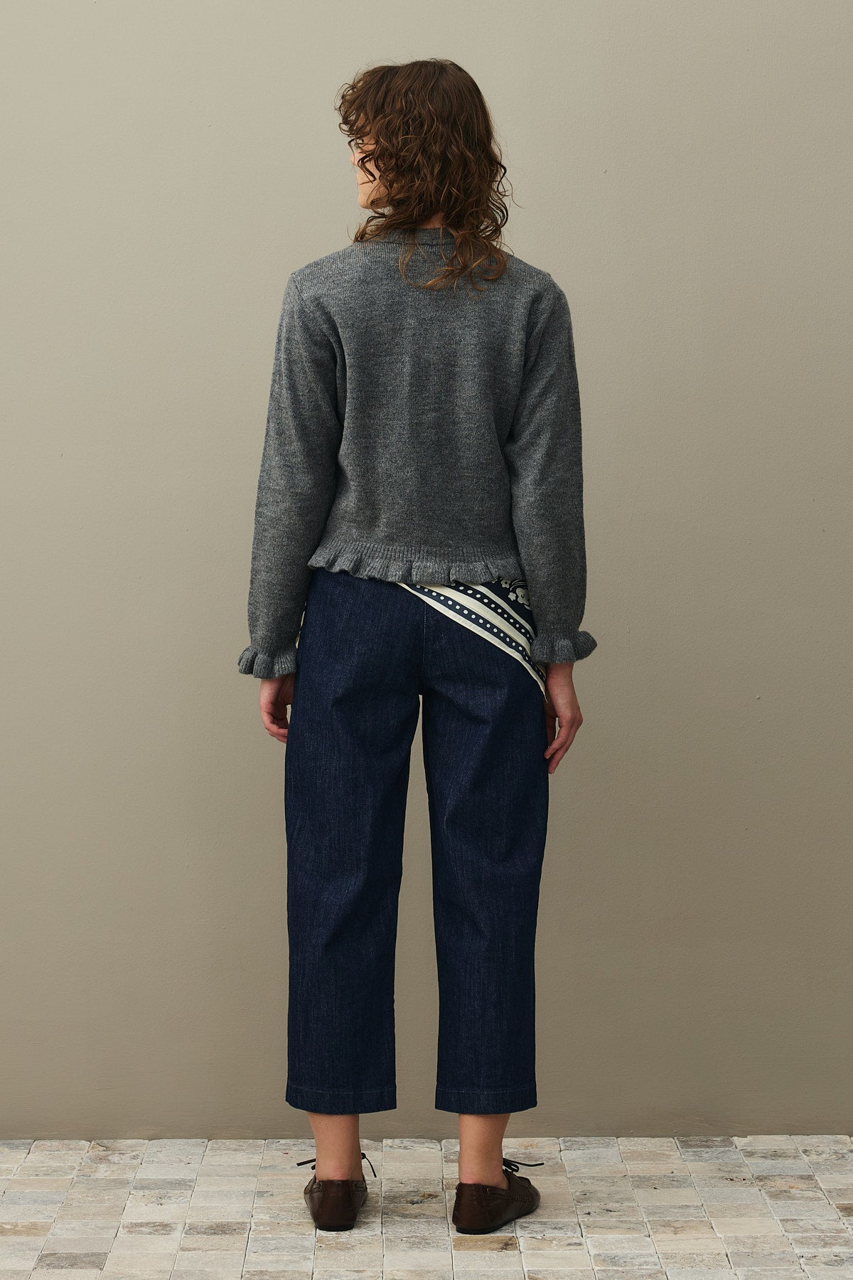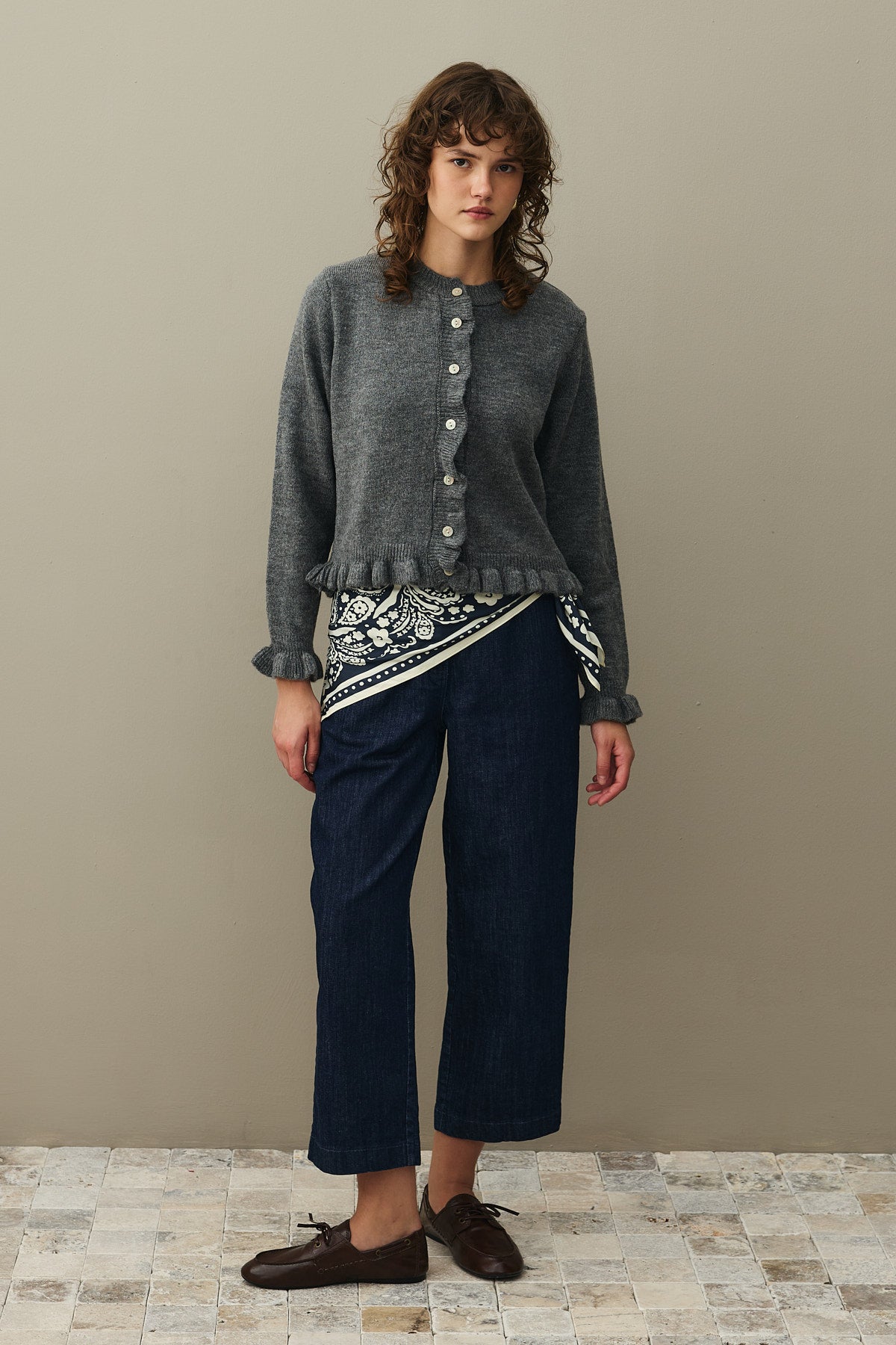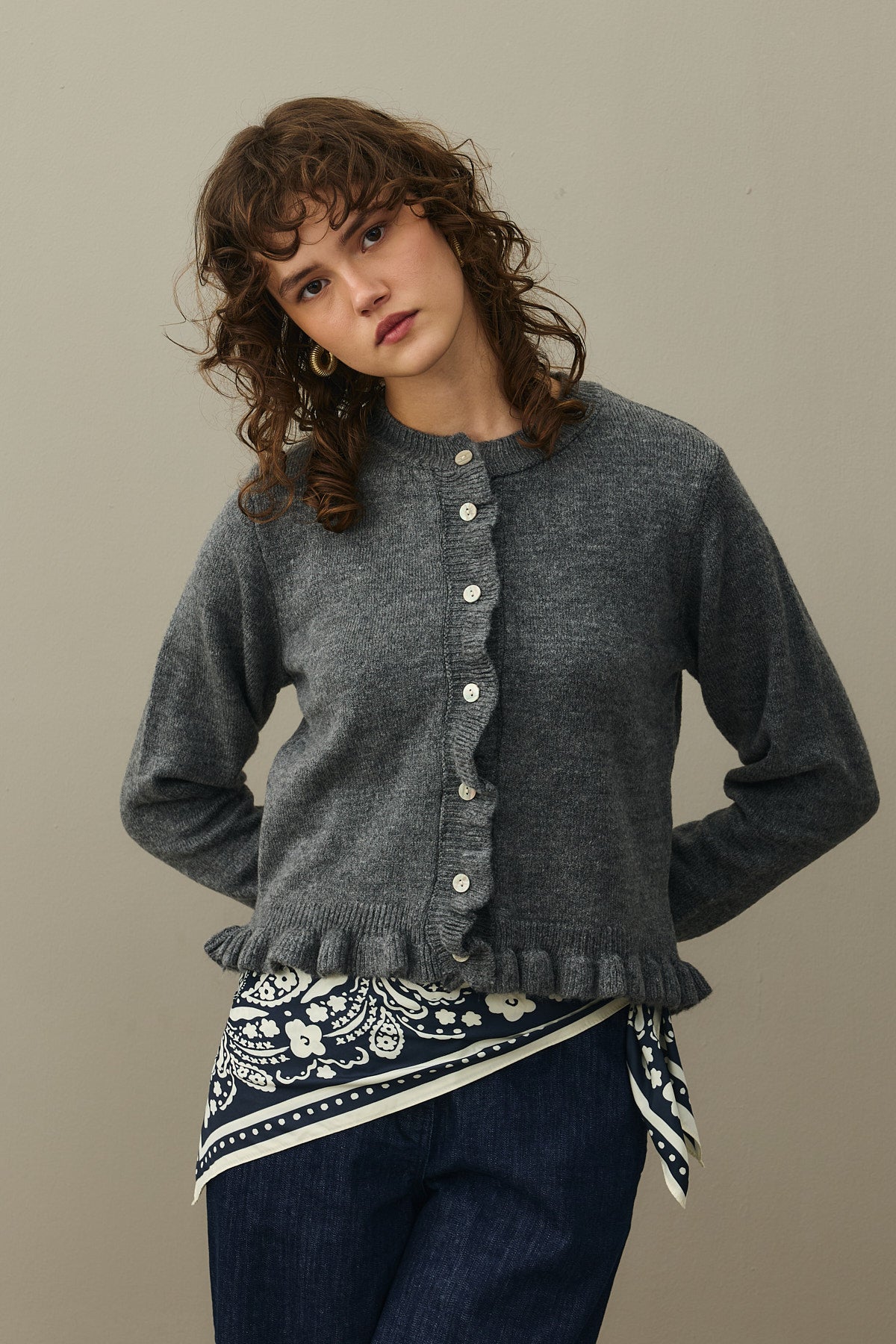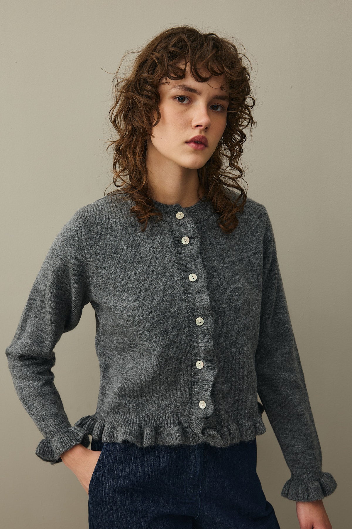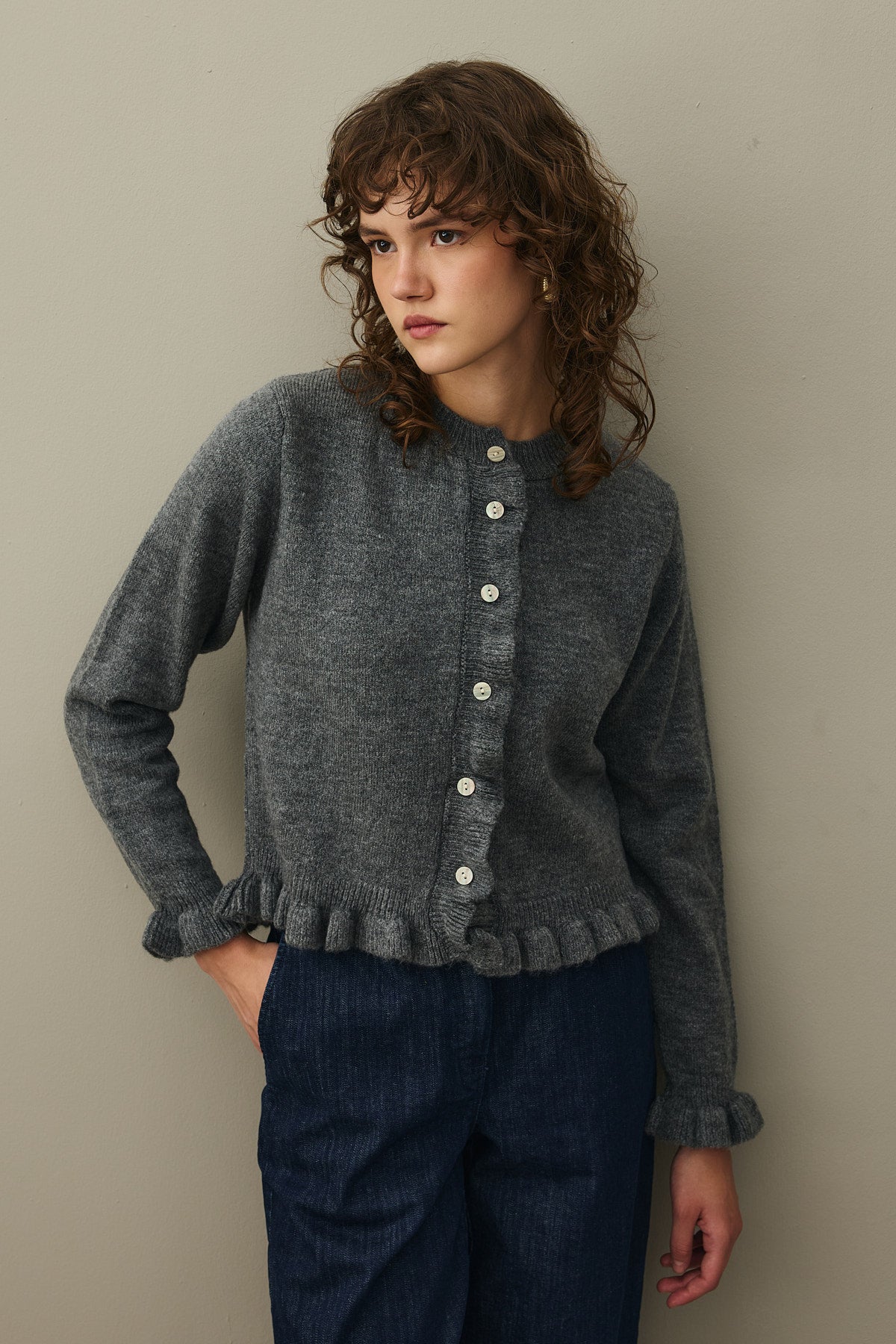 Tiftik karışımlı ipli trikodan, etek uçları ve kolağzı ince fırfır detaylı, bisiklet yakalı, önü düğme kapamalı, uzun kollu hırka