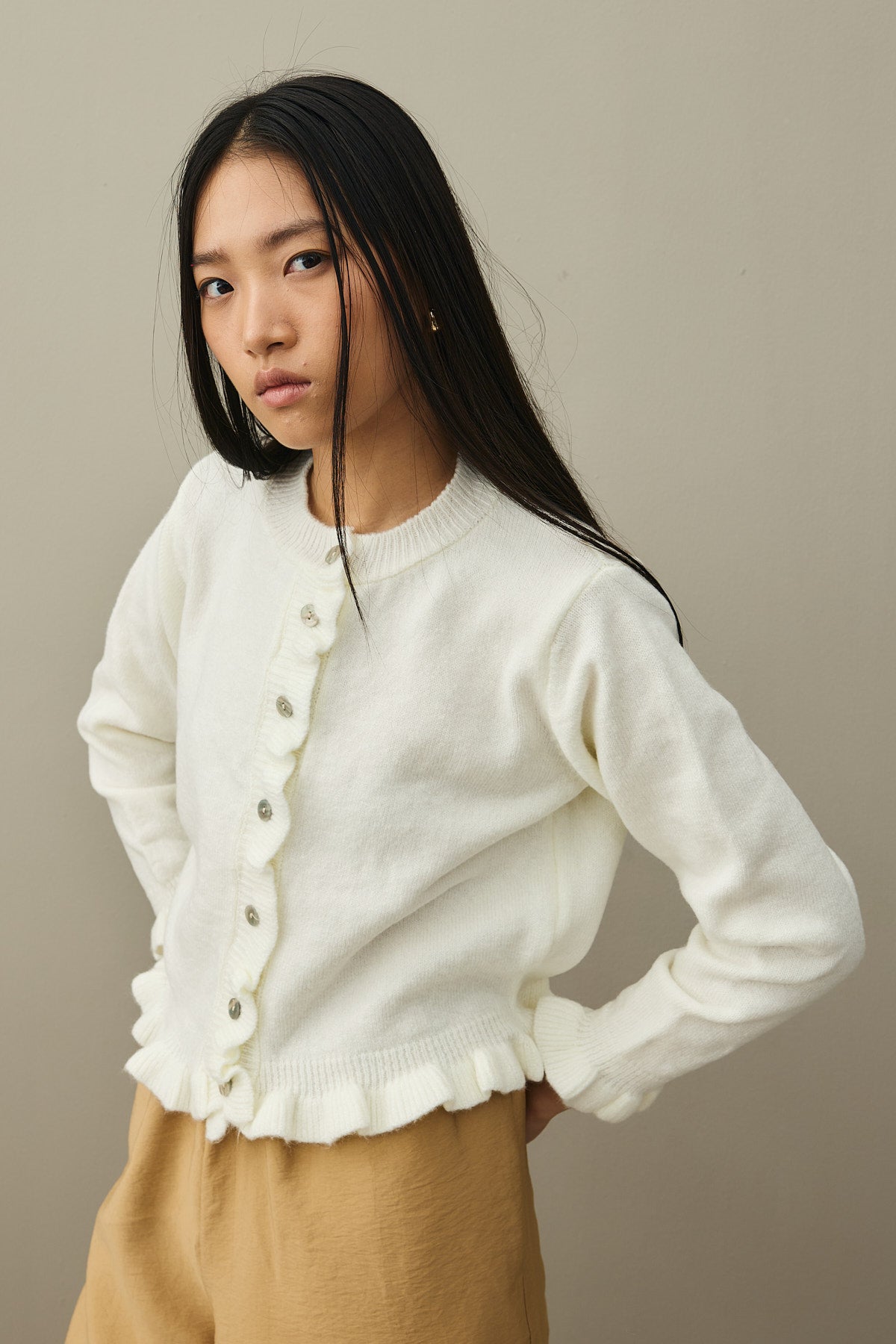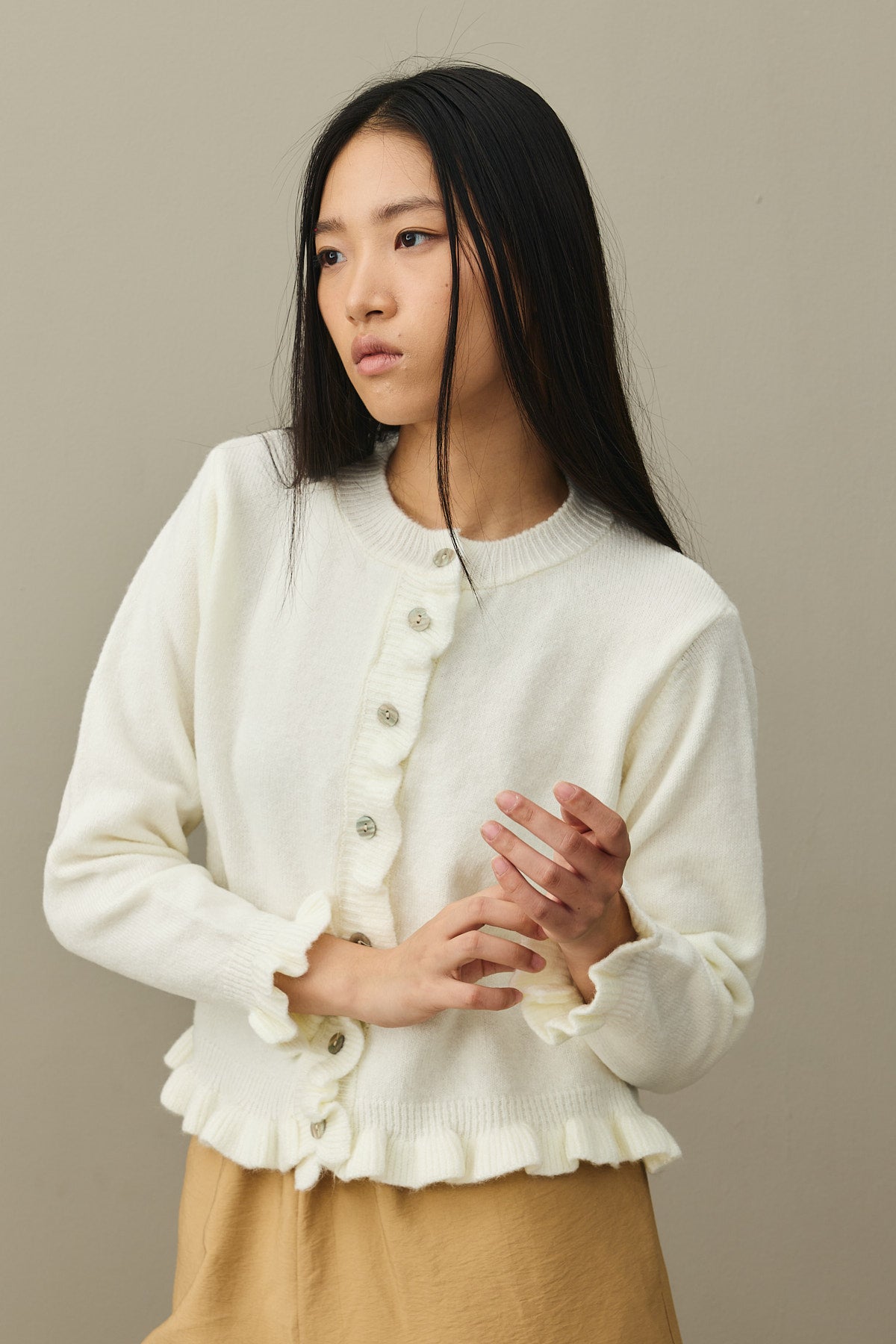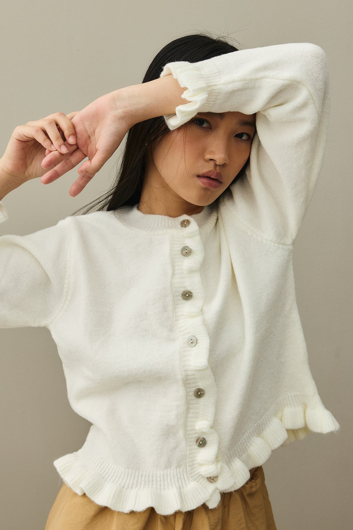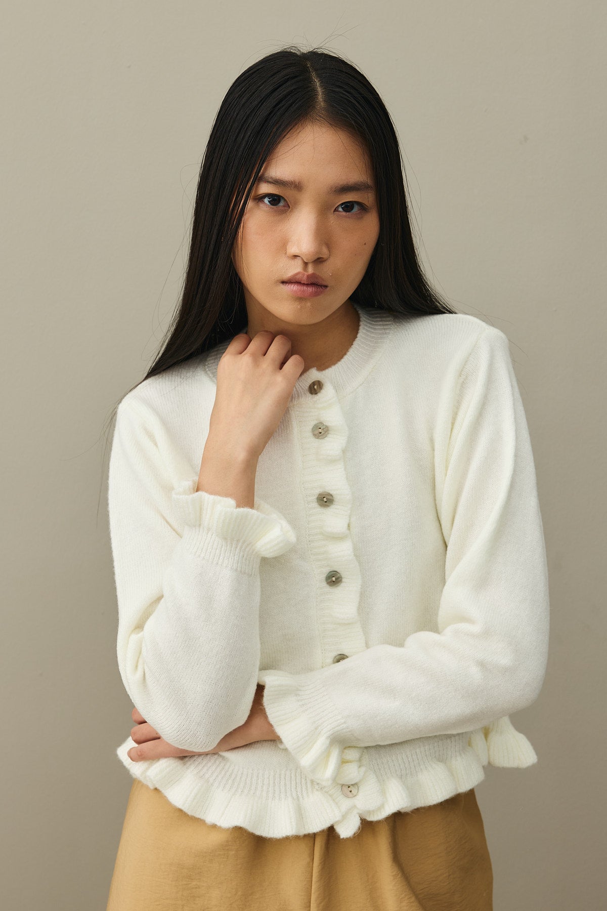Tiftik karışımlı ipli trikodan, etek uçları ve kolağzı ince fırfır detaylı, bisiklet yakalı, önü düğme kapamalı, uzun kollu hırka