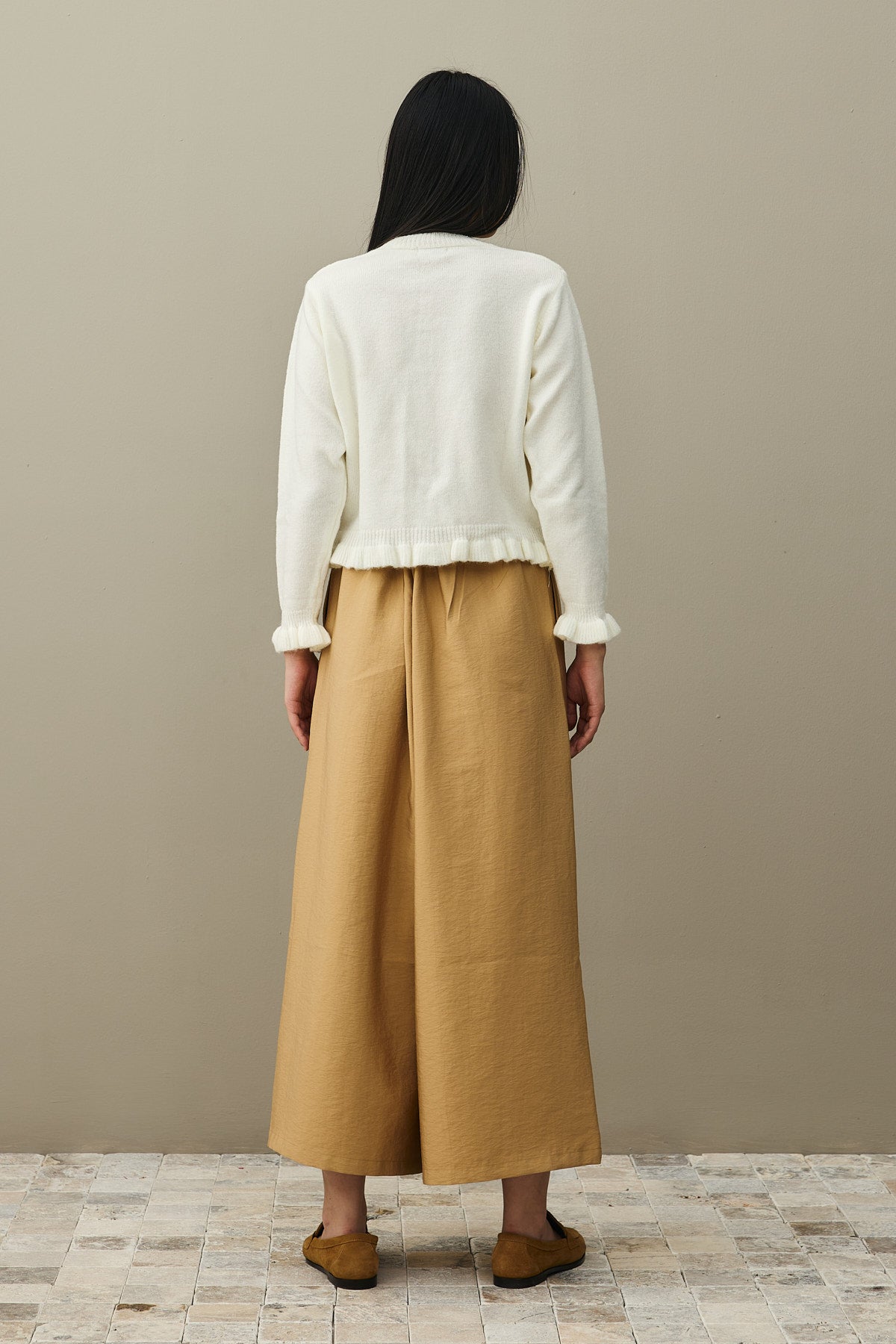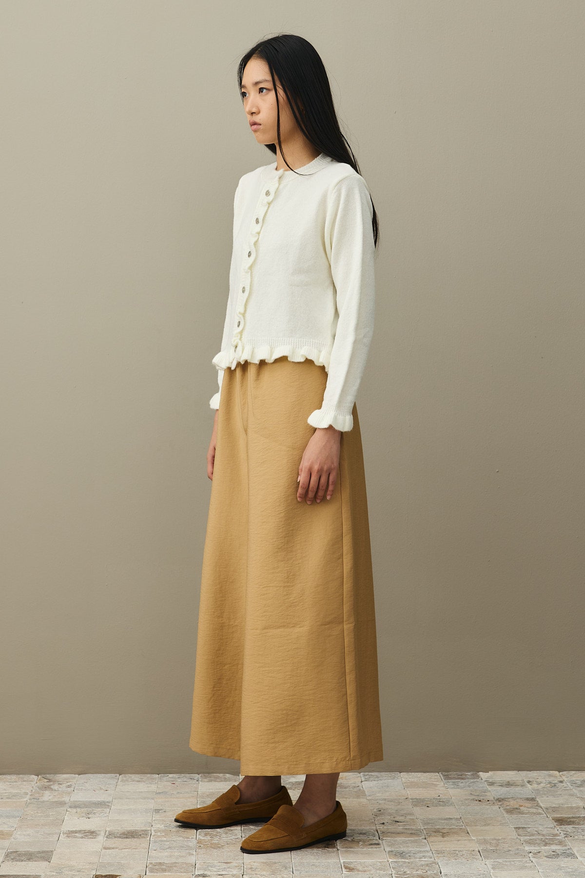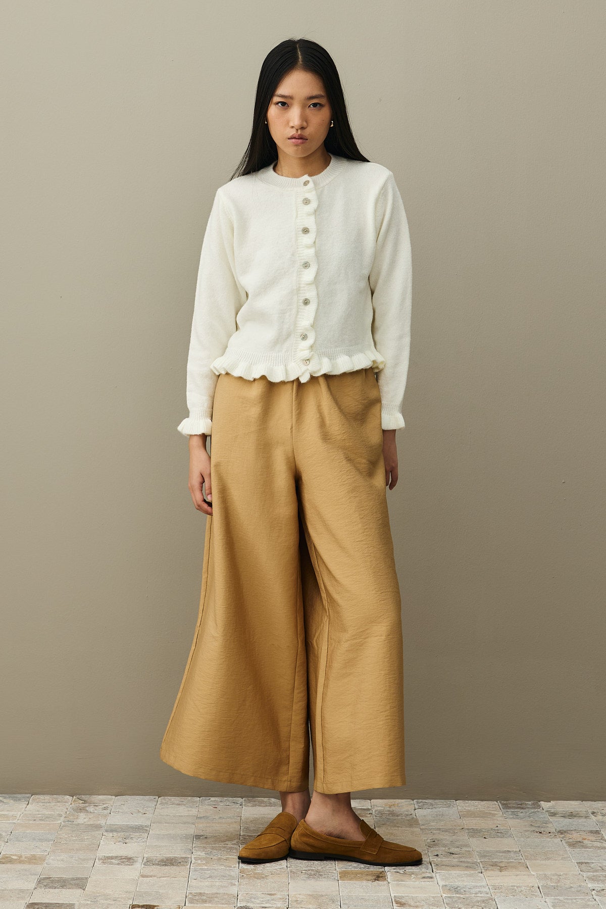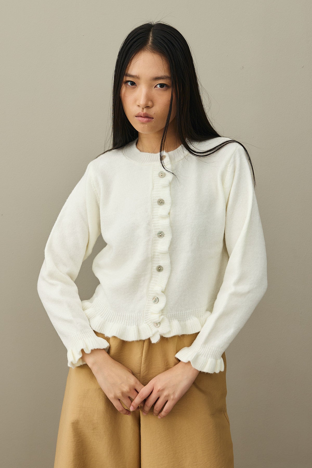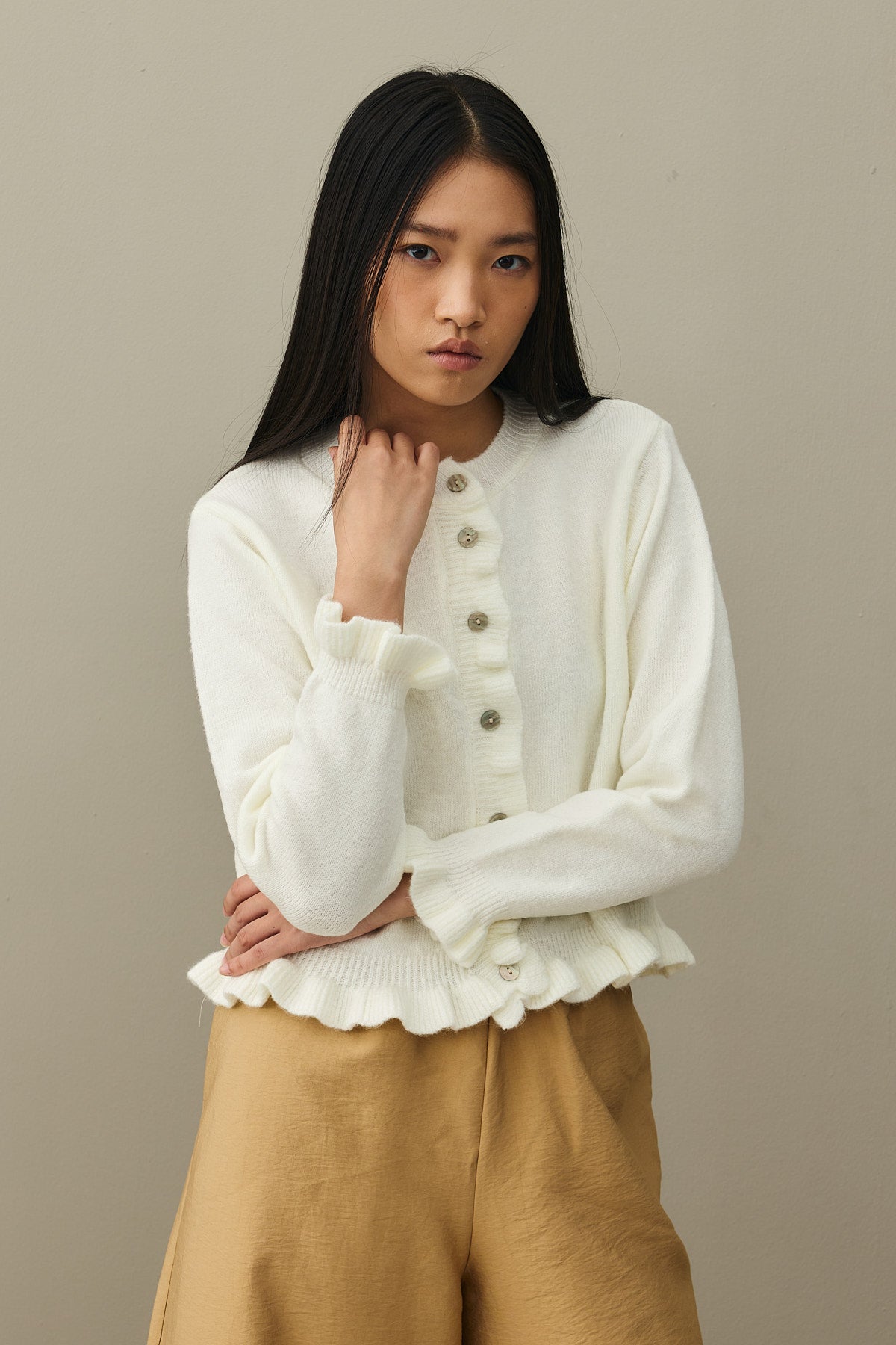 Tiftik karışımlı ipli trikodan, etek uçları ve kolağzı ince fırfır detaylı, bisiklet yakalı, önü düğme kapamalı, uzun kollu hırka