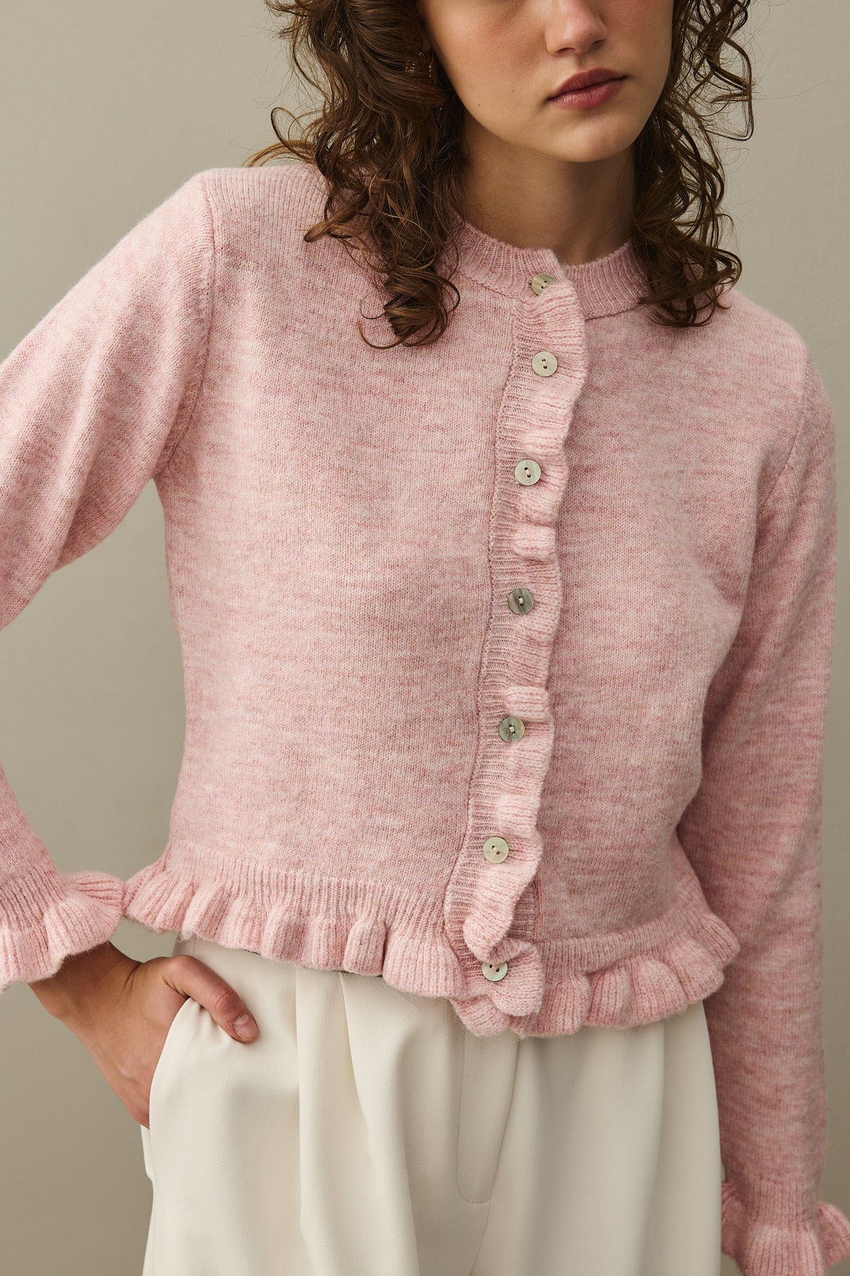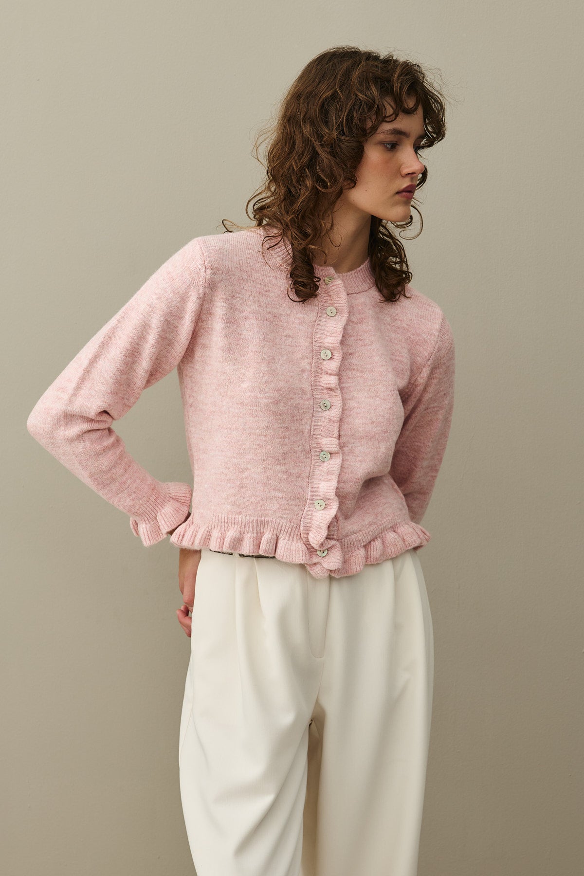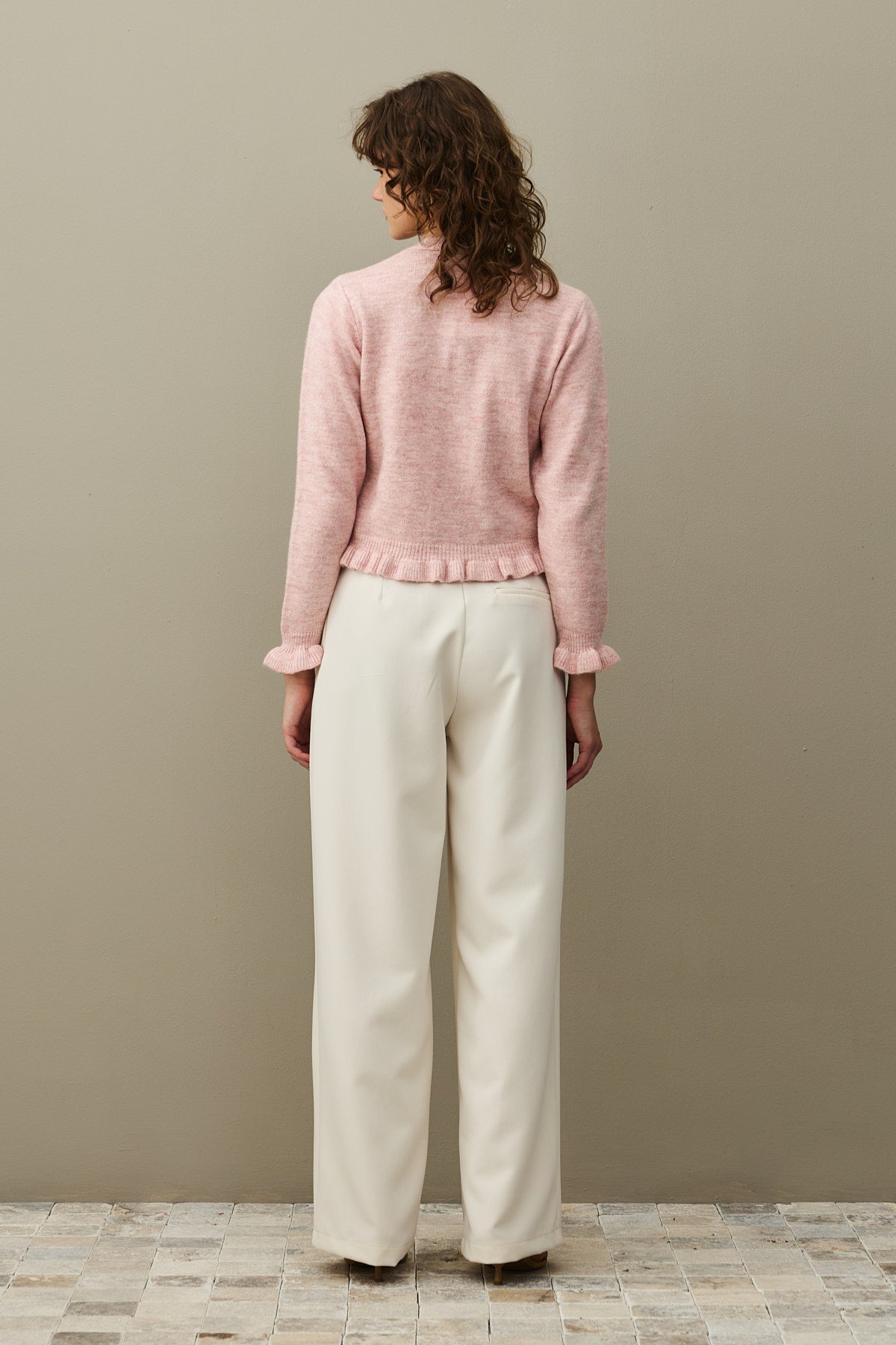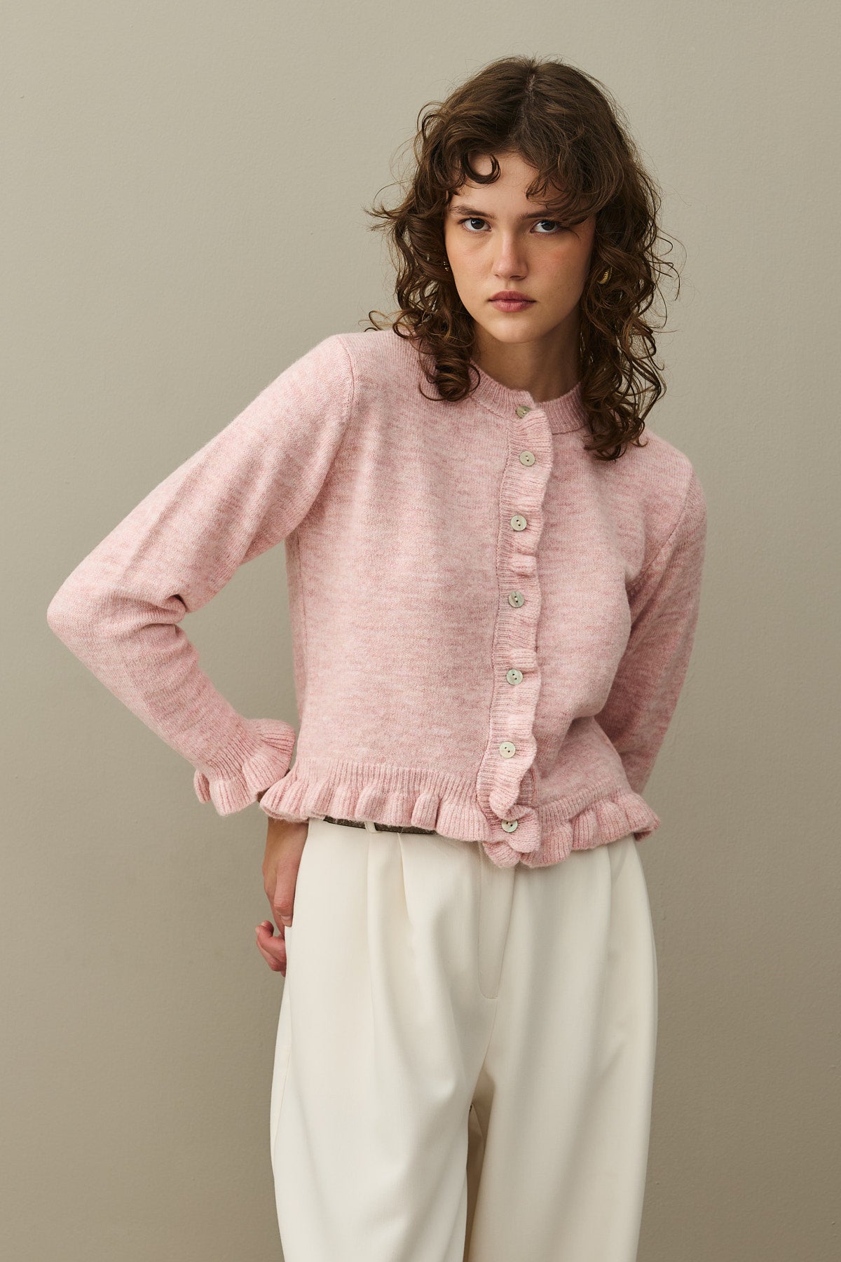 Tiftik karışımlı ipli trikodan, etek uçları ve kolağzı ince fırfır detaylı, bisiklet yakalı, önü düğme kapamalı, uzun kollu hırka
