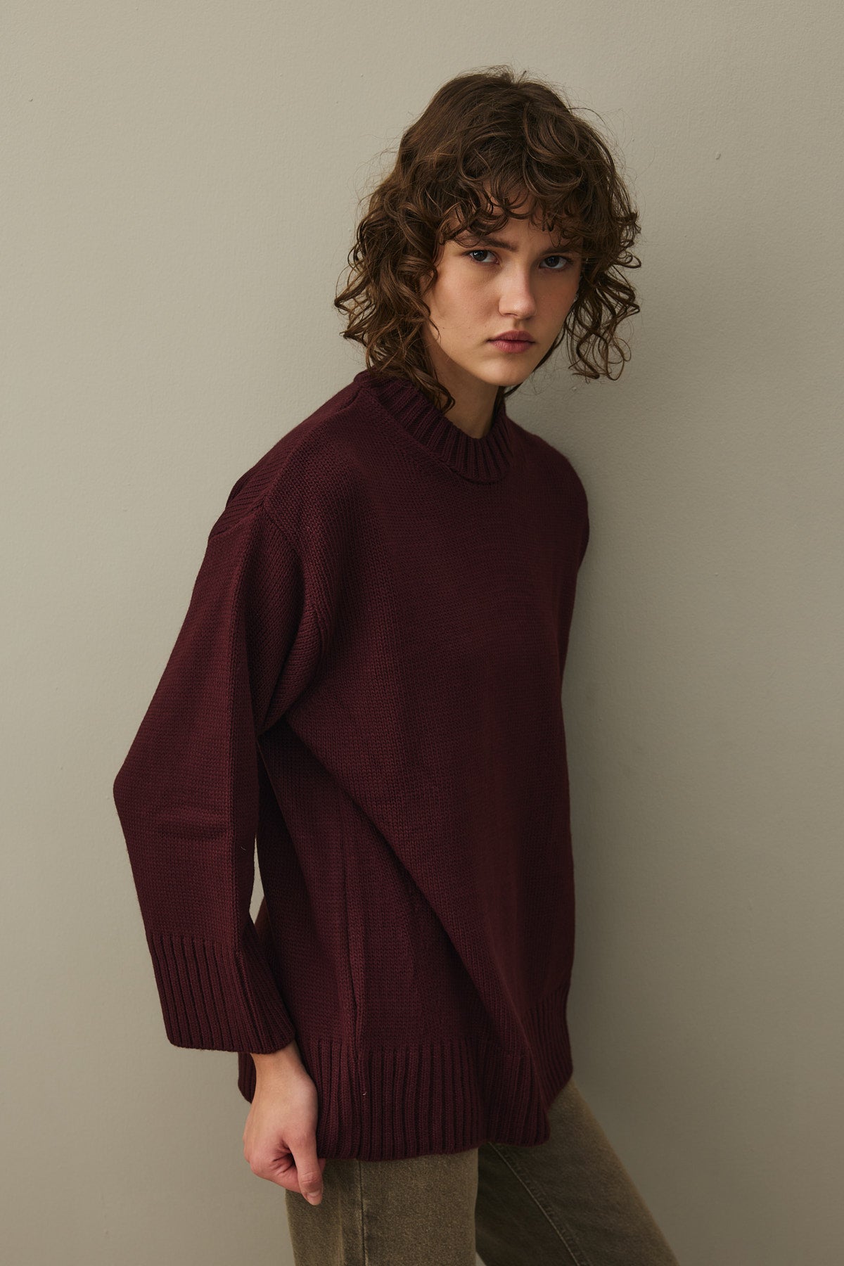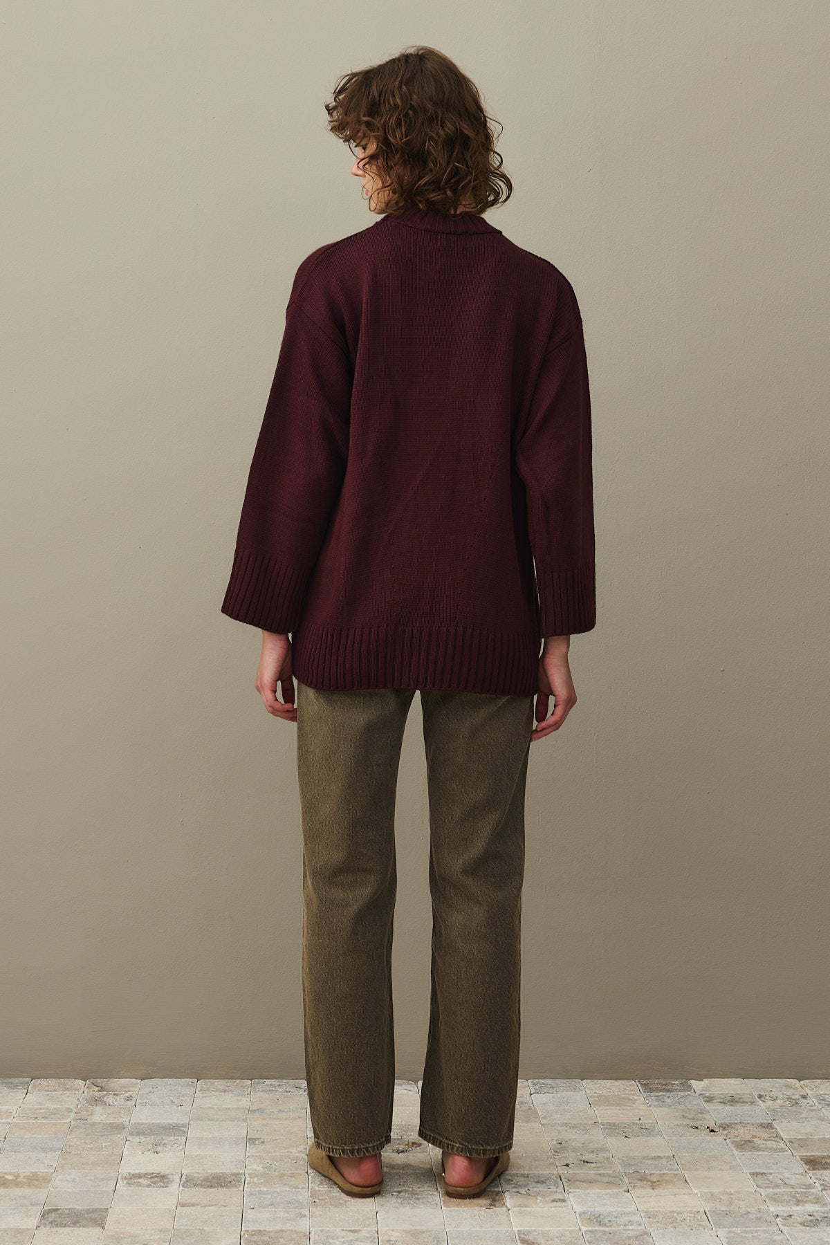 Örme trikodan, yarım balıkçı yakalı, uzun kollu, manşetleri ve etek ucu lastik örgülü, oversize kalıplı kazak STANDART BEDEN Uzunluk:70cm,Kol Uzunluğu:48cm,İki Omuz Arası Mesafe:53cm,Göğüs:58cm,Bel:58cm,Basen:53cm.