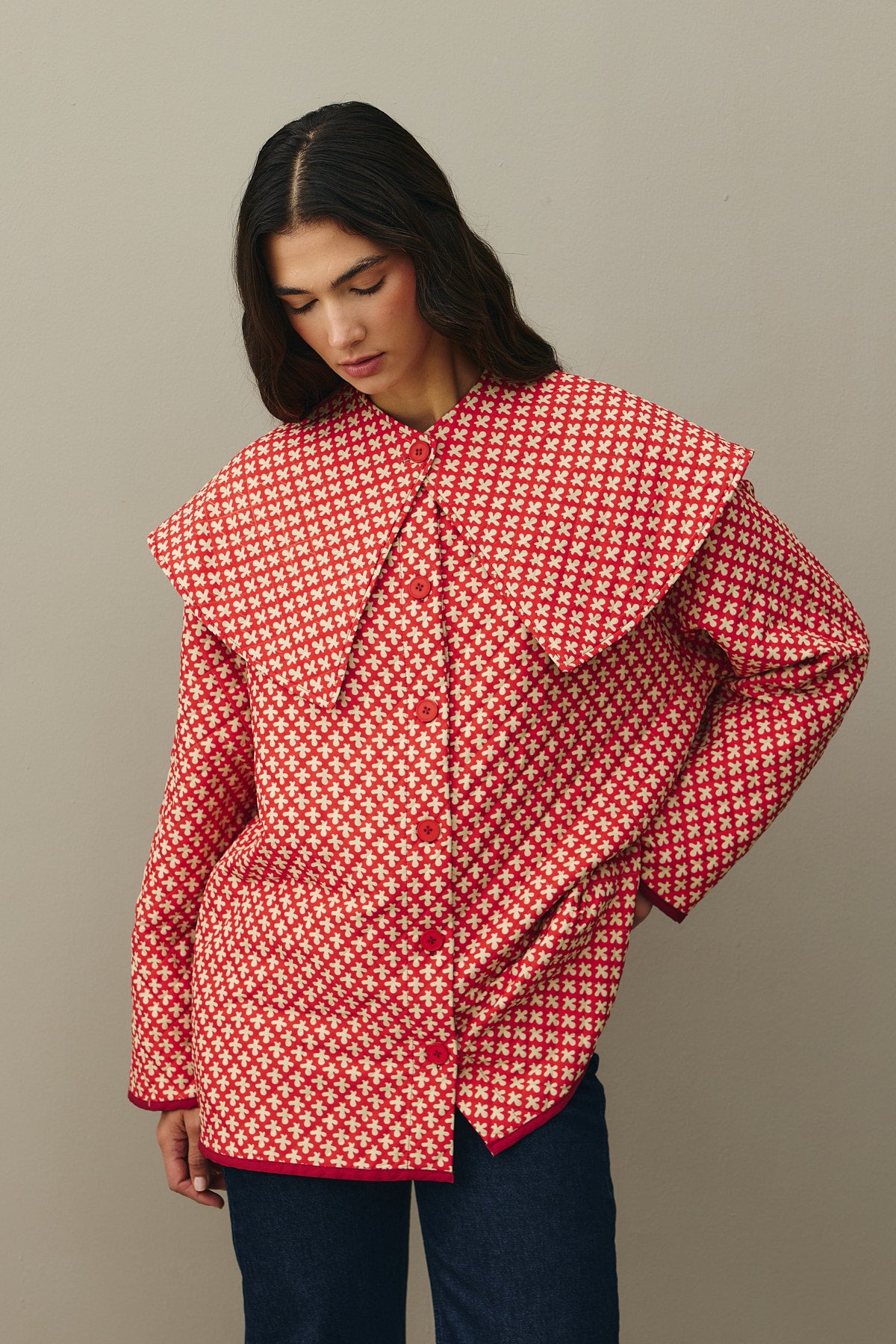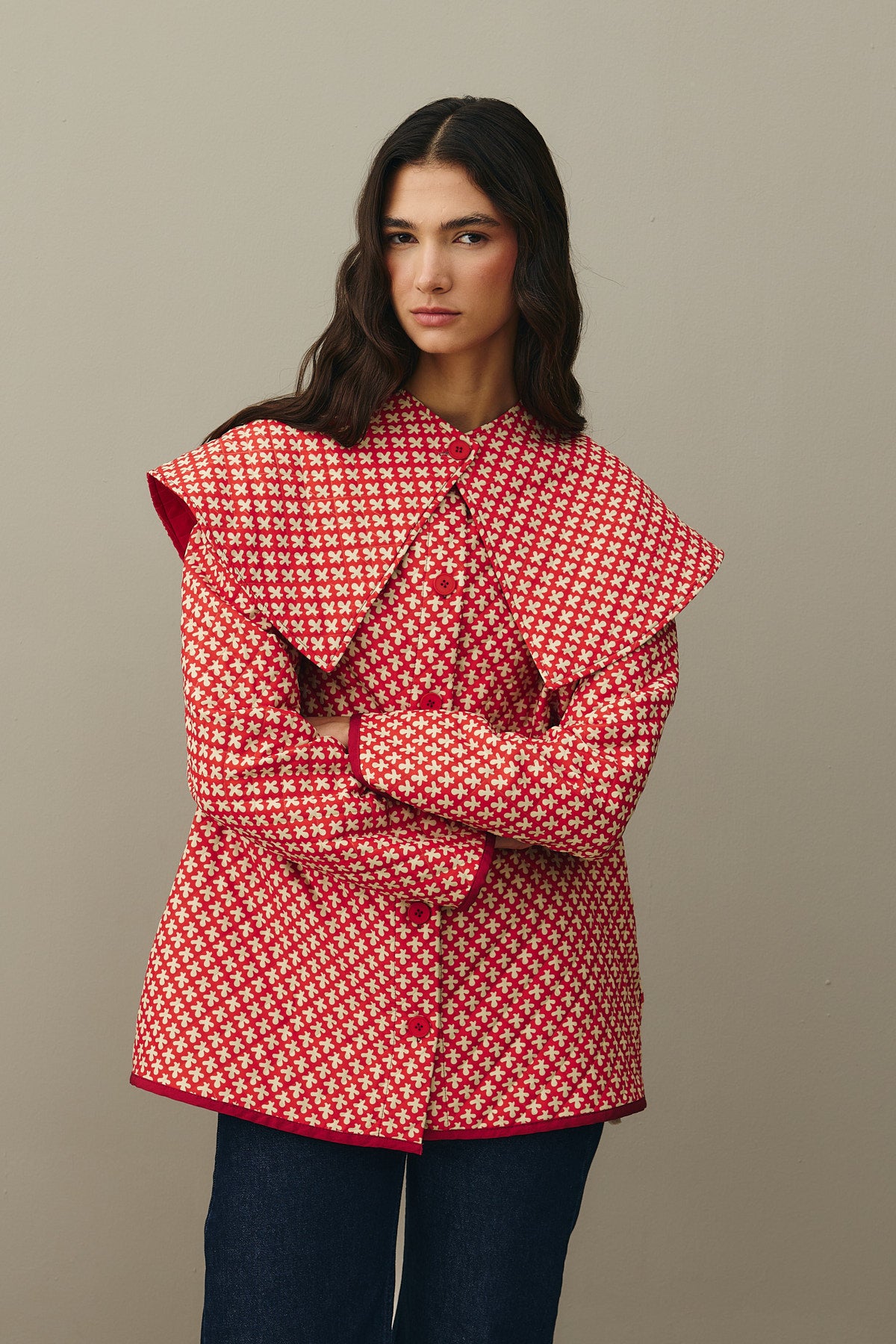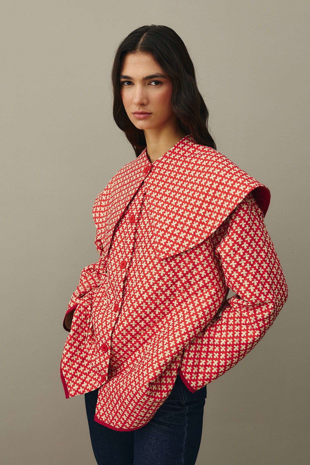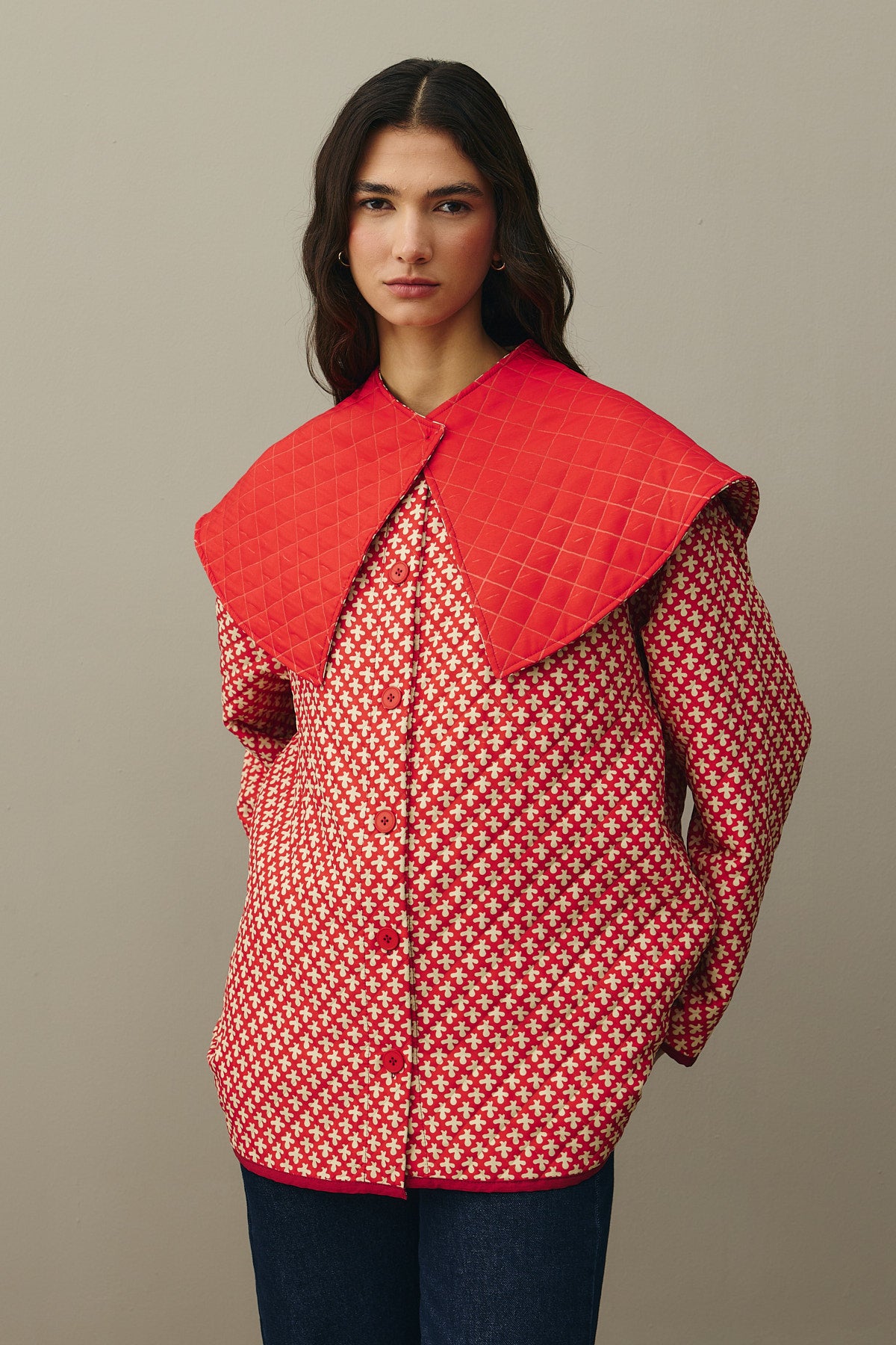 Seyyar Yakalı Desenli Kapitone Ceket Kırmızı