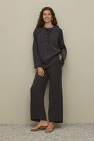 Modal dökümlü dokuma kumaştan, bisiklet yakalı, önü patlı, kuşgözlü biye kapamalı, uzun kollu, manşeti geniş patlı düğmeli üst ve beli lastikli, cepli, yanı çok nervürlü pantolon takım. 1(36-38)BEDEN ÜST Uzunluk: 71 cm, İki Omuz Arası Mesafe:42 cm, Kol Uzunluğu: 62 cm, Göğüs: 52 cm, Bel: 49 cm. PANTOLON Uzunluk: 104 cm, Bel:34 cm , Basen: 37 cm. 2(40-42)BEDEN ÜST Uzunluk: 72 cm, İki Omuz Arası Mesafe:44 cm, Kol Uzunluğu: 64 cm, Göğüs: 55 cm, Bel: 52 cm. PANTOLON Uzunluk: 105 cm, Bel:37 cm , Basen: 41 cm.