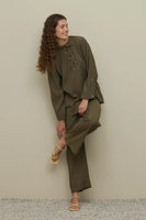 Modal dökümlü dokuma kumaştan, bisiklet yakalı, önü patlı, kuşgözlü biye kapamalı, uzun kollu, manşeti geniş patlı düğmeli üst ve beli lastikli, cepli, yanı çok nervürlü pantolon takım. 1(36-38)BEDEN ÜST Uzunluk: 71 cm, İki Omuz Arası Mesafe:42 cm, Kol Uzunluğu: 62 cm, Göğüs: 52 cm, Bel: 49 cm. PANTOLON Uzunluk: 104 cm, Bel:34 cm , Basen: 37 cm. 2(40-42)BEDEN ÜST Uzunluk: 72 cm, İki Omuz Arası Mesafe:44 cm, Kol Uzunluğu: 64 cm, Göğüs: 55 cm, Bel: 52 cm. PANTOLON Uzunluk: 105 cm, Bel:37 cm , Basen: 41 cm.