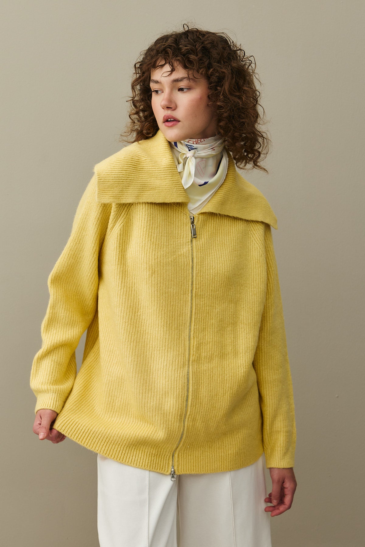Tiftik karışımlı ipli trikodan, geniş yakalı, çift elcikli fermuar kapamalı triko hırka