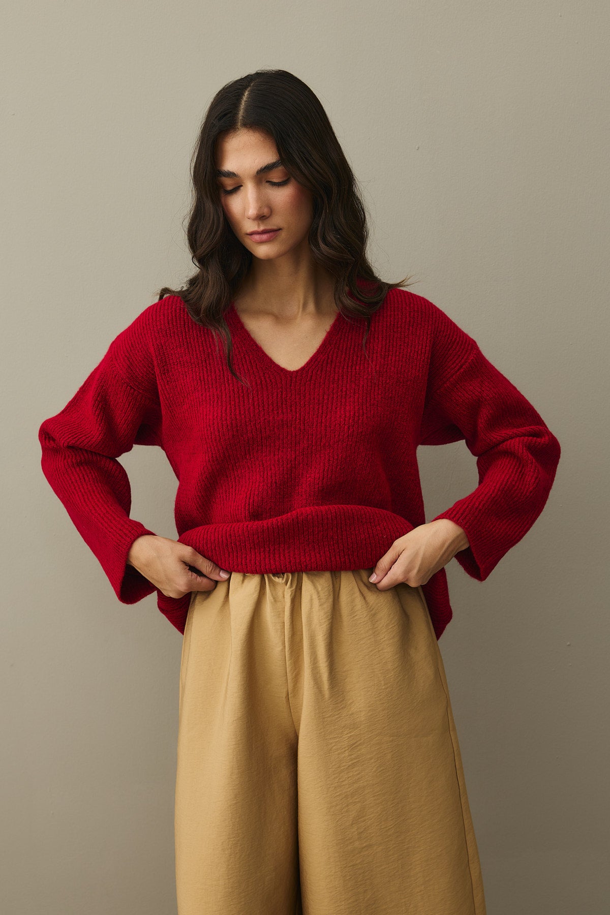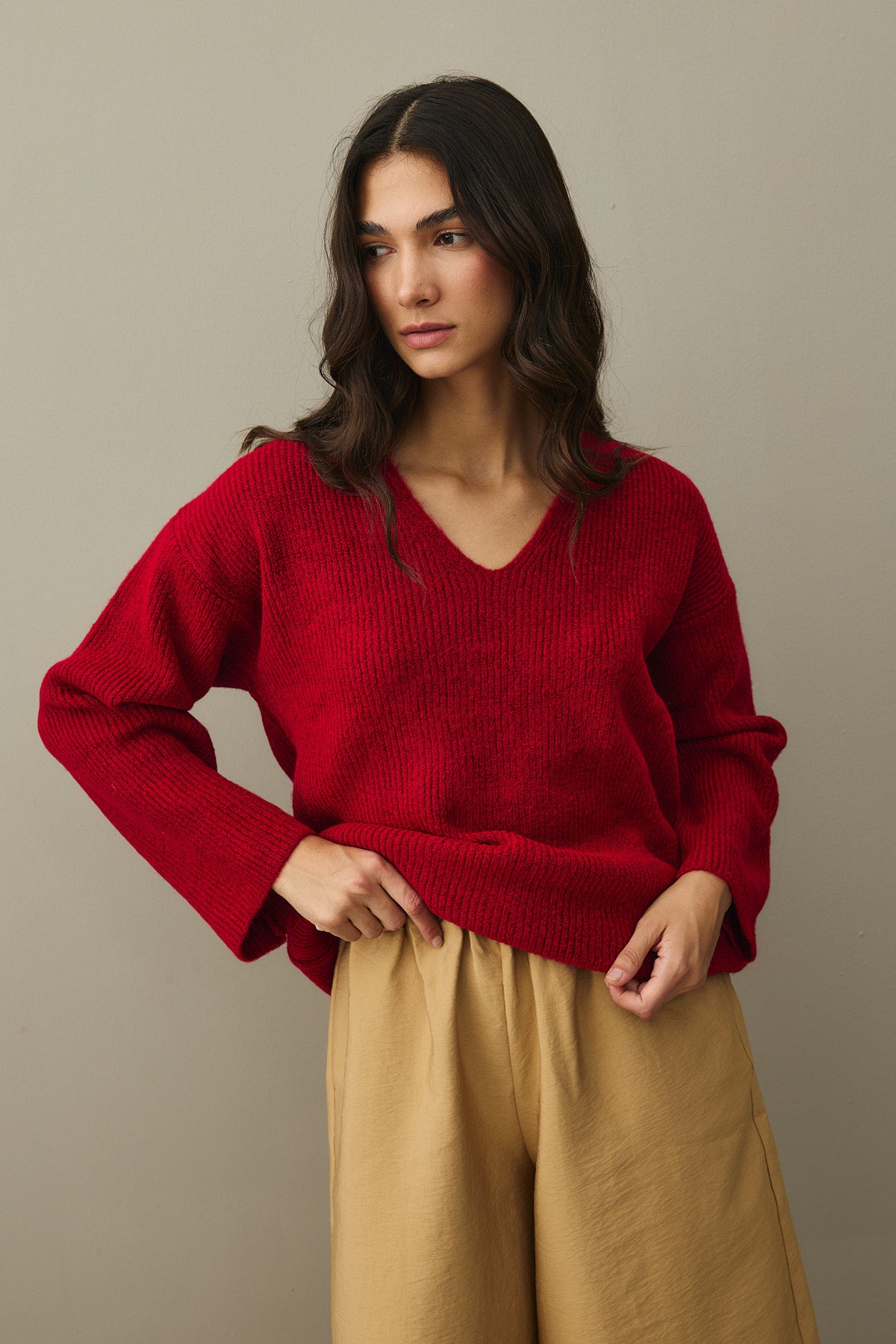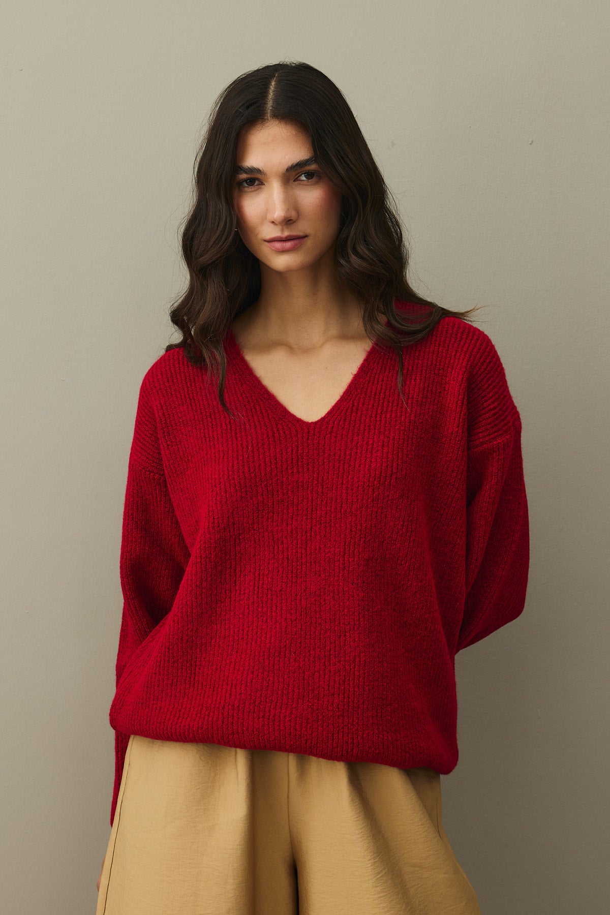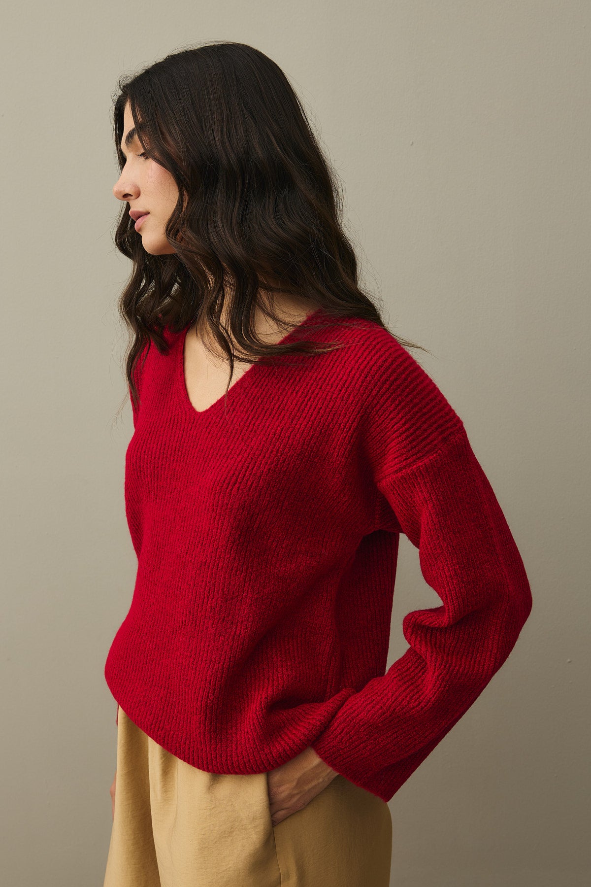 V Yaka Basic Triko Kazak Kırmızı