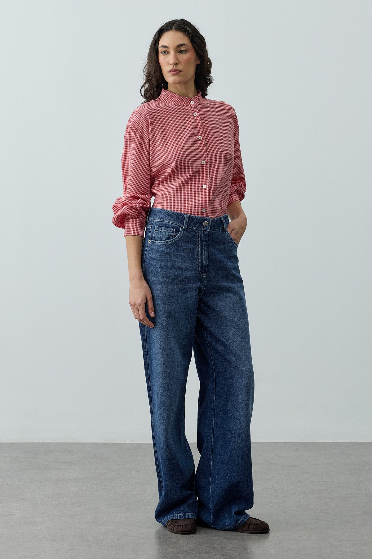 Denim dokuma kumaştan, yüksek belli, beş cepli jean. Ekstra uzun, geniş paça. Fermuarlı ve metal düğmeli ön kapama.