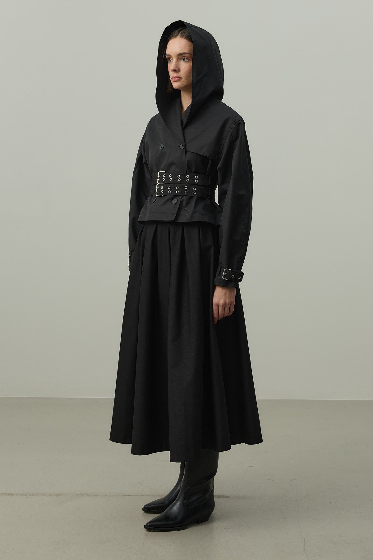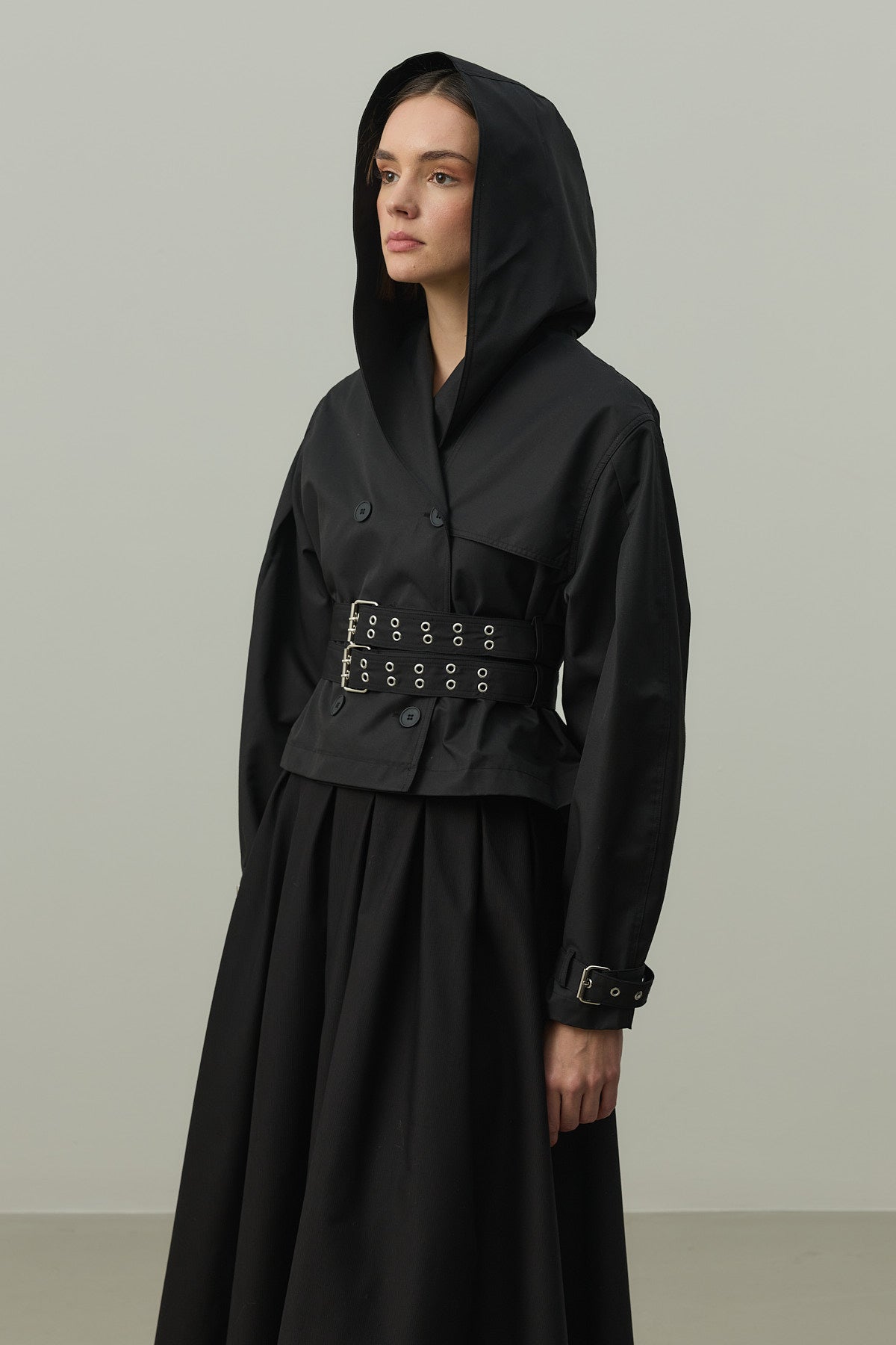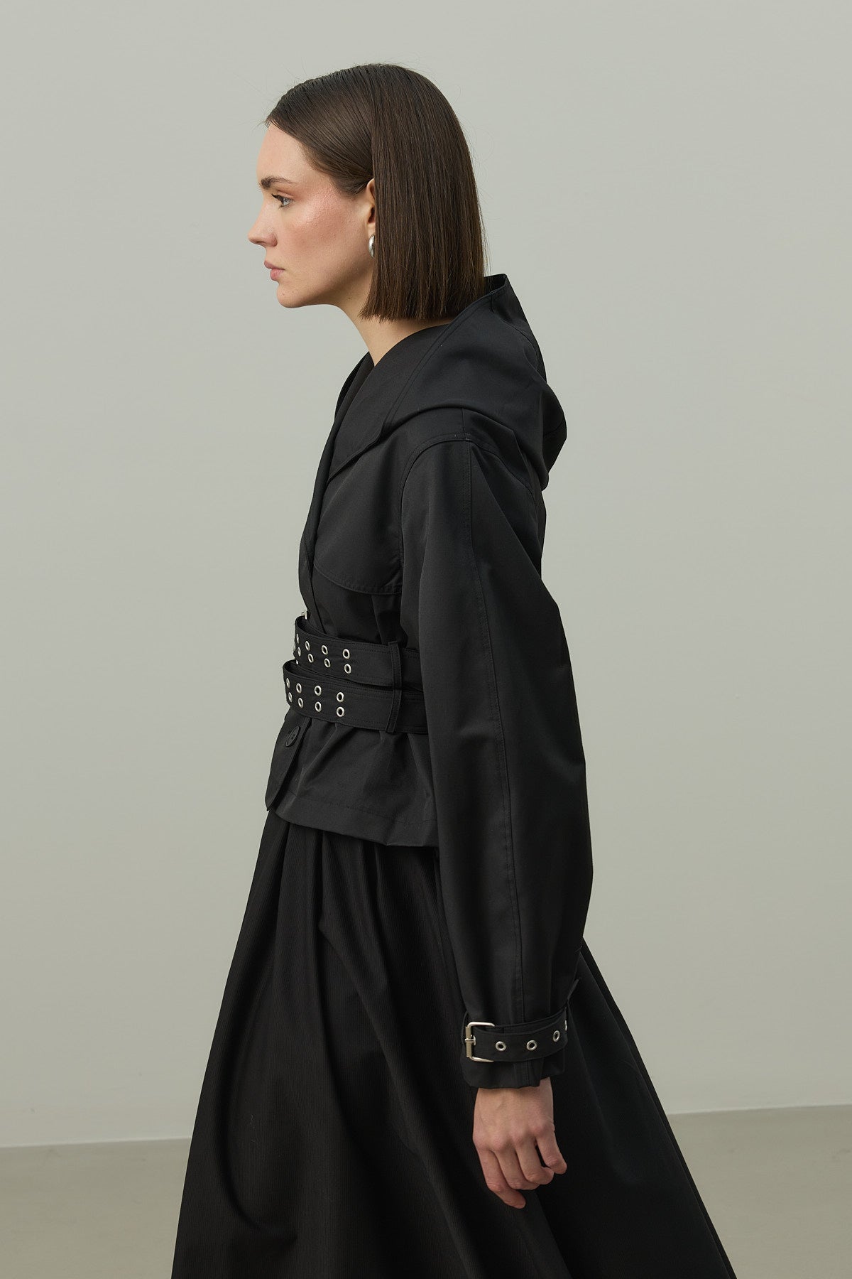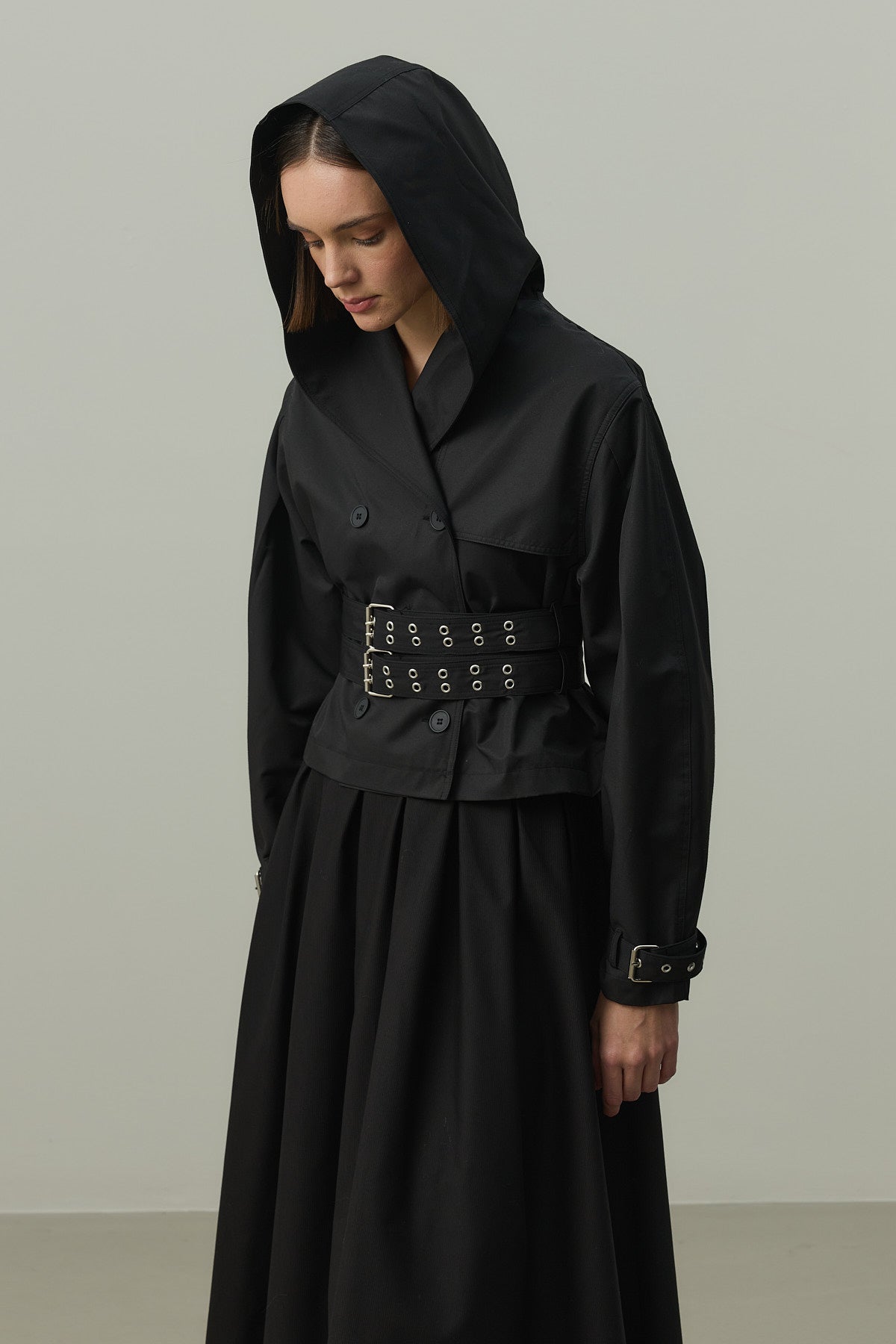 Kapüşonlu Kemerli Trenç Ceket Siyah